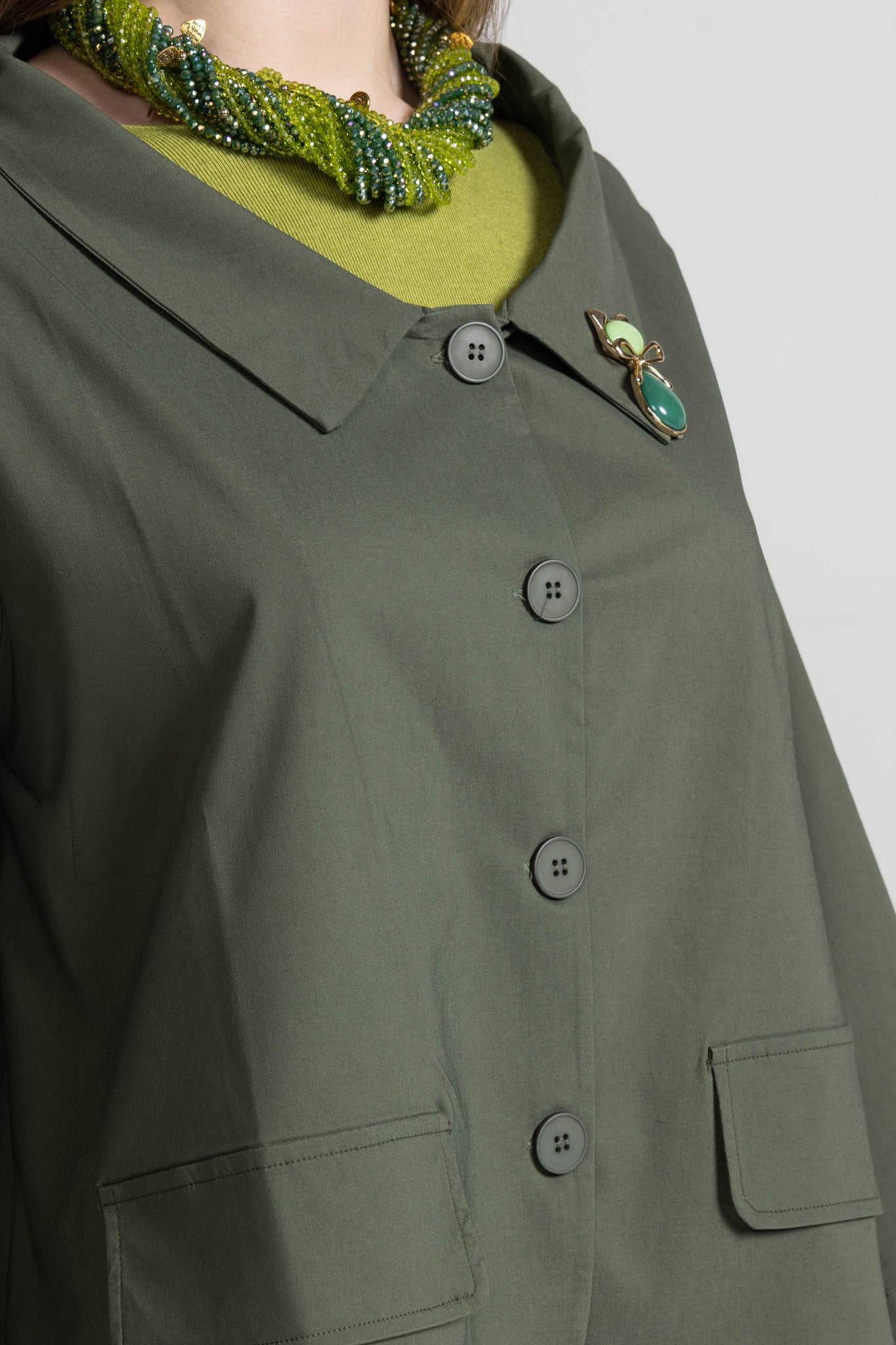 Short, boxy, slightly asymmetrical jacket in viscose fabric, shirt collar, long sleeves, front button closure, two patch pockets with flaps. Comfortable fit.