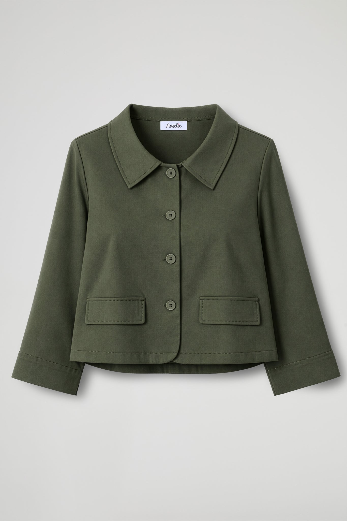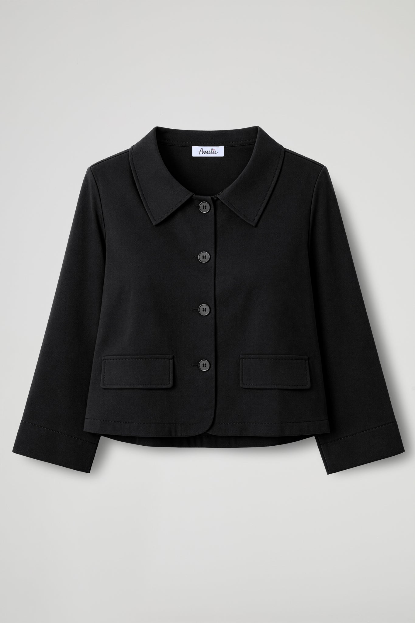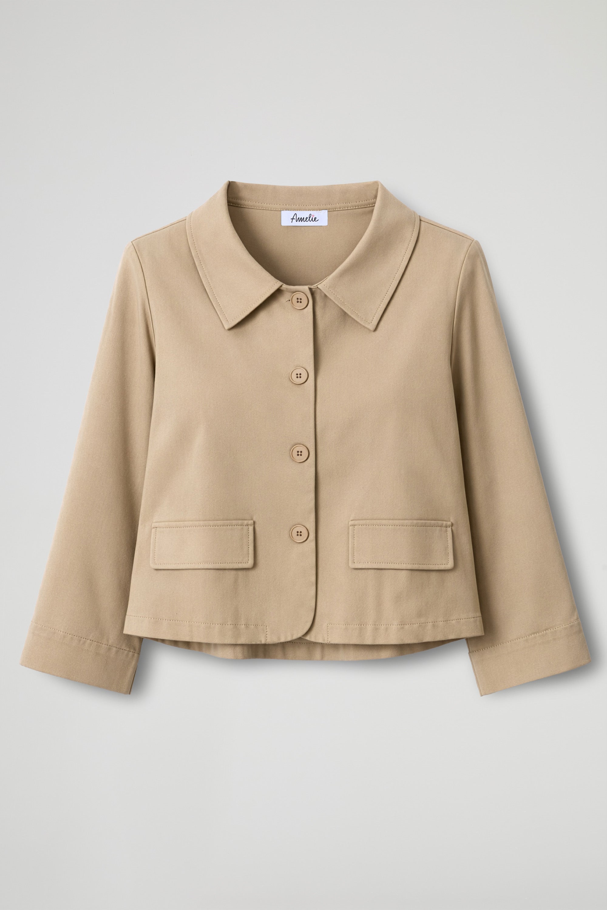 A short jacket with a clean, boxy fit, designed to add structure to your look without weighing you down. The shirt collar and front button closure make it simple yet incredibly versatile: perfect with high-waisted trousers, denim, or dresses, from day to night.