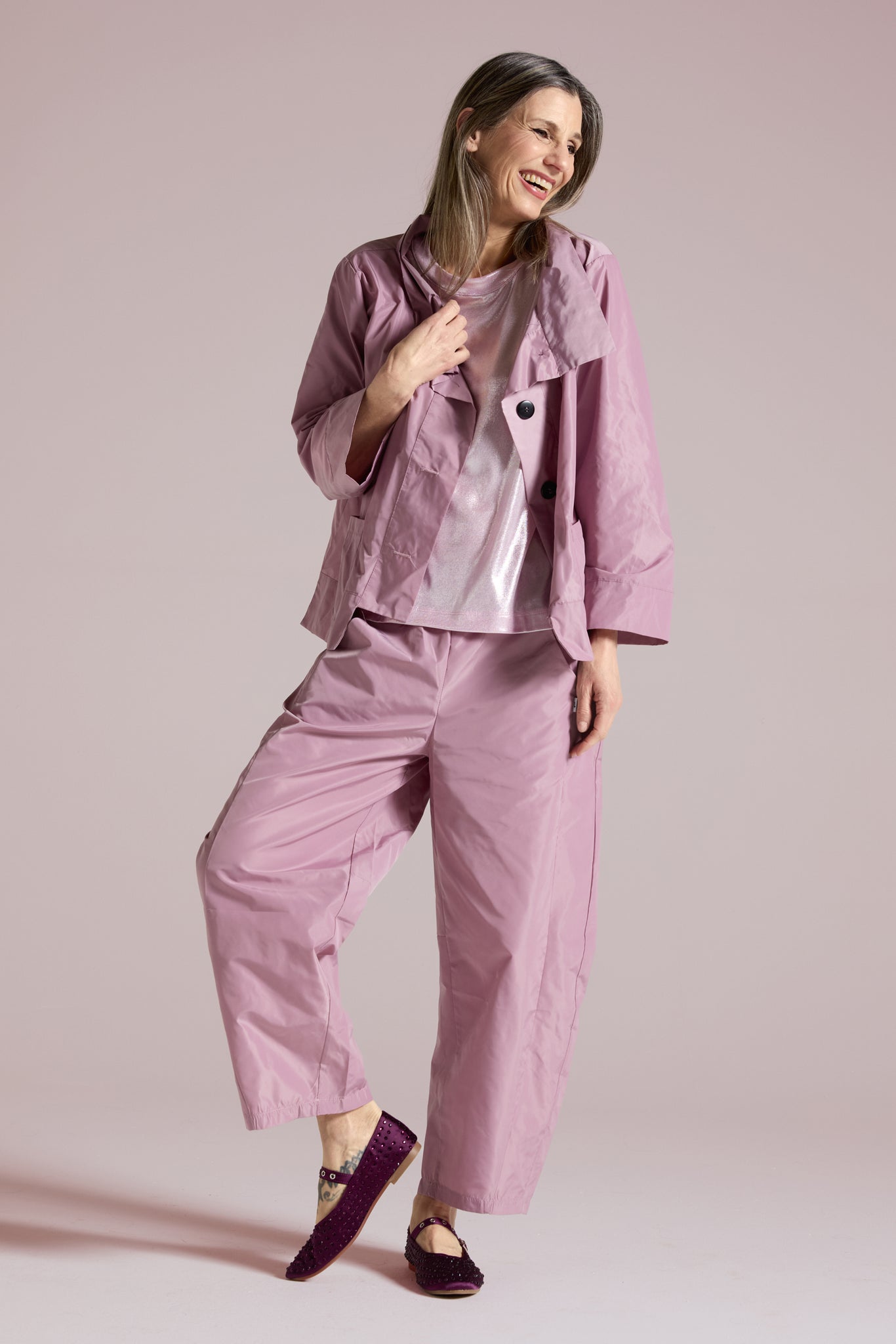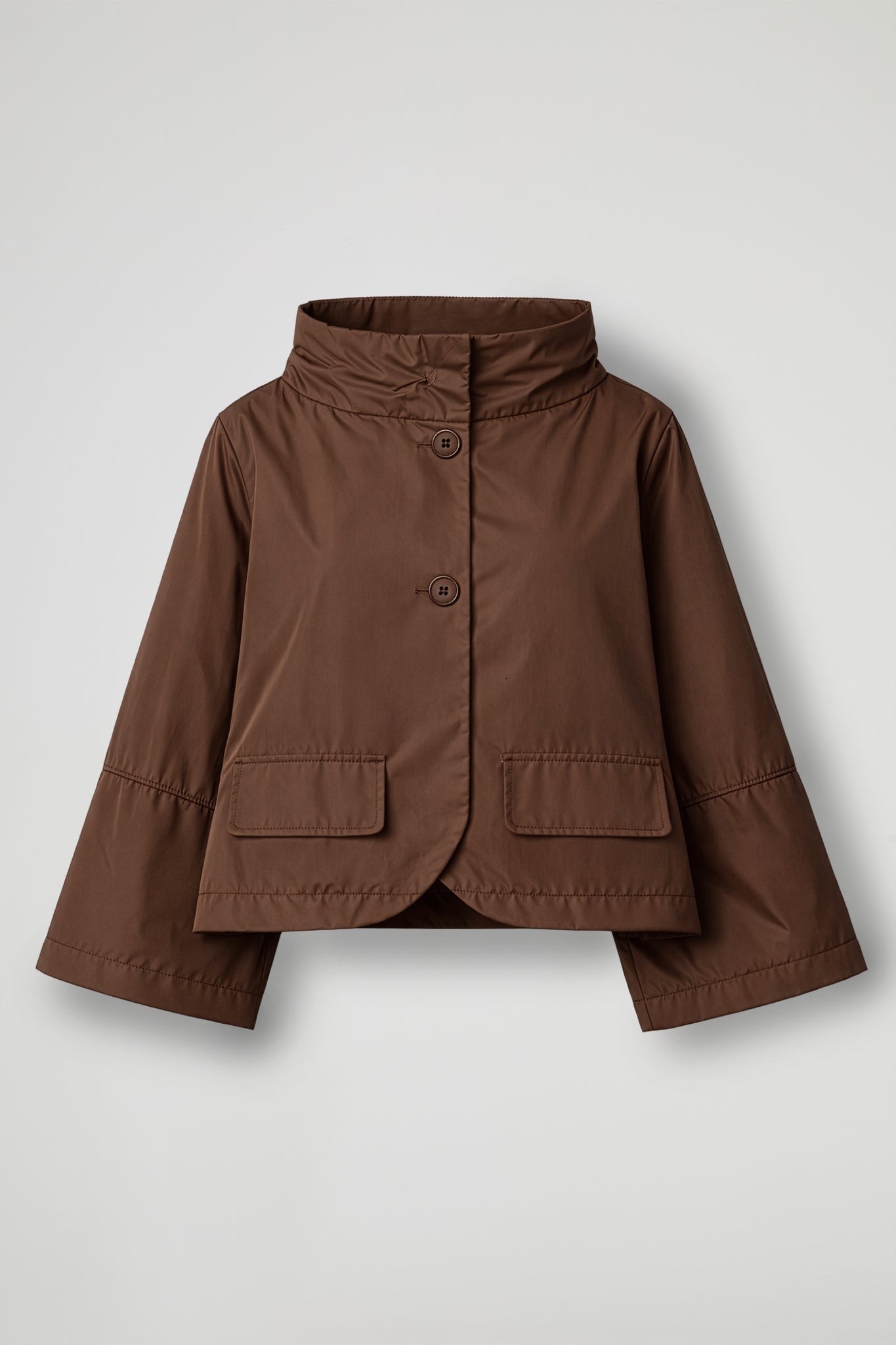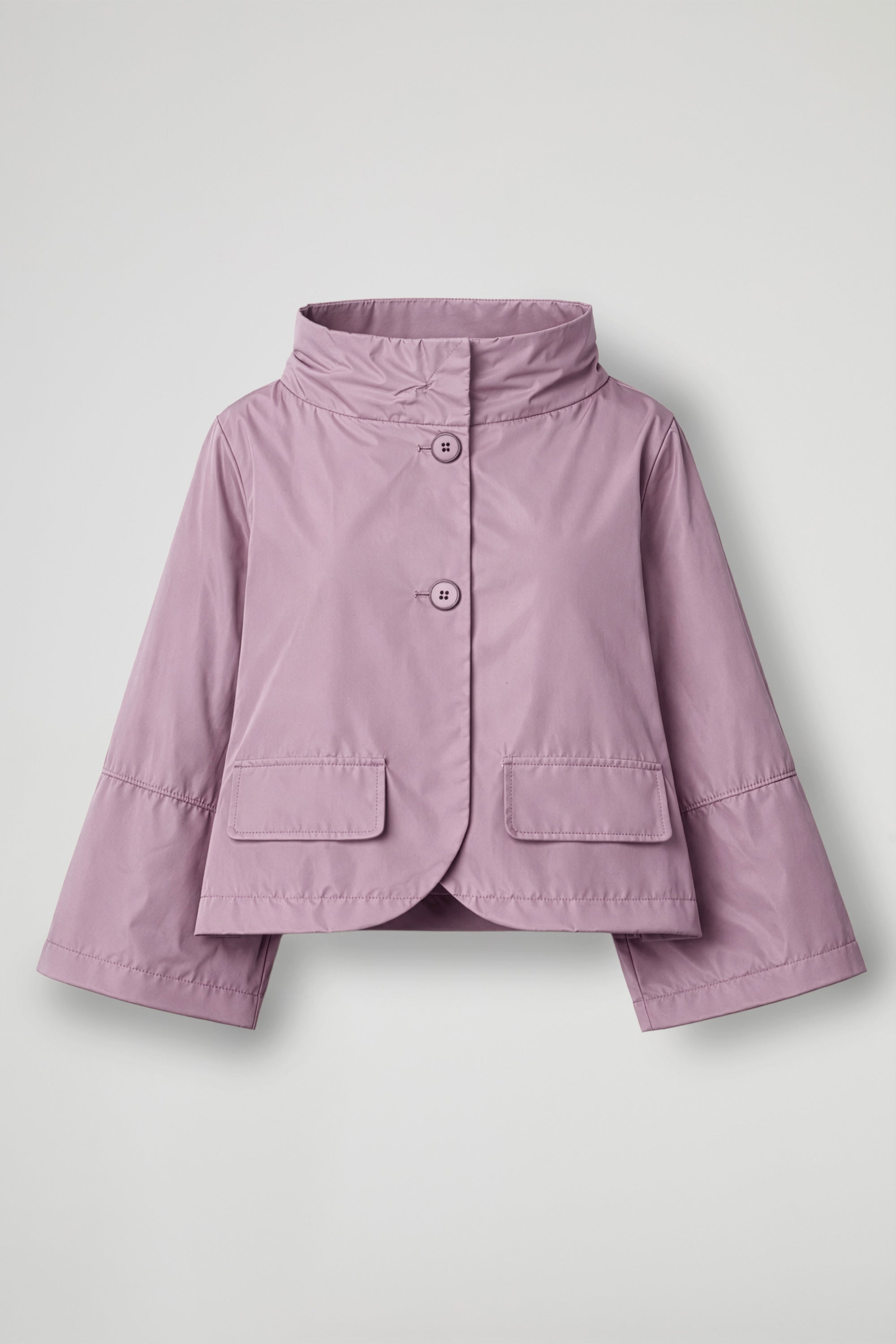 Giacca corta in tessuto tecnico effetto nacré, pensata per un look contemporaneo e funzionale. Il design pulito è valorizzato dal collo alto strutturato e dalla chiusura frontale con bottoni, che garantisce protezione e praticità. La linea è boxy e leggermente svasata, con maniche ampie dal taglio moderno e profili con impunture decorative. Completano il capo tasche applicate con patta sul davanti, perfette per un tocco utility raffinato.