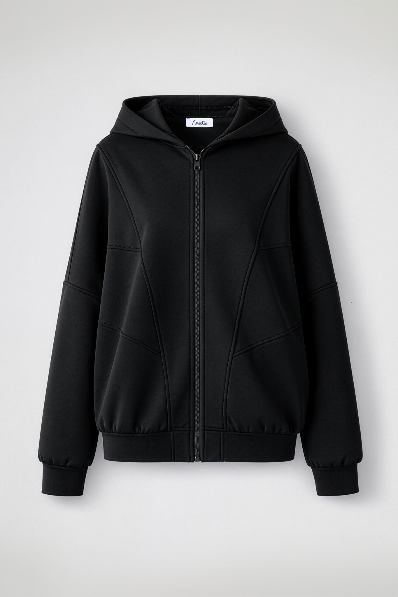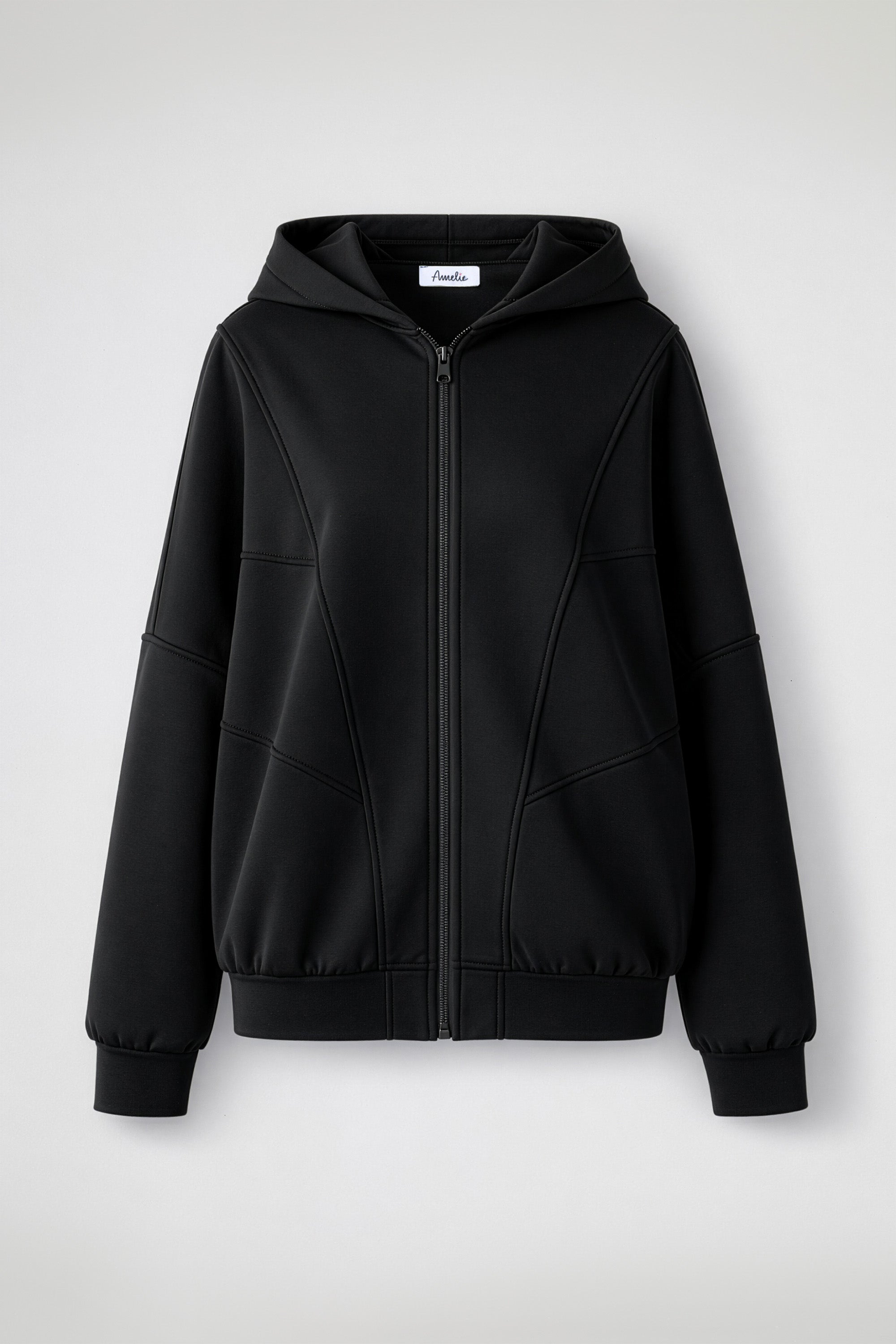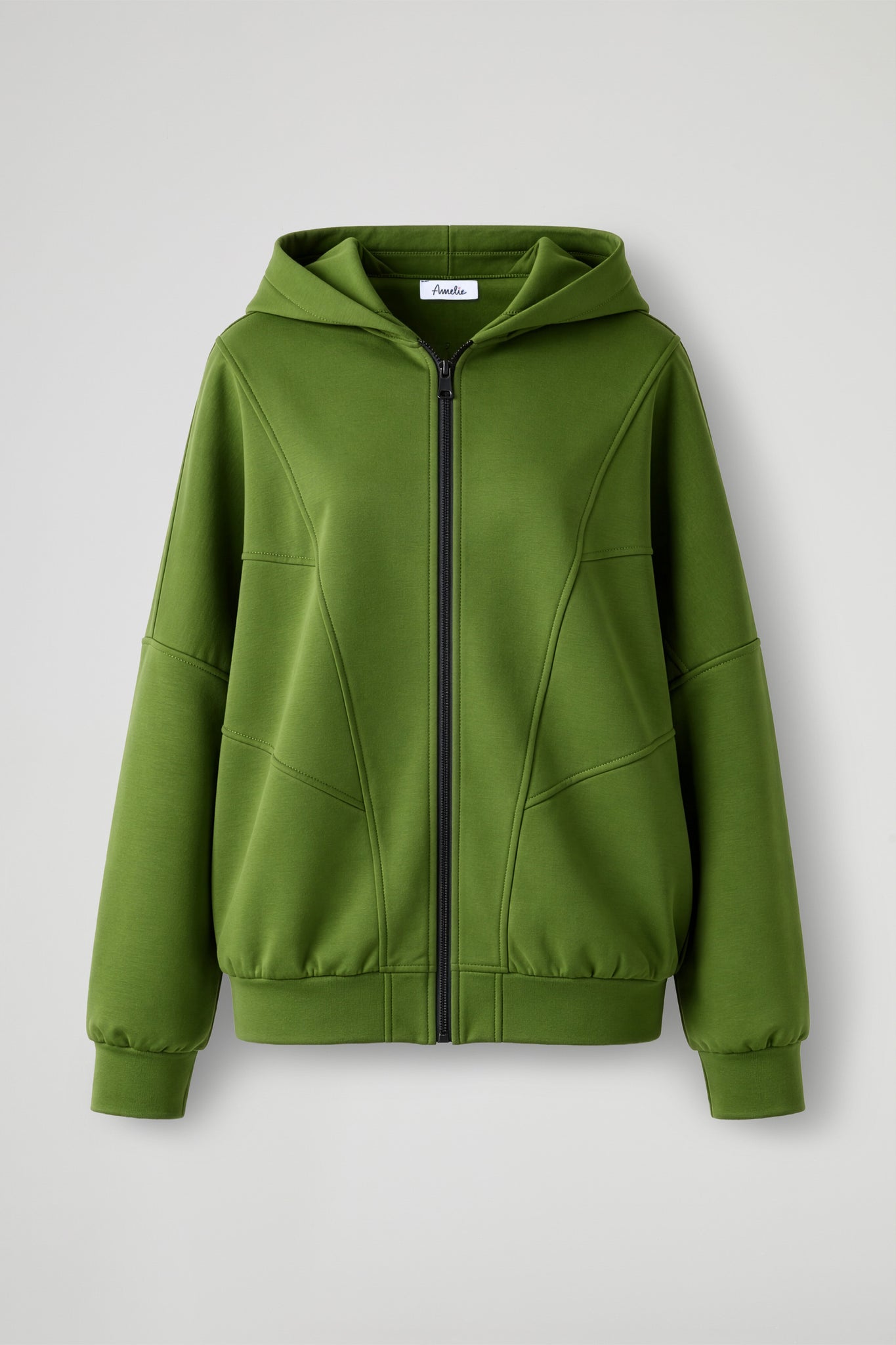 Felpa over, capo che unisce comfort, stile e versatilità; realizzata in tessuto di viscosa, morbido e compatto, piacevole al tatto; Il design è arricchito da tagli sartoriali che definiscono la silhouette e donano struttura al capo, mantenendo una vestibilità comoda e moderna. La chiusura frontale con zip rende la felpa pratica e funzionale, mentre il cappuccio ampio aggiunge un tocco sportivo e contemporaneo.