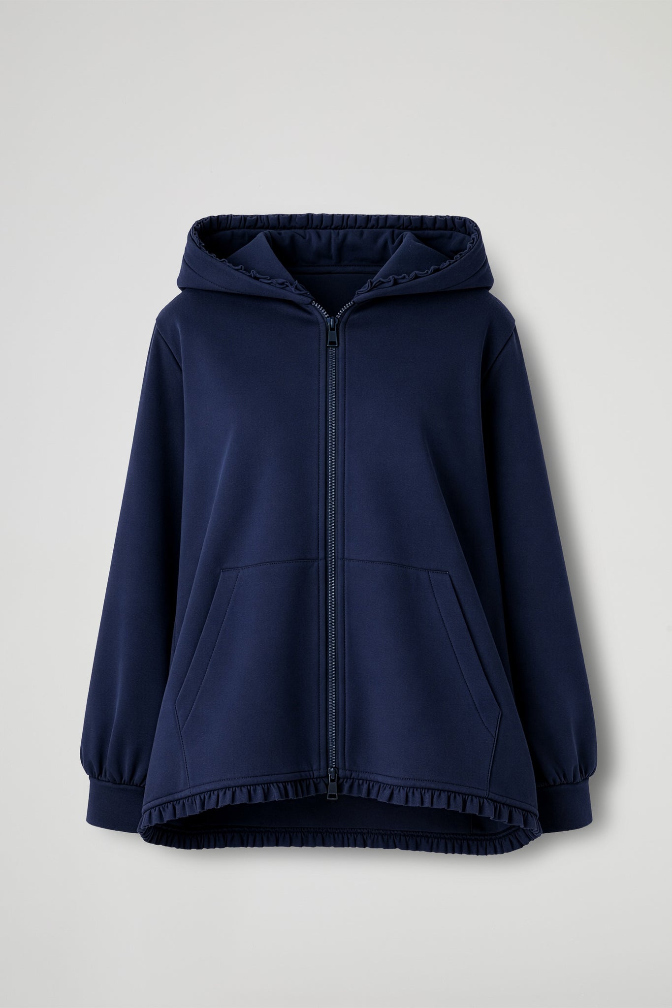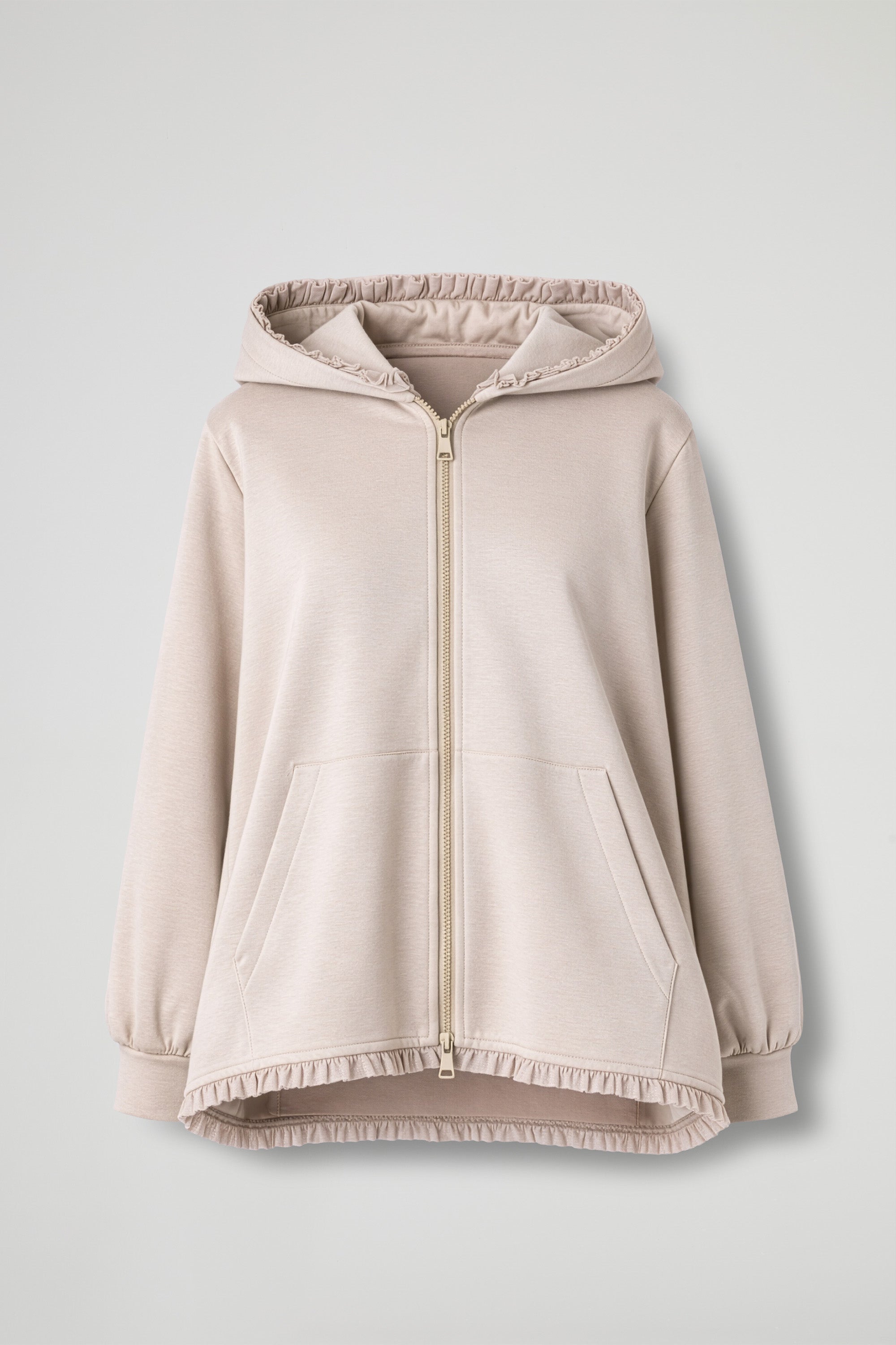 Felpa con cappuccio in morbido tessuto effetto felpa, dal taglio rilassato e femminile. A renderla speciale è il dettaglio in tulle arricciato sul fondo, che crea un elegante effetto volant e dona movimento al capo; presente anche un richiamo arricciato lungo il bordo del cappuccio.