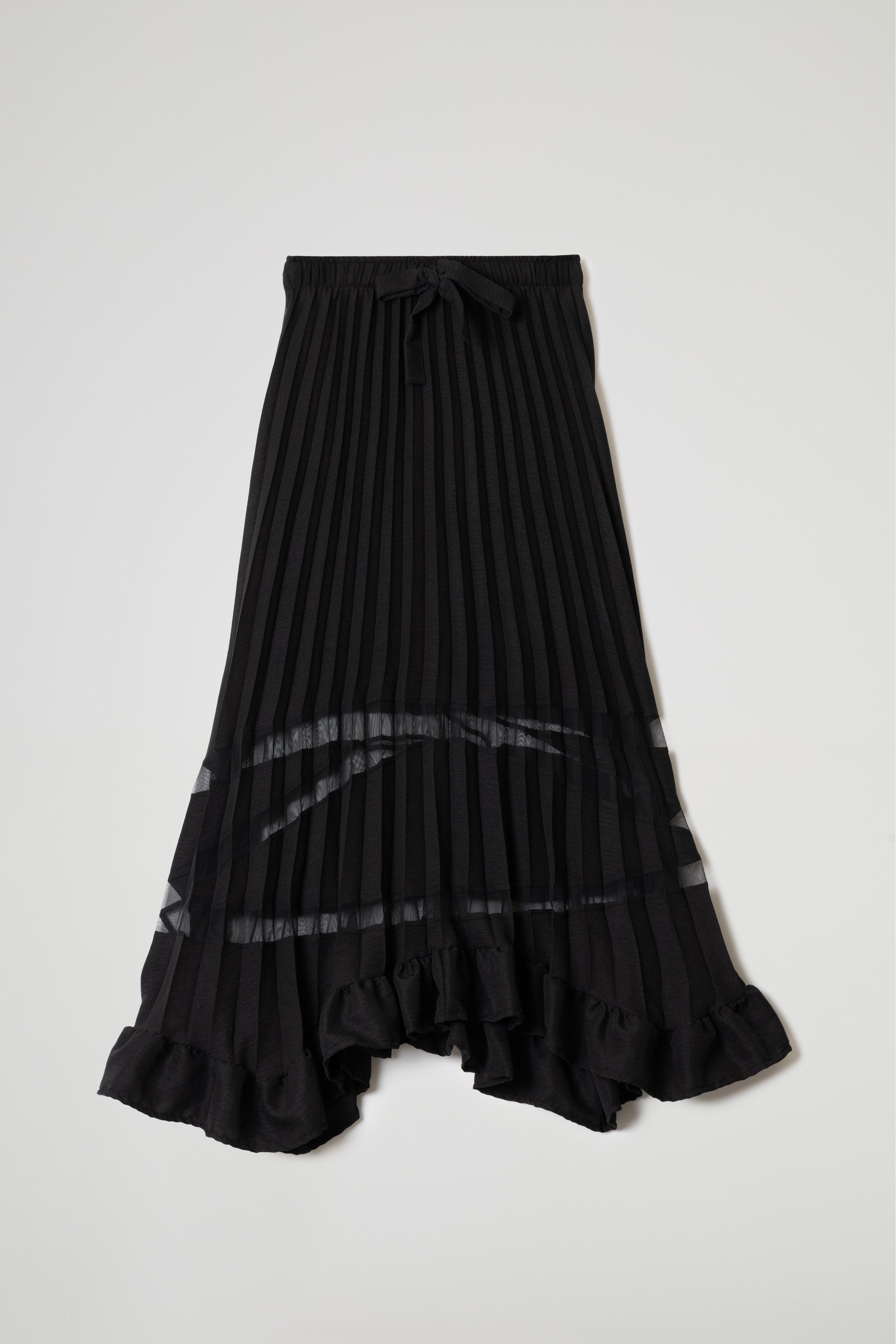 A-line skirt with an elastic waistband and adjustable drawstring, featuring a matching bow at the center. Narrow vertical pleats throughout, sheer horizontal band detail at the hem, and a slightly gathered flounce at the hem. Wide fit.