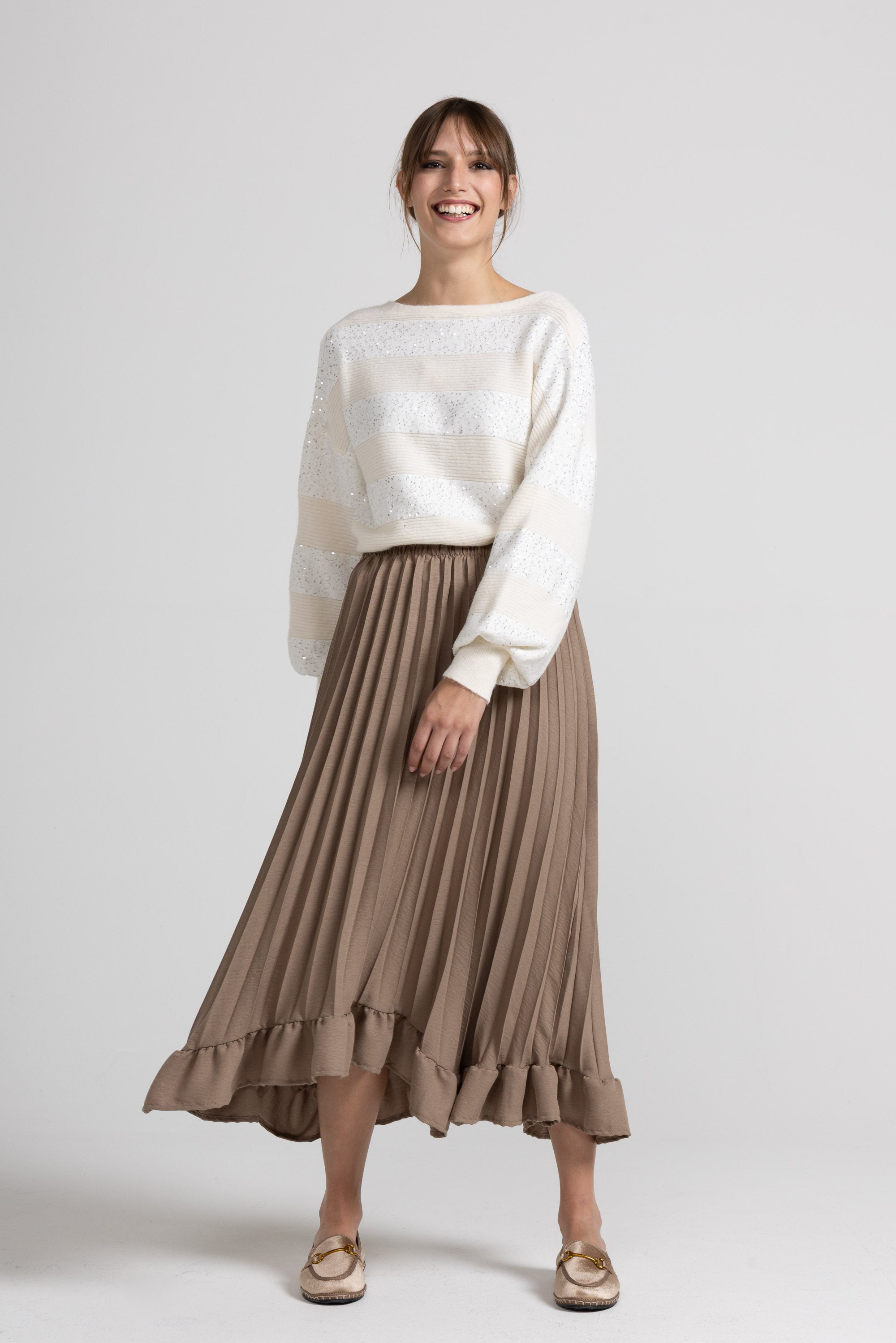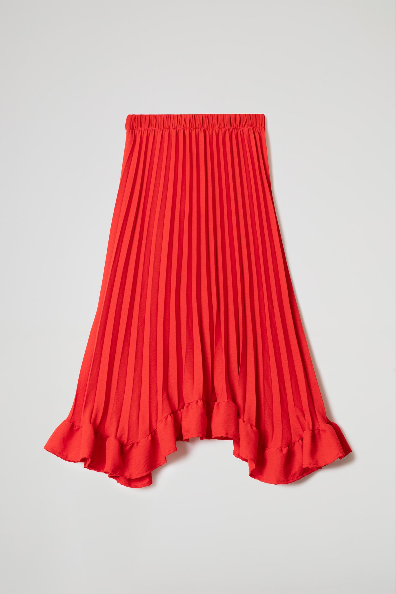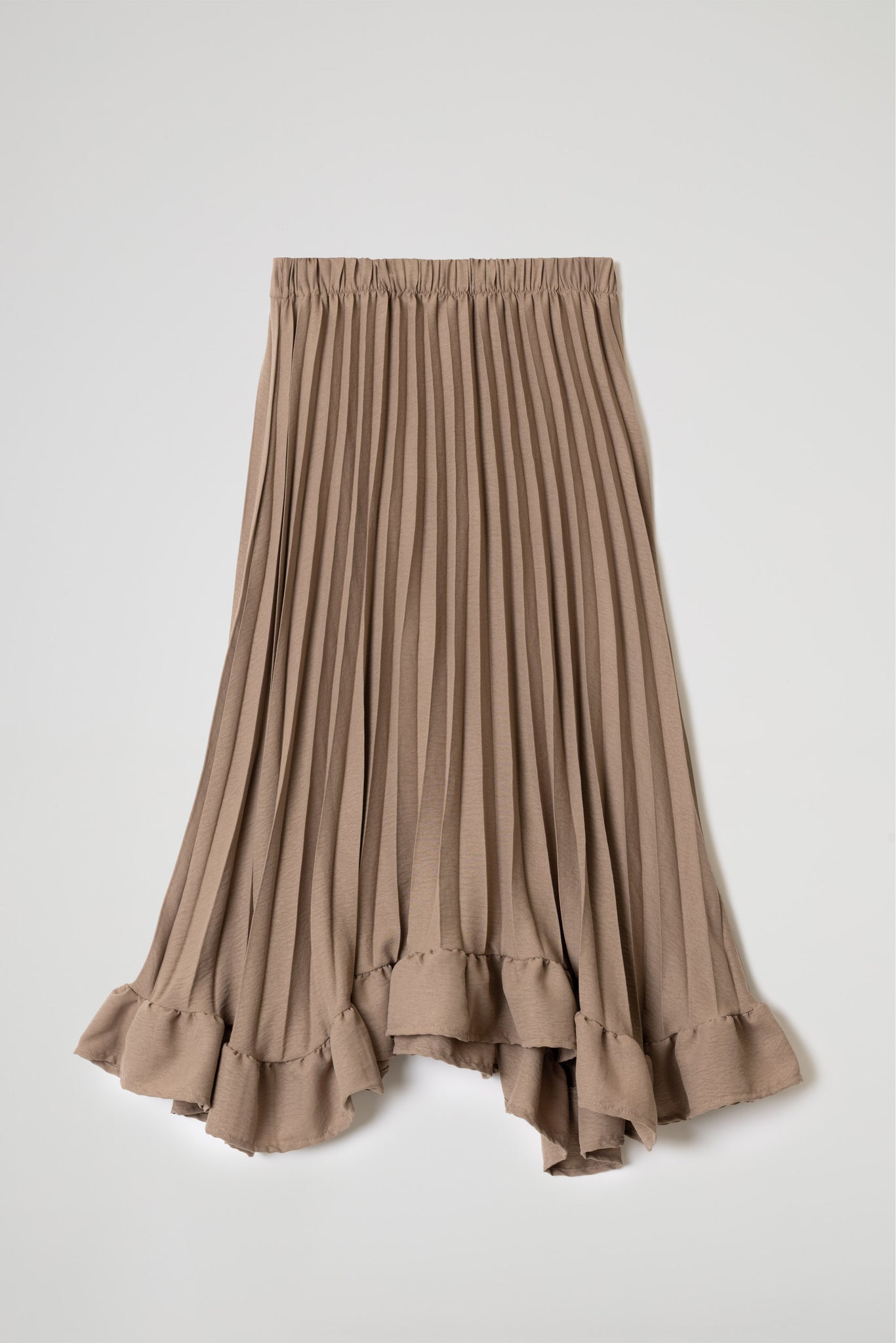 Pleated midi skirt in flowing fabric with a flared, ruffle hem. The piece features a soft, lightweight silhouette, with regular pleats along the length that create movement and volume. The elasticated waistband ensures a comfortable fit and adapts to different body shapes. The bottom hem is finished with a light ruffle for a feminine and romantic touch.