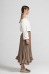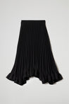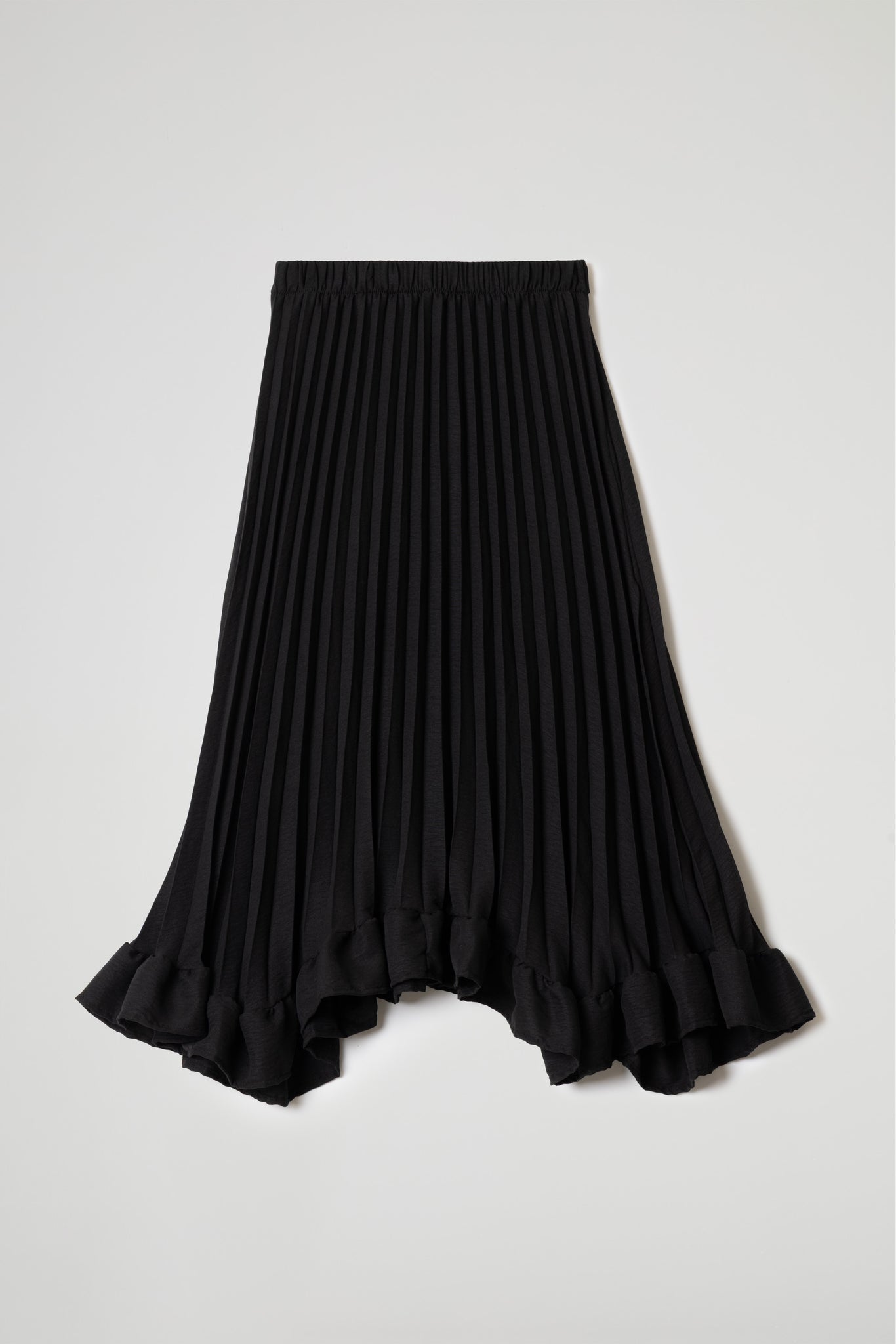 Midi skirt, soft elastic waist, permanent pleating throughout, asymmetrical hem with gathered flounce
