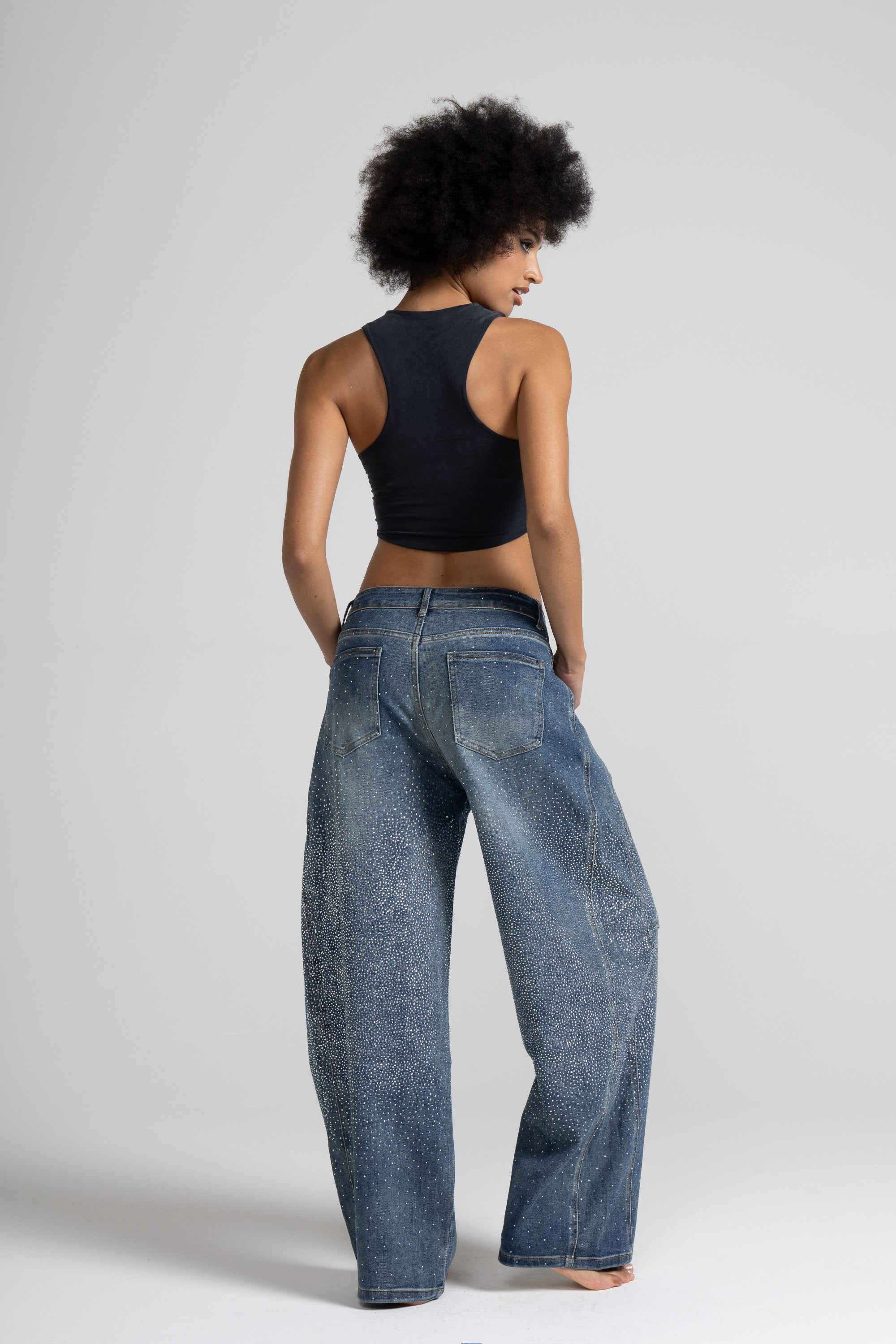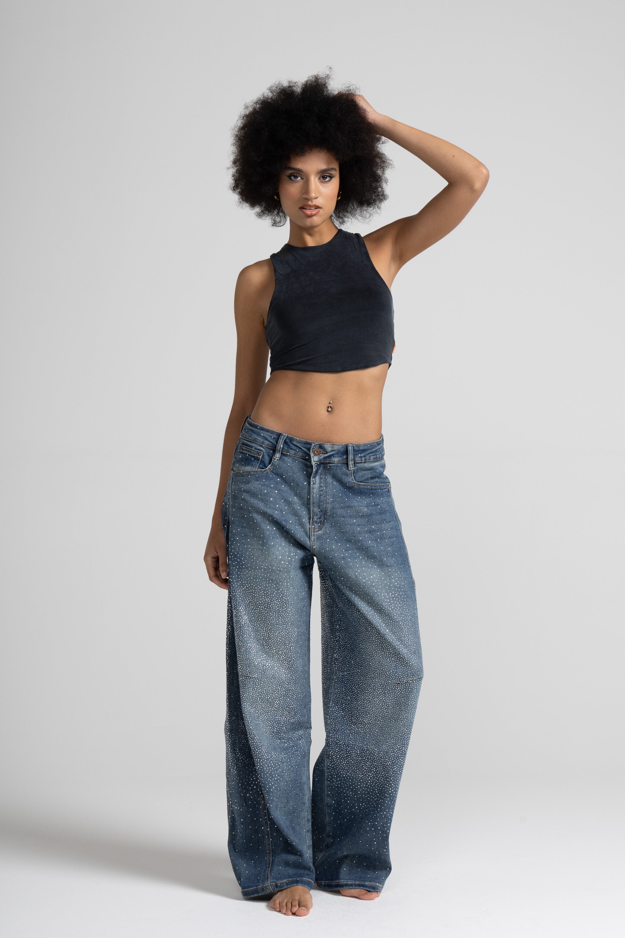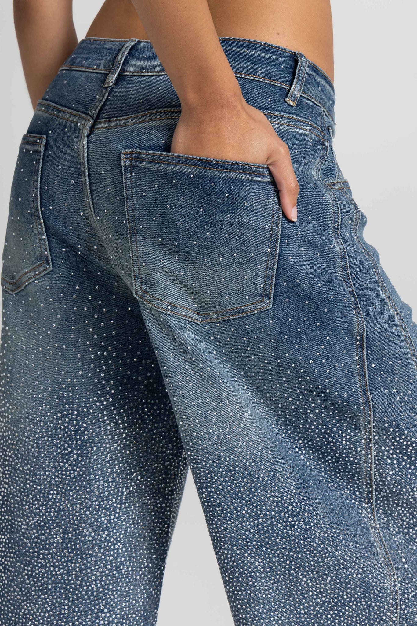 Baggy jeans, high waist, front closure with metal button and zip, 5 pockets, wide leg with vertical stitching detail that runs from the pockets to the bottom, horizontal stitching at the knees, micro rhinestone applications throughout. Wide fit.