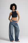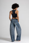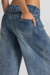 Blue denim, with a soft texture and a faded wash, embellished with a shower of sparkling micro rhinestones that catch the light with every step, making them an iconic and irresistible piece. A versatile piece, perfect for casual chic or elegant evening looks.