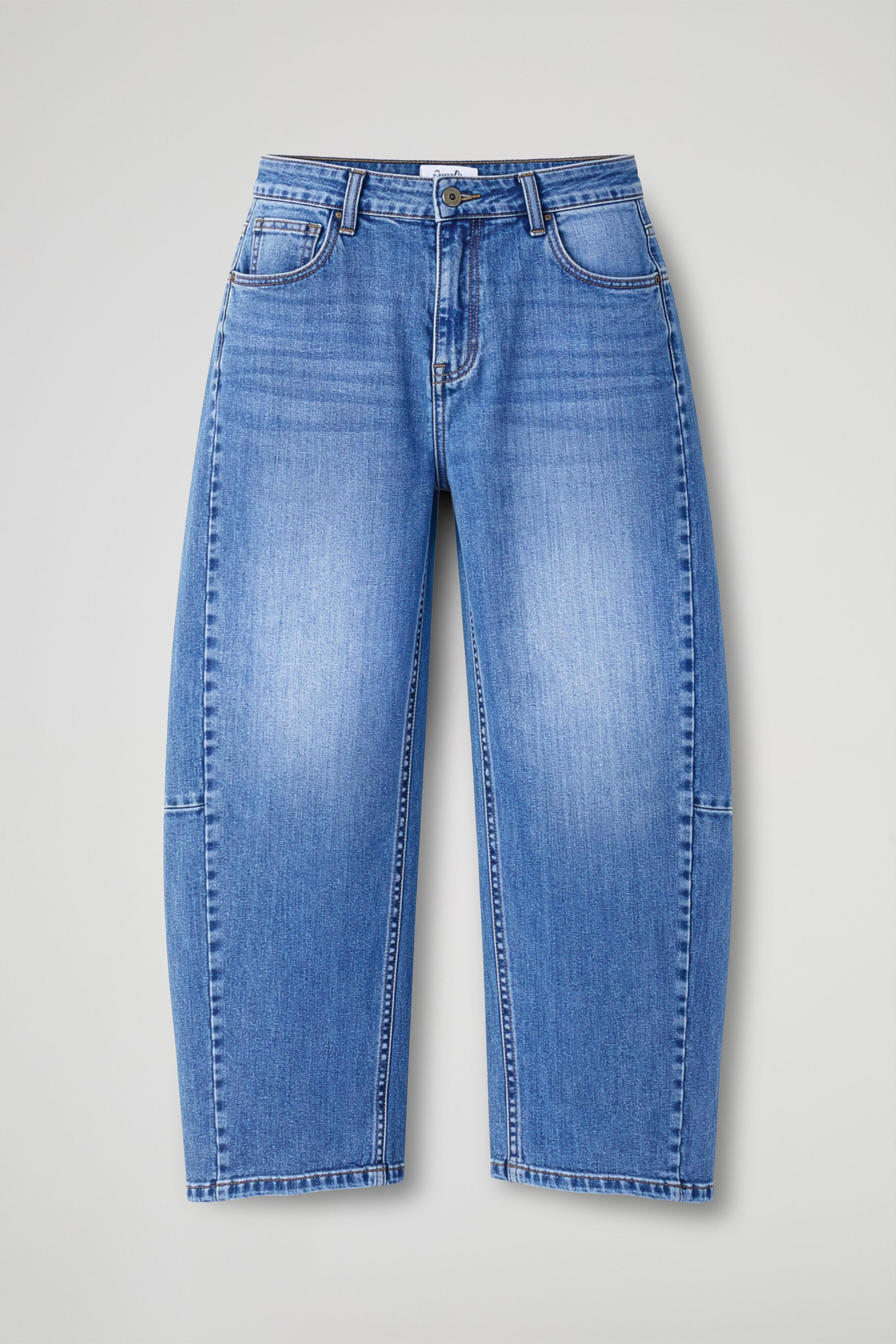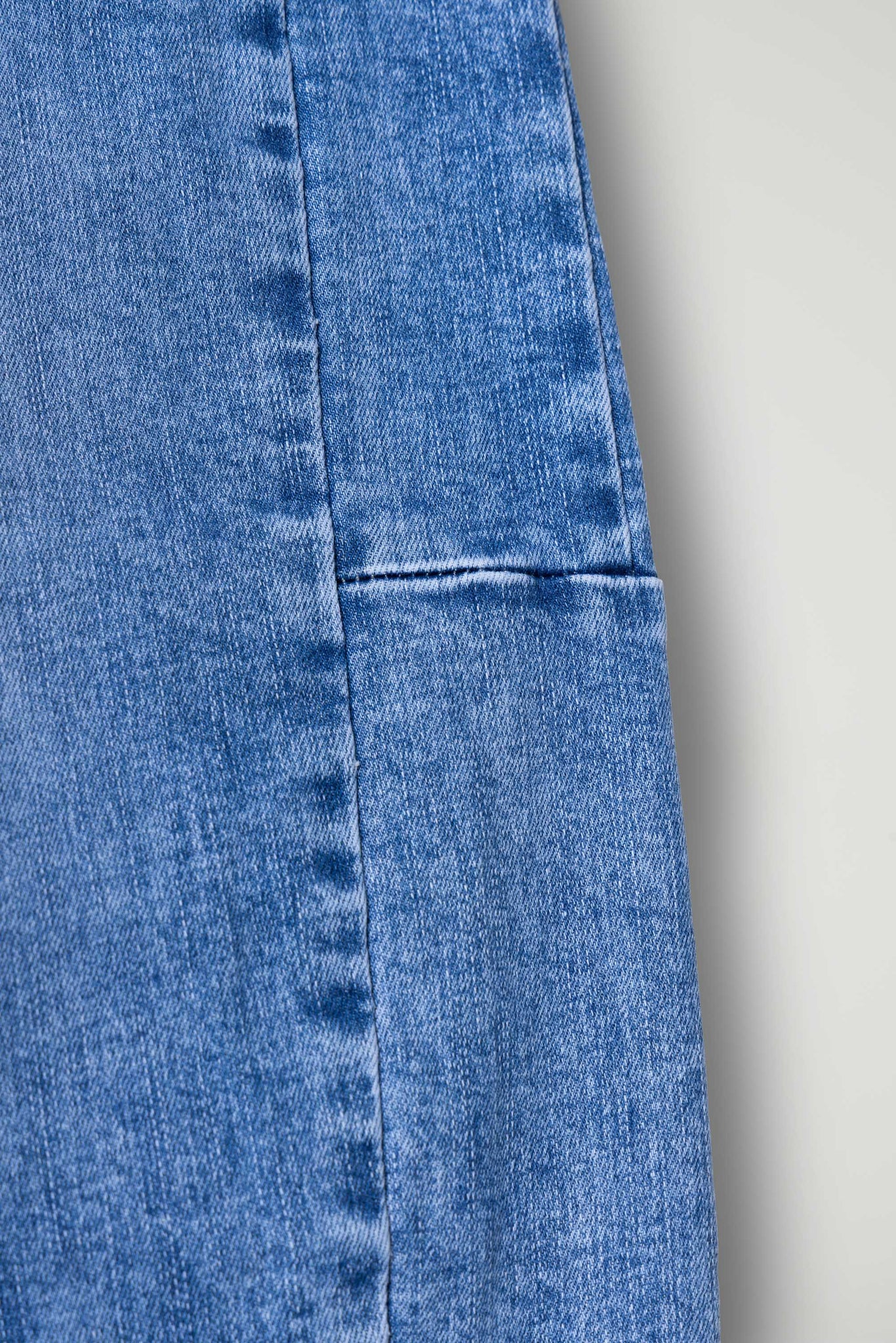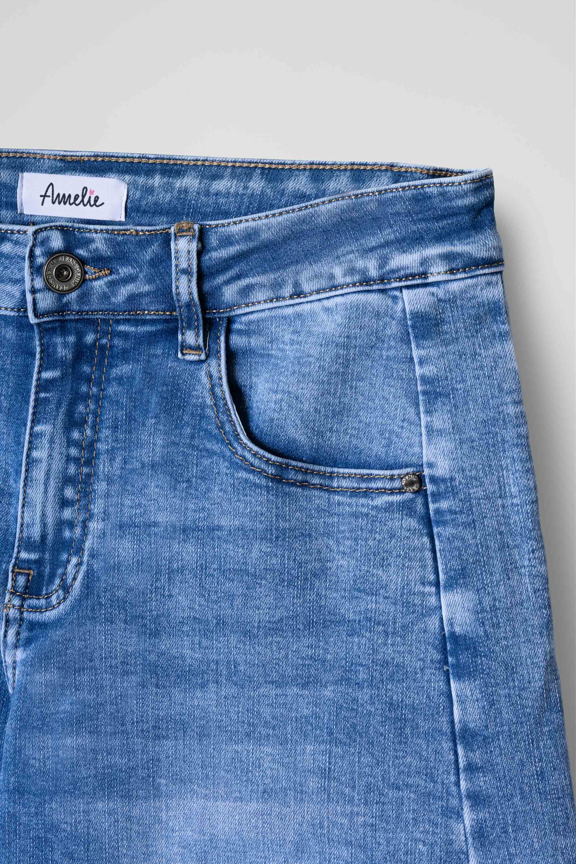 Jeans in denim blu dal lavaggio chiaro con effetto leggermente sfumato, caratterizzati da originali impunture laterali che creano un dettaglio strutturato lungo la gamba. Il modello presenta vita regolare, chiusura con bottone e zip e classiche cinque tasche. Le cuciture laterali sagomate donano movimento al capo e valorizzano la silhouette, aggiungendo un tocco contemporaneo al denim.