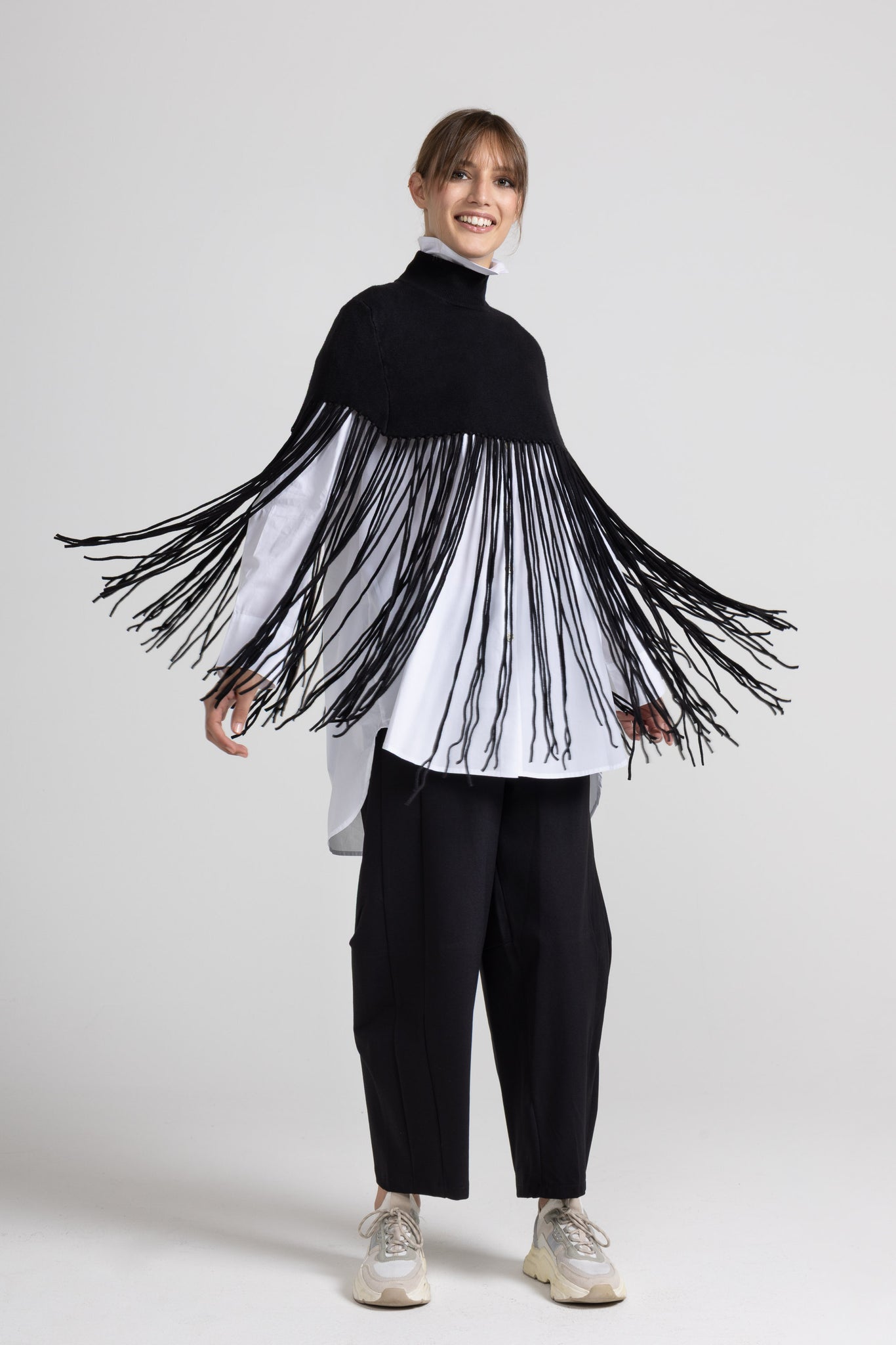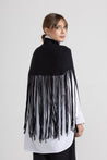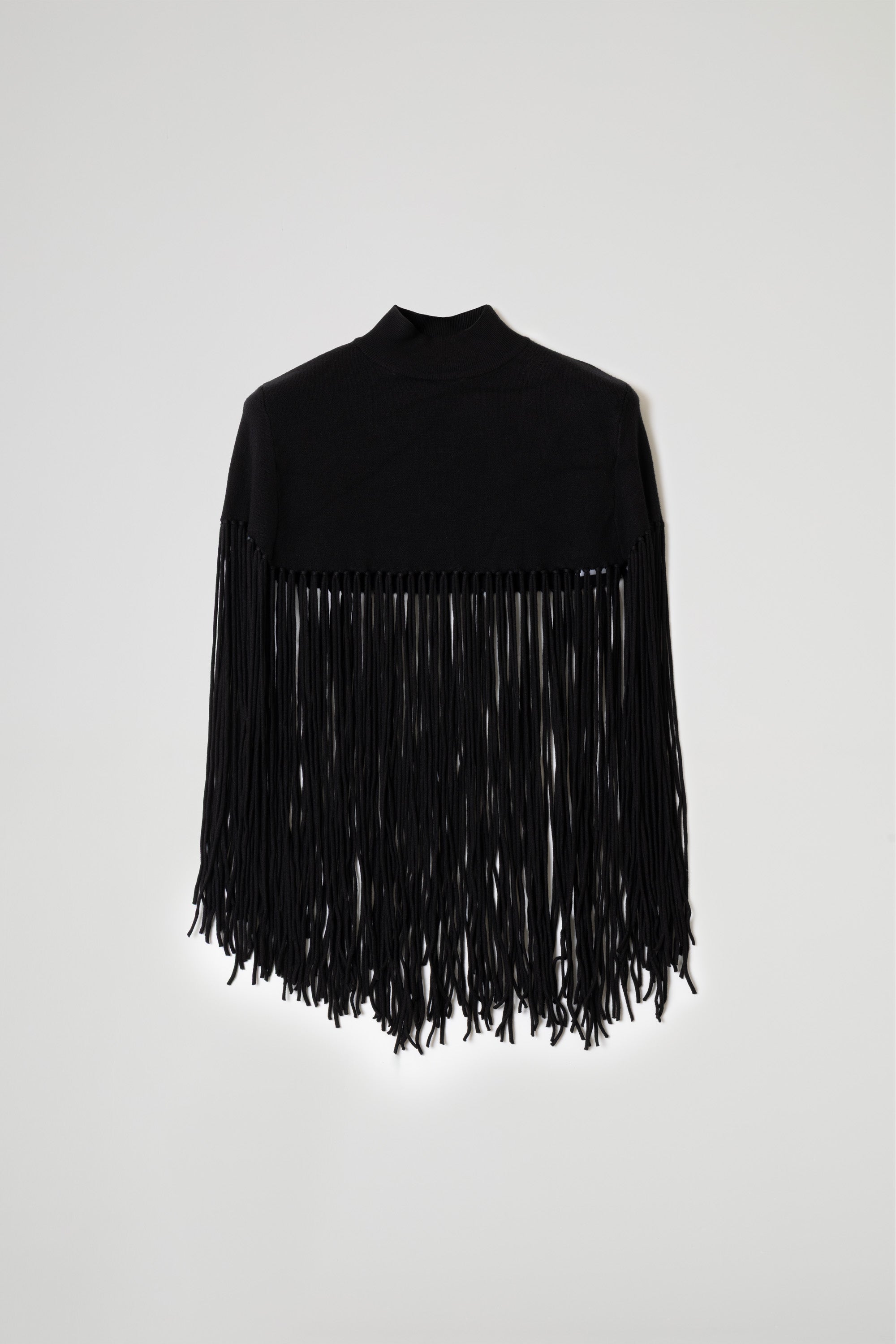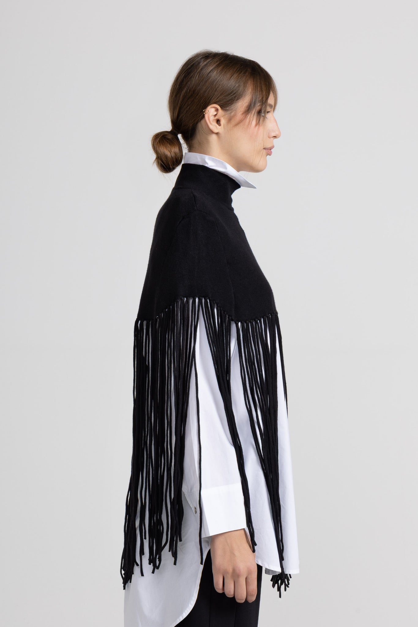 Soft viscose knit shrug, high neck with fine ribbed detail, long and flowing fringes applied along the entire length of the garment starting from the chest line, made of tone-on-tone yarn that moves naturally following the movements of the body.