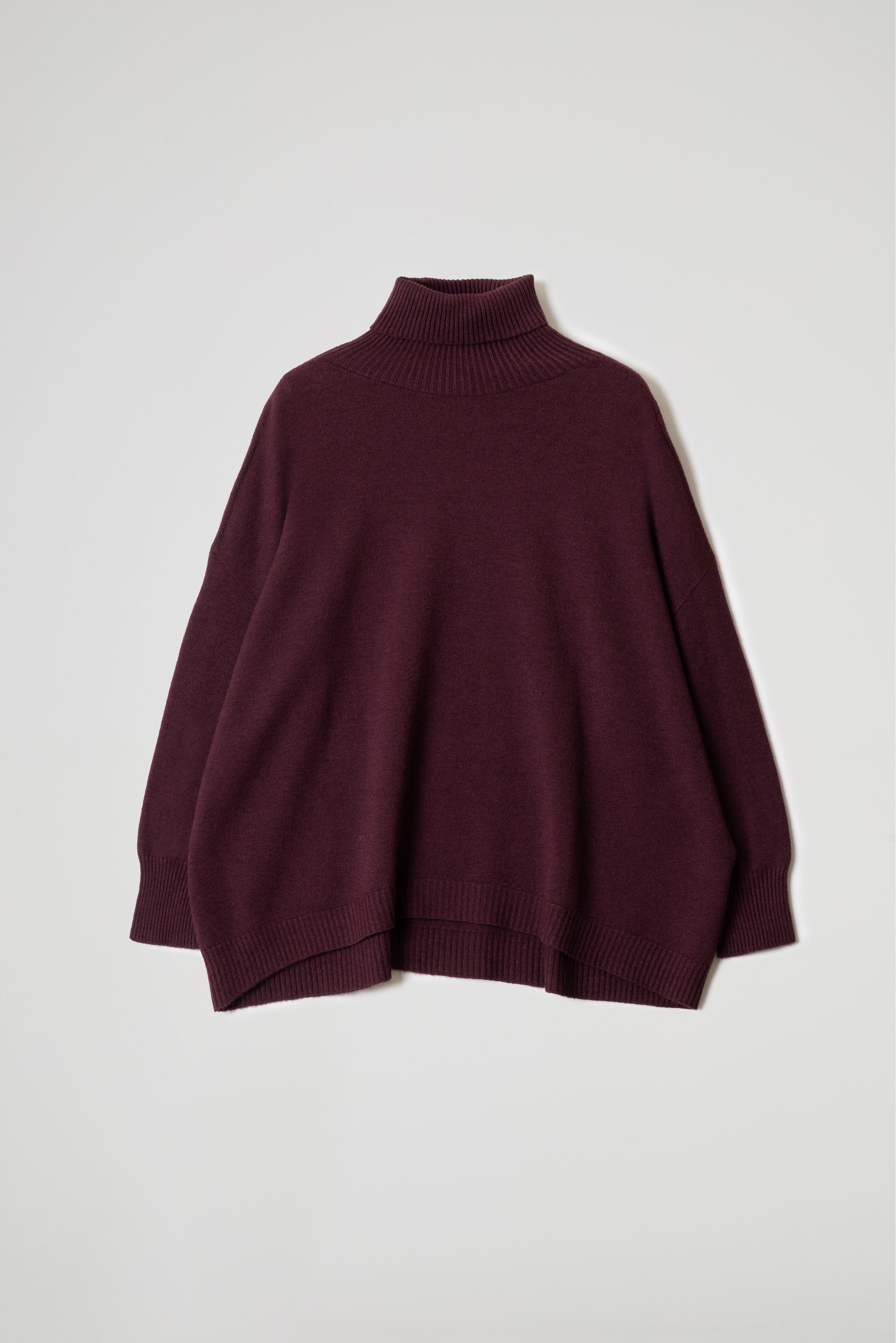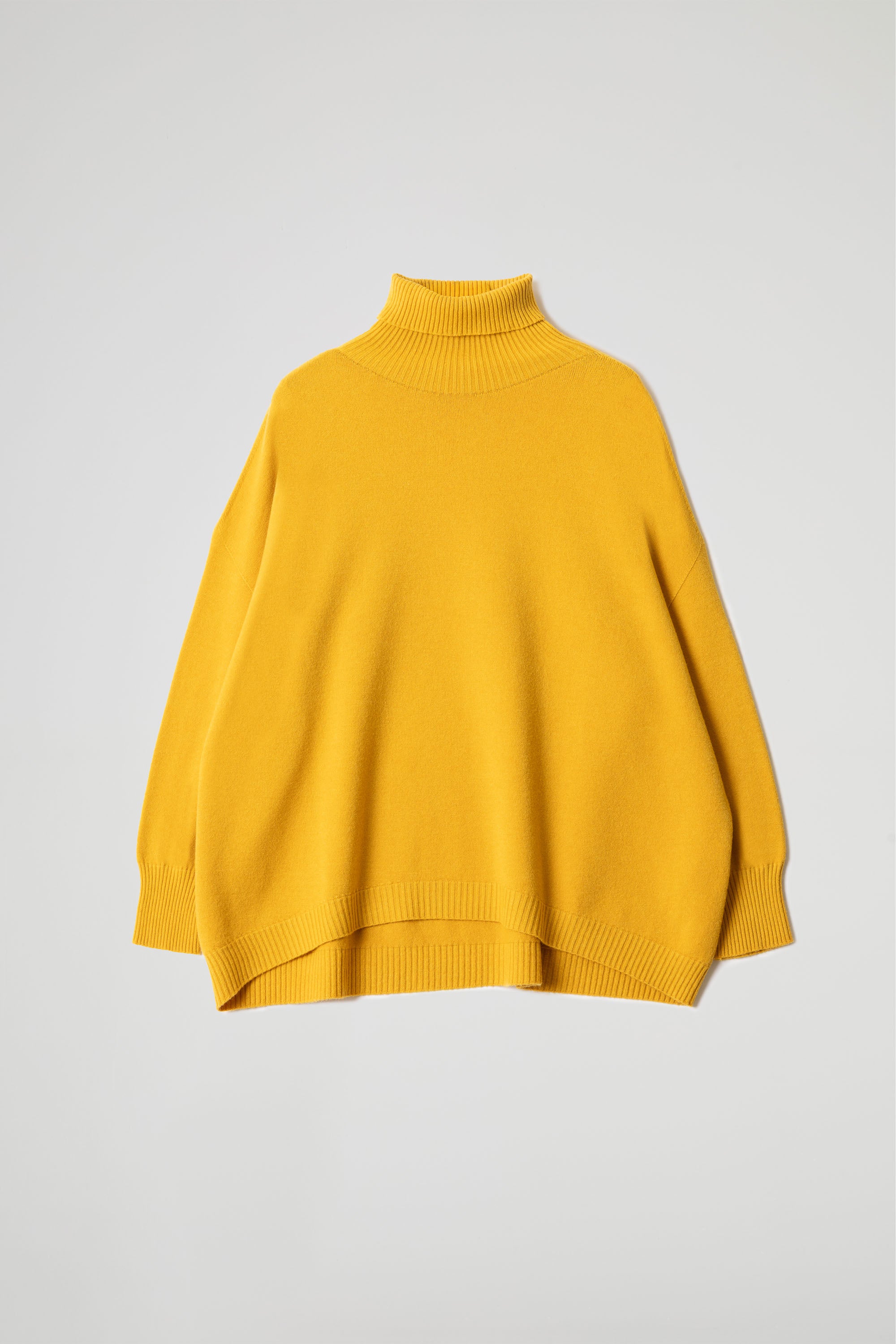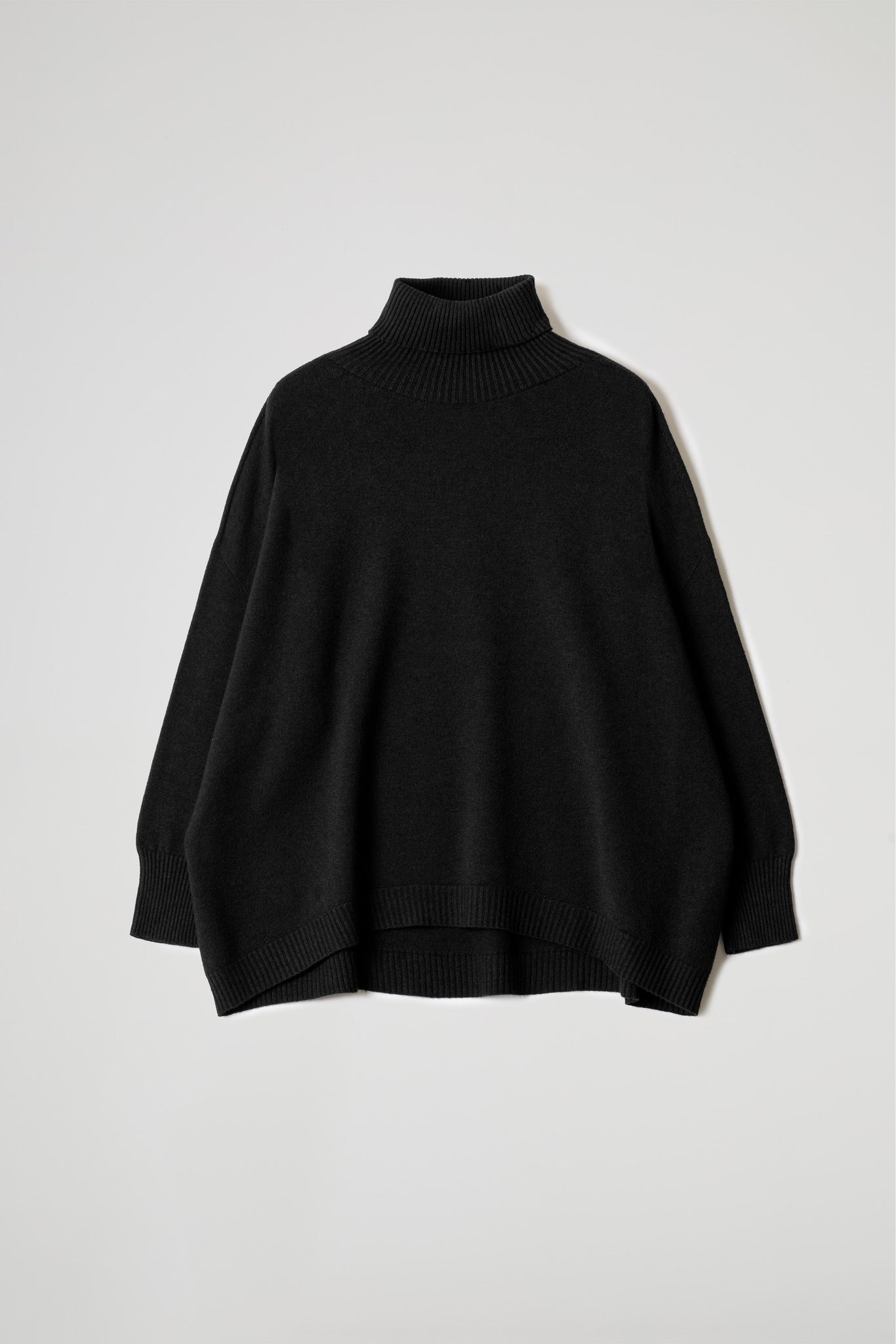 Collo alto e avvolgente a coste elasticizzate, spalle scese, maniche lunghe con polsini alti a  costine elasticizzate, lavorazione a bordo alto a costine compatte sul fondo. Linea ampia