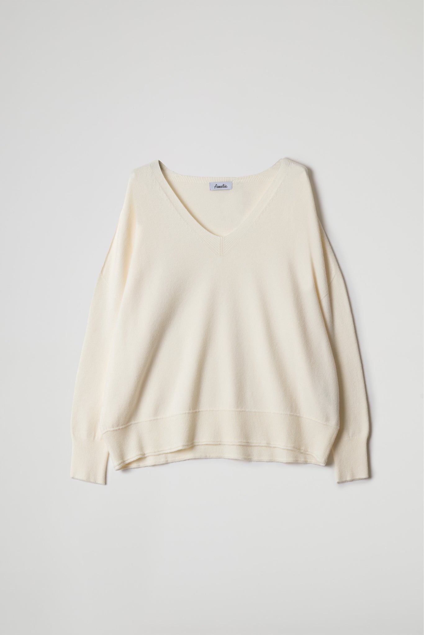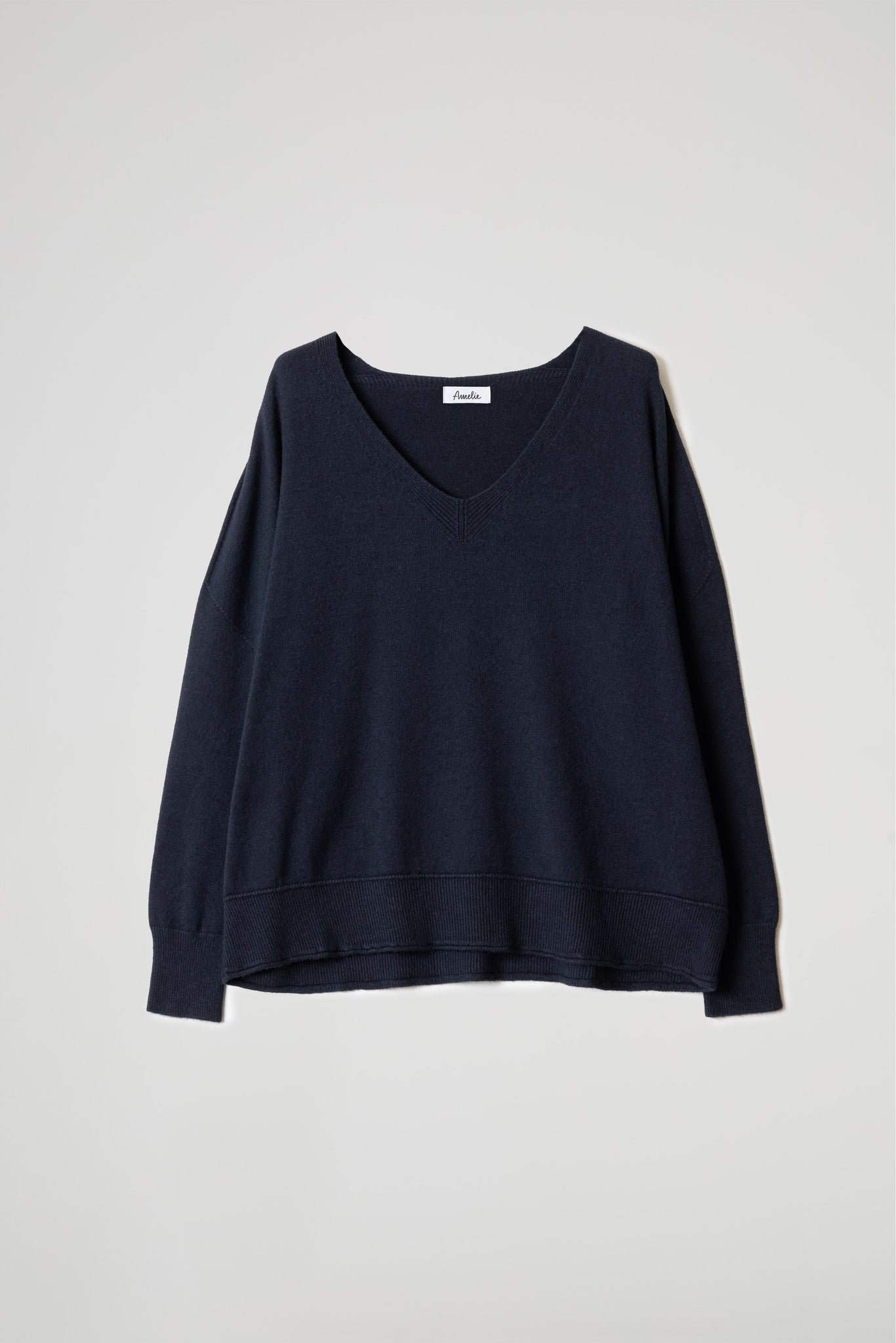V-neck with fine ribbed detail and double-thread central reinforcement, slightly dropped shoulders, long sleeves with high-ribbed cuffs, and a high-cut hem with a shaped motif. Comfort fit.