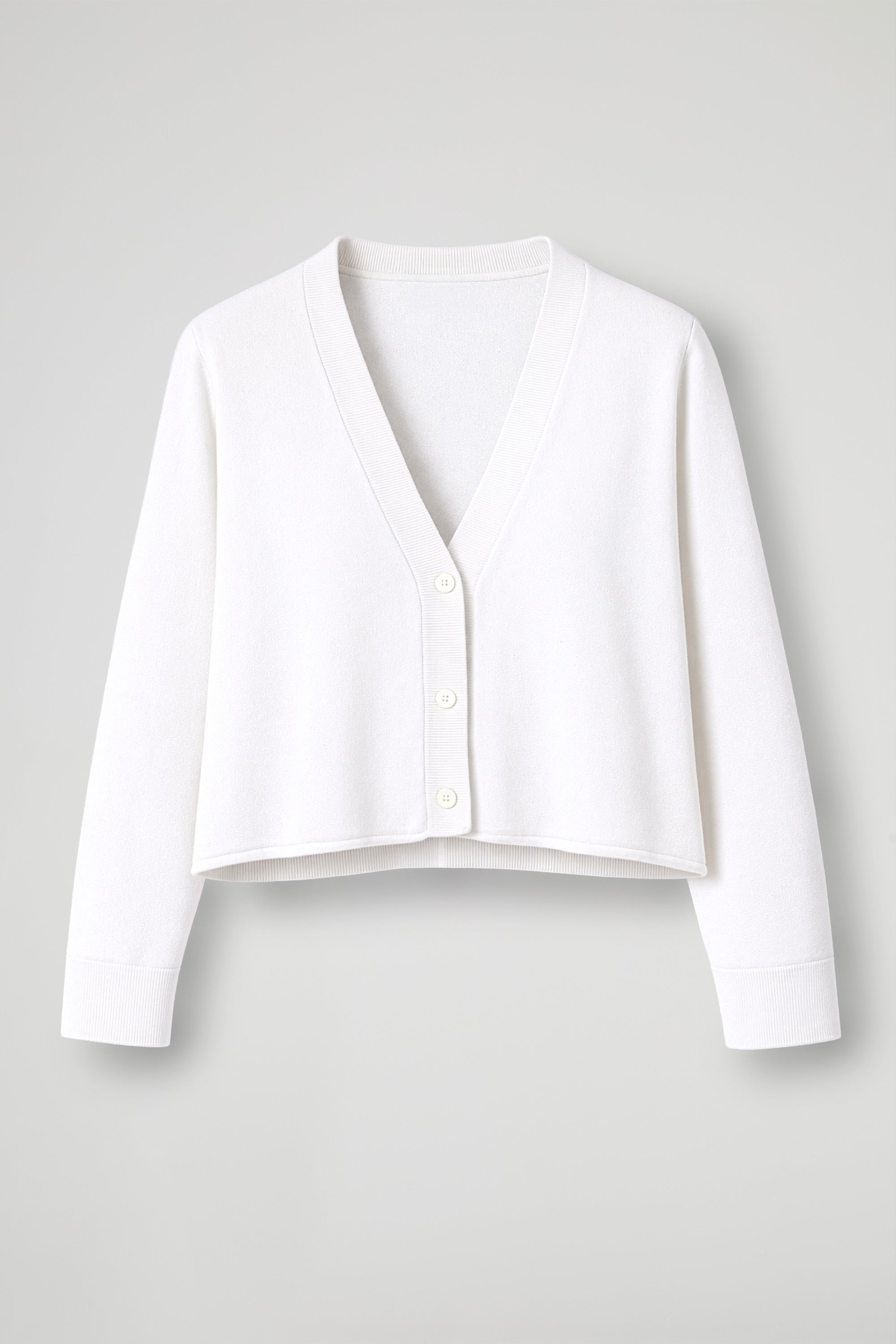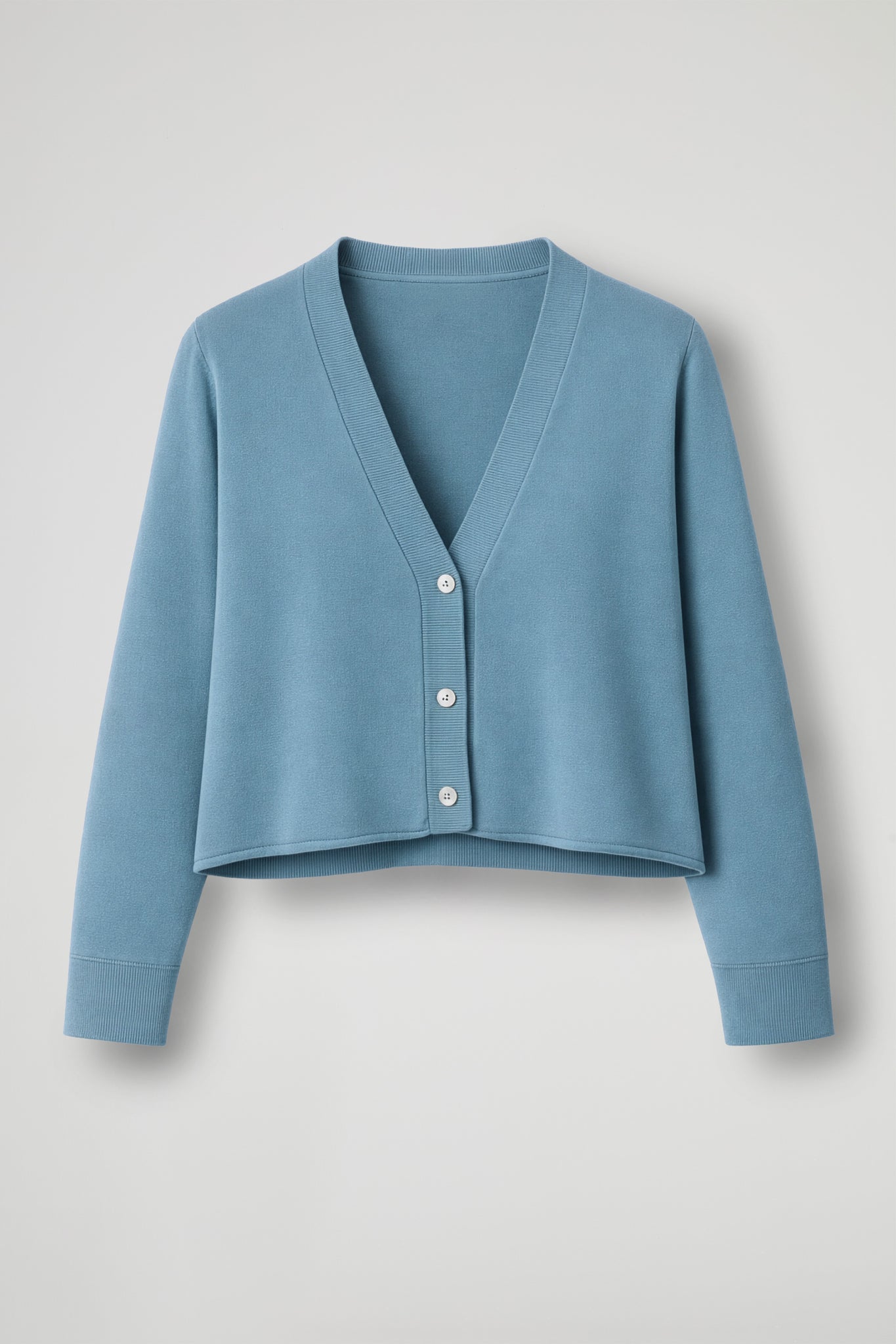 Asymmetrical boxy cardigan in soft viscose jersey, dropped shoulders, long sleeves with high cuff detail, v-neck with ribbed detail, front opening with mother-of-pearl buttons, raw cut hem.