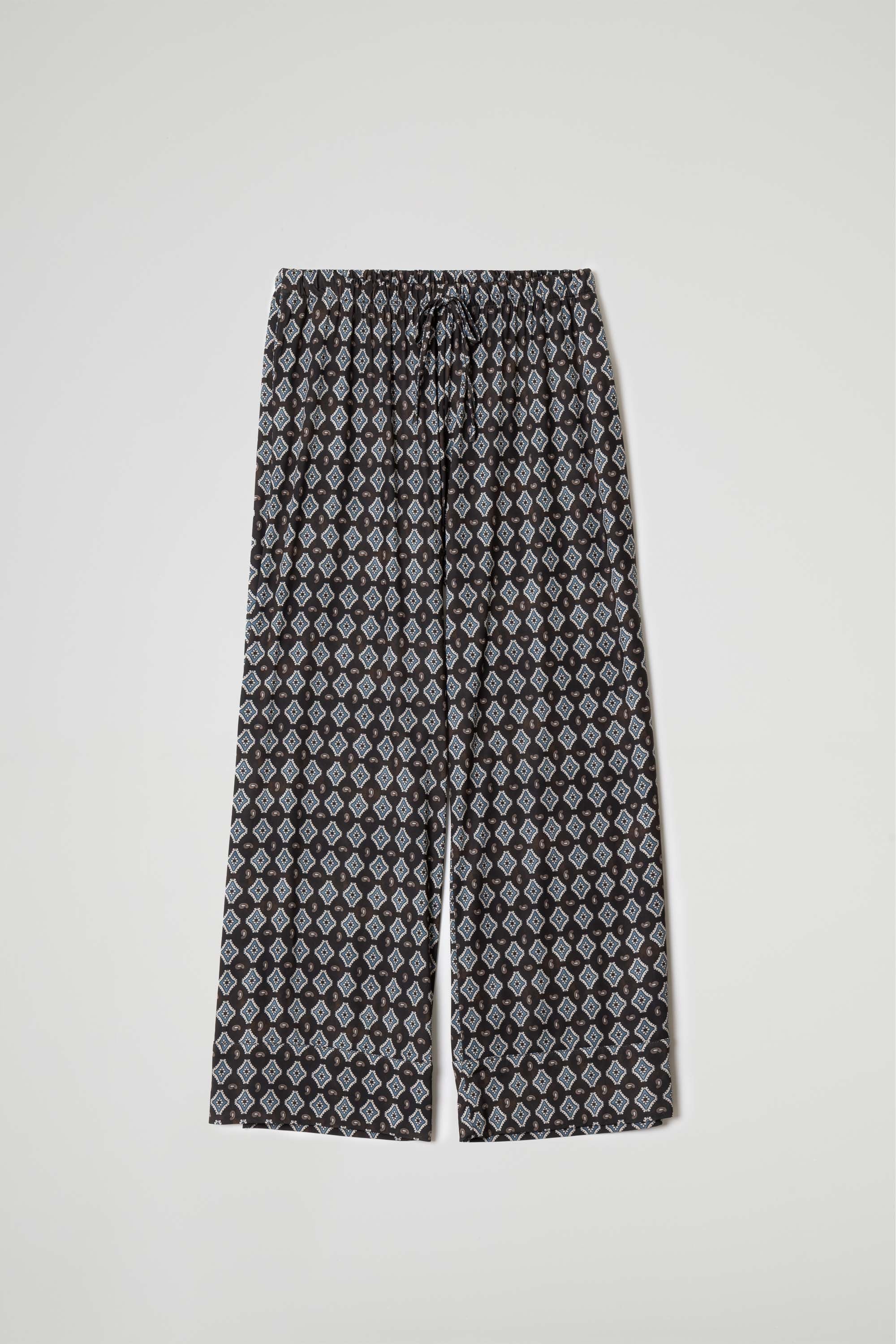 Palazzo trousers in technical fabric, elastic waist with adjustable drawstring, welt pockets, high folded hem at the bottom, geometric pattern all over the garment, soft Lina