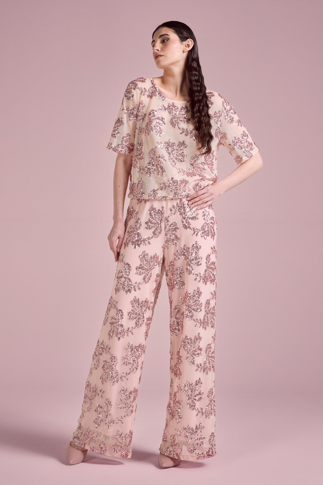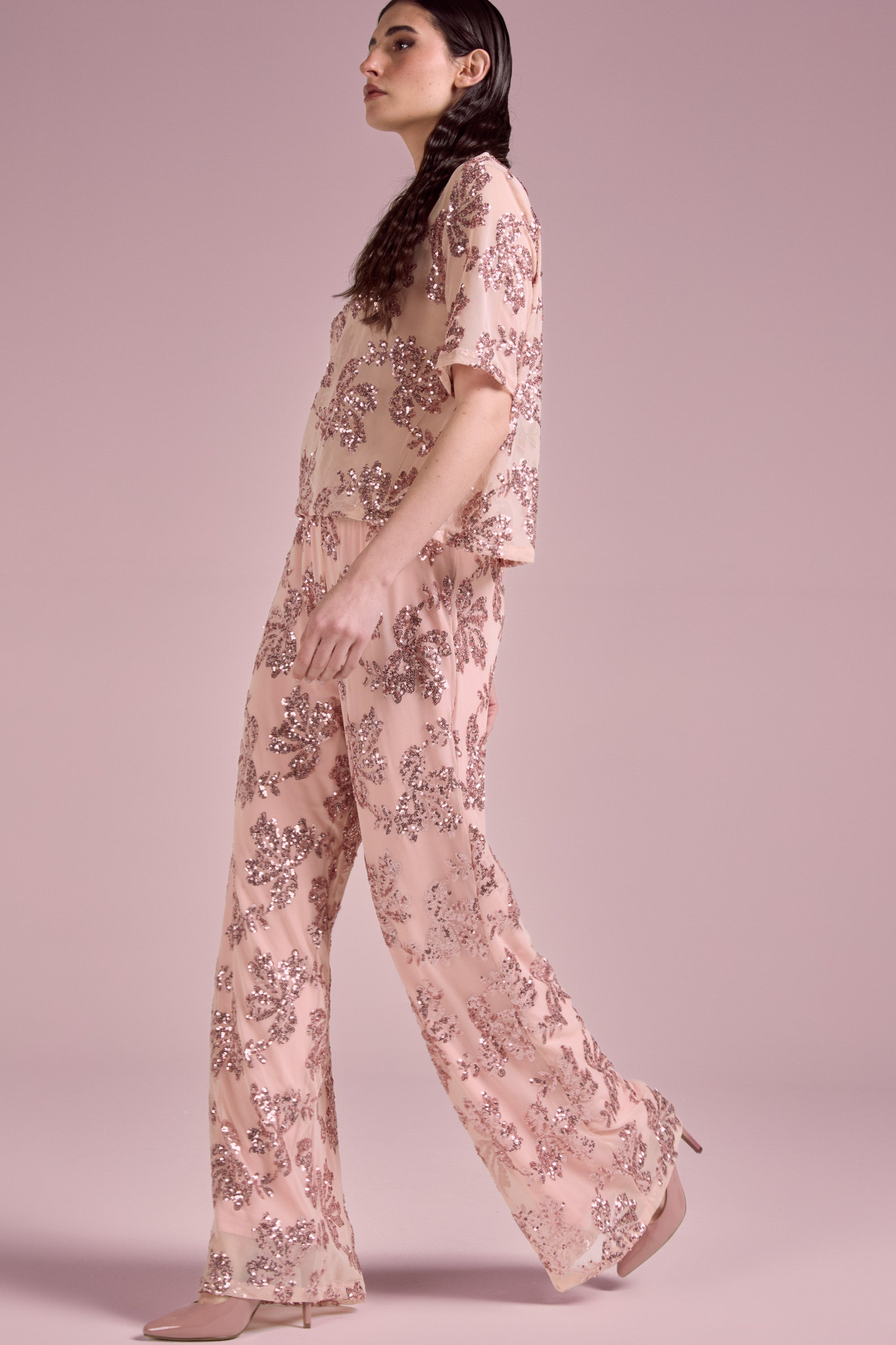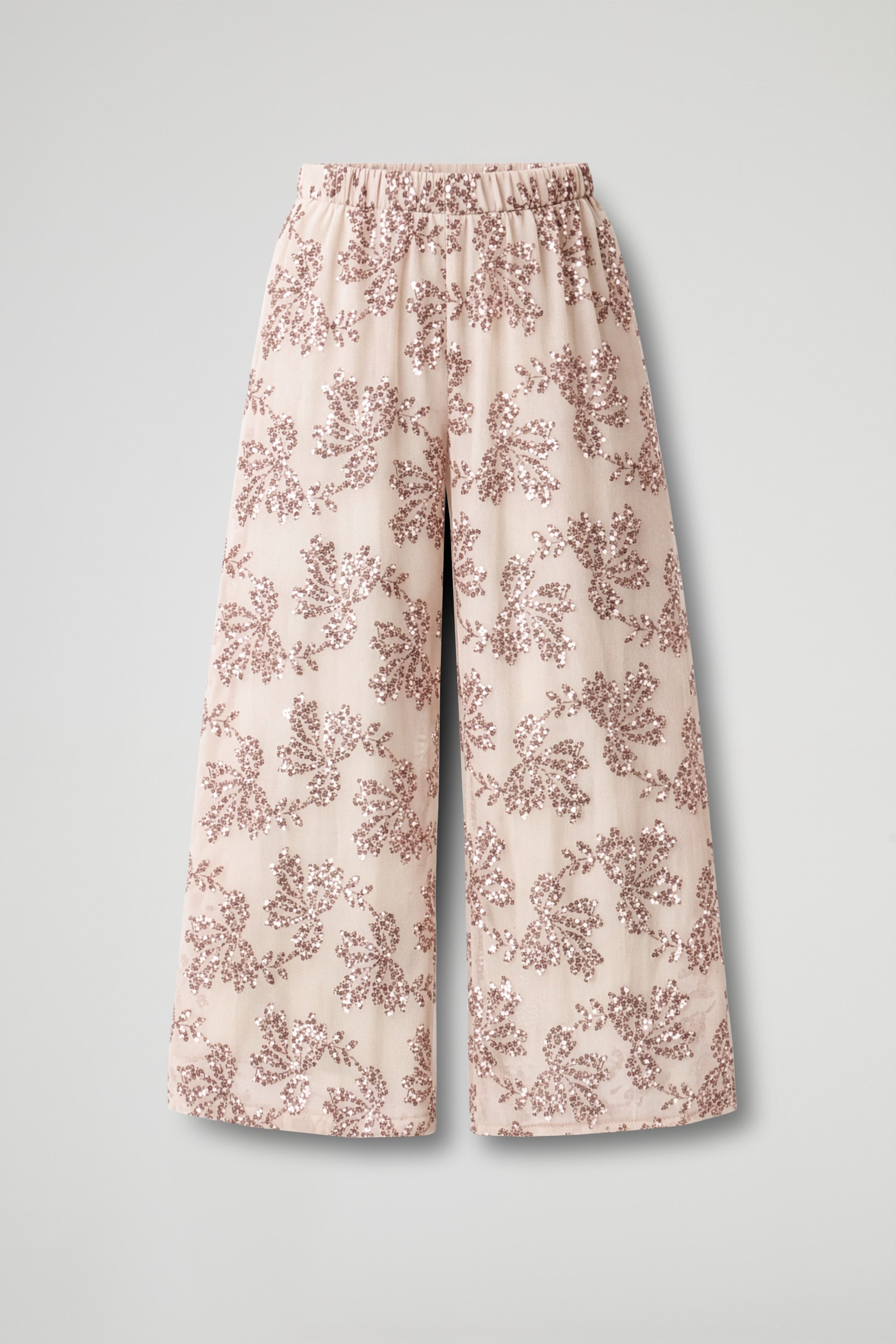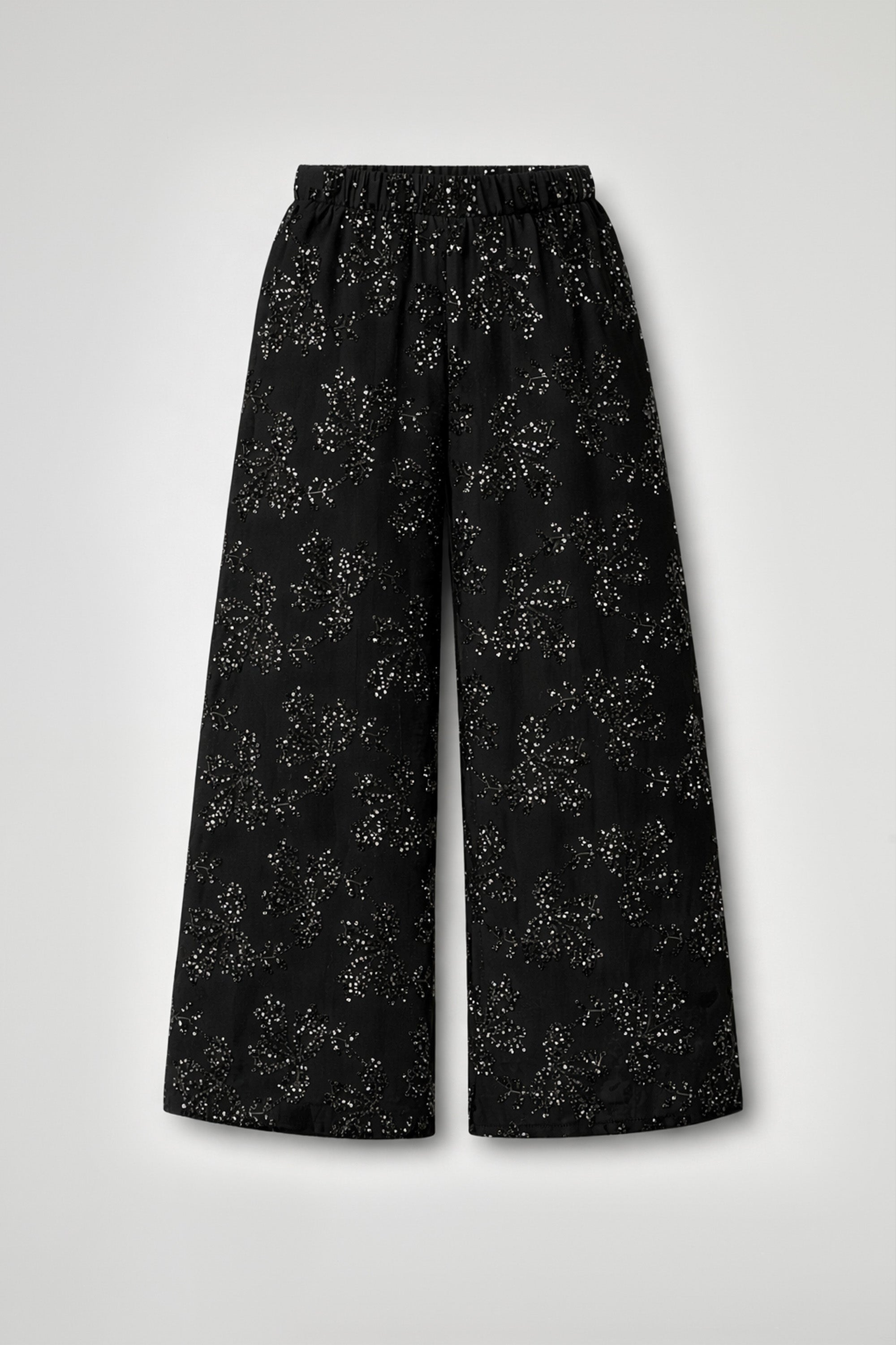 Long trousers with a wide and flowing cut, characterized by a comfortable and relaxed fit. The waist is elasticated, ensuring practicality and adaptability to the silhouette; embellished with a refined tone-on-tone floral sequin motif, which adds luminosity and an elegant yet delicate effect. The leg is straight and wide, with a soft line that follows movement.