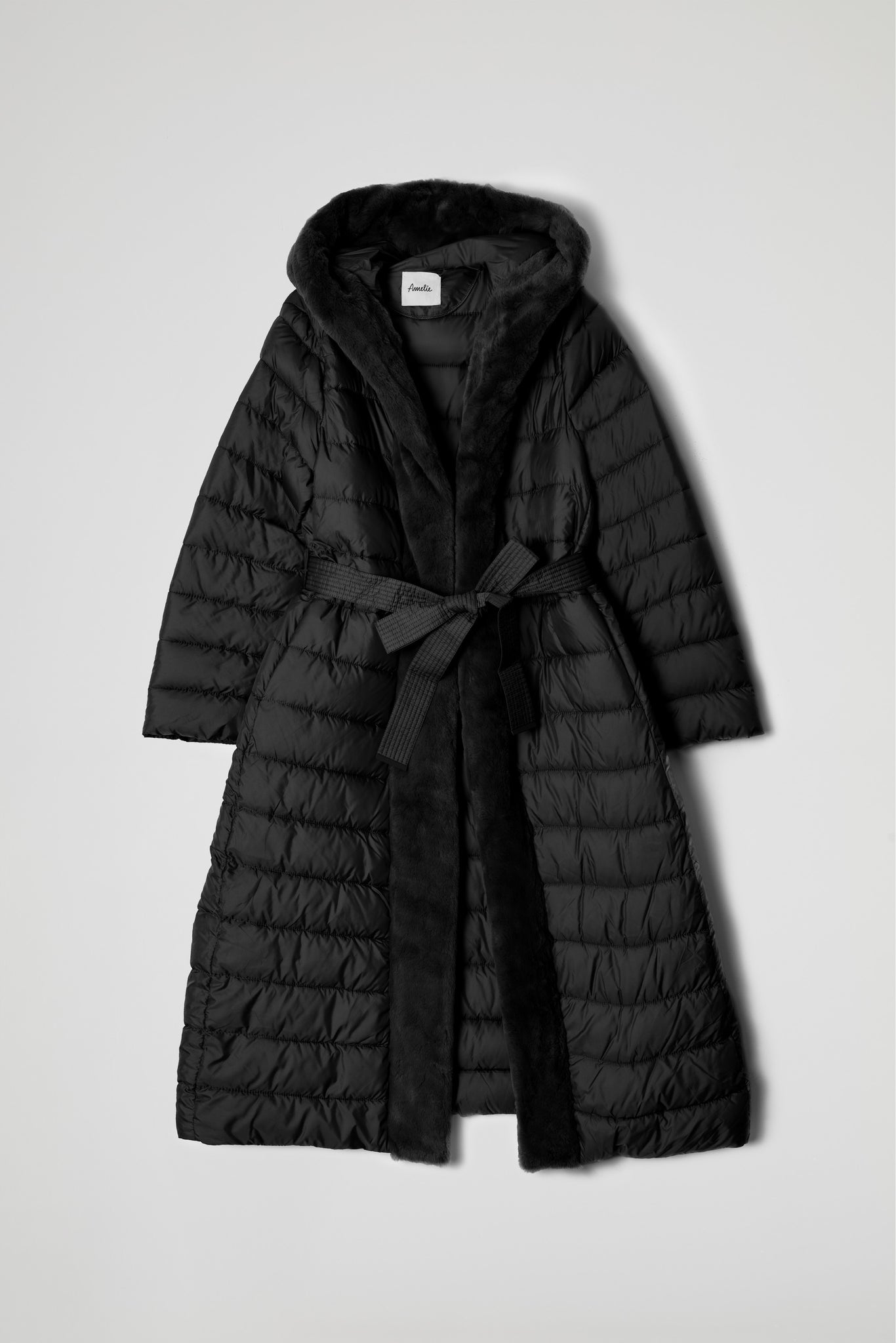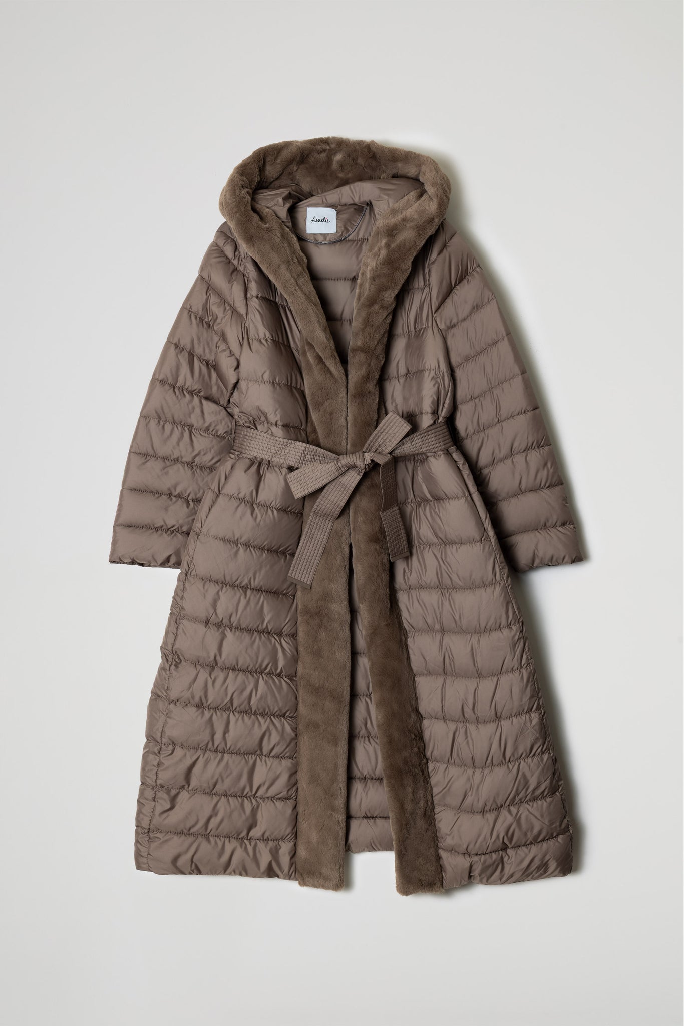Piumino lungo con dettaglio in morbida eco pelliccia offre un’eleganza contemporanea che lo rende ideale sia per look urbani che più raffinati ,la trapuntatura orizzontale regolare valorizza la silhouette senza appesantire, mentre la cintura coordinata con impunture parallele permette di regolare la vestibilità e definire il punto vita, per un effetto femminile e slanciato.