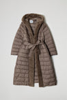 Collo avvolgente, con cappuccio integrato, manica lunga, cintura a chiusura removibile e passanti laterali, tasche a filo con chiusura zip nascosta. Vestibilità regolare, modellata con possibilità di stringere in vita.
