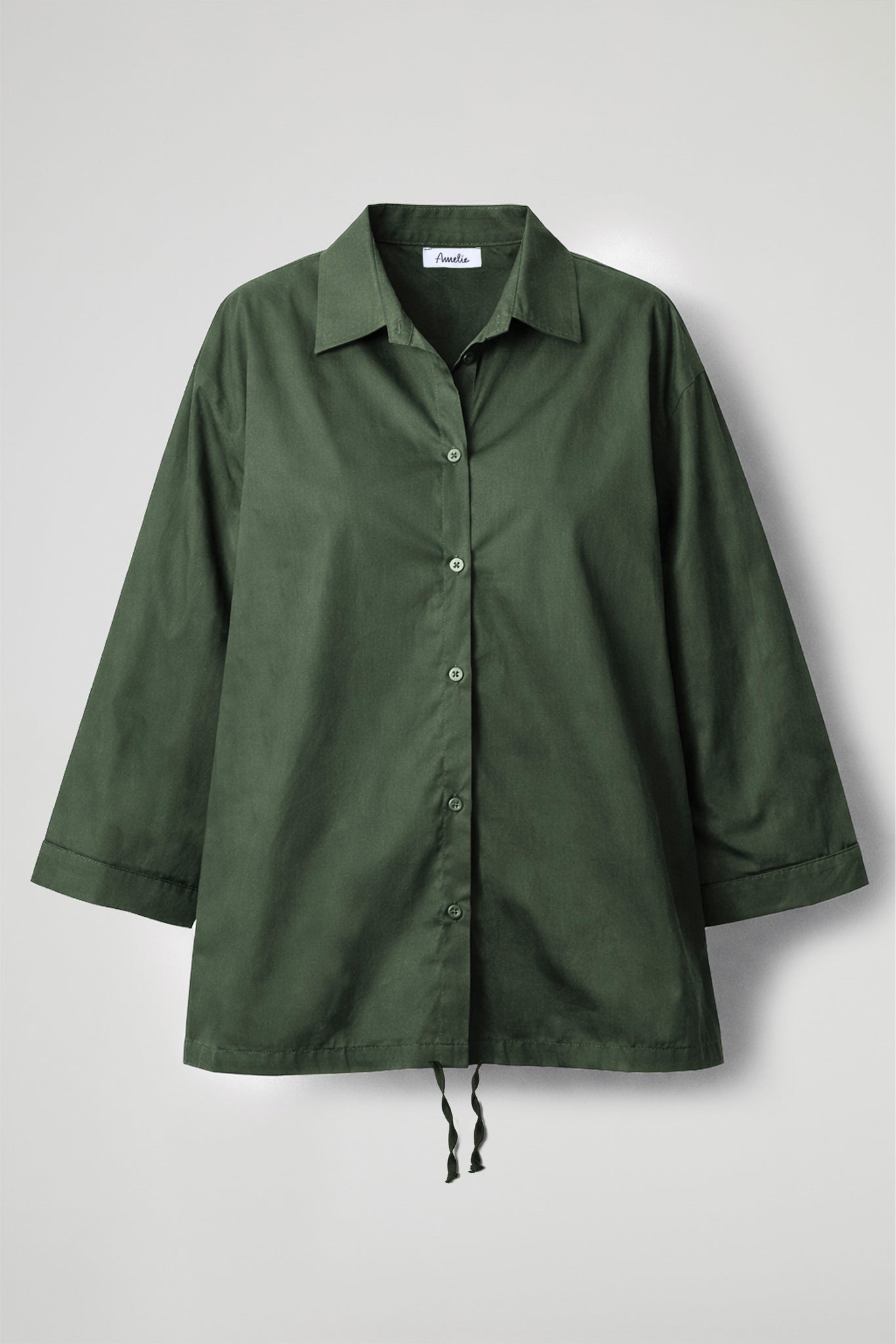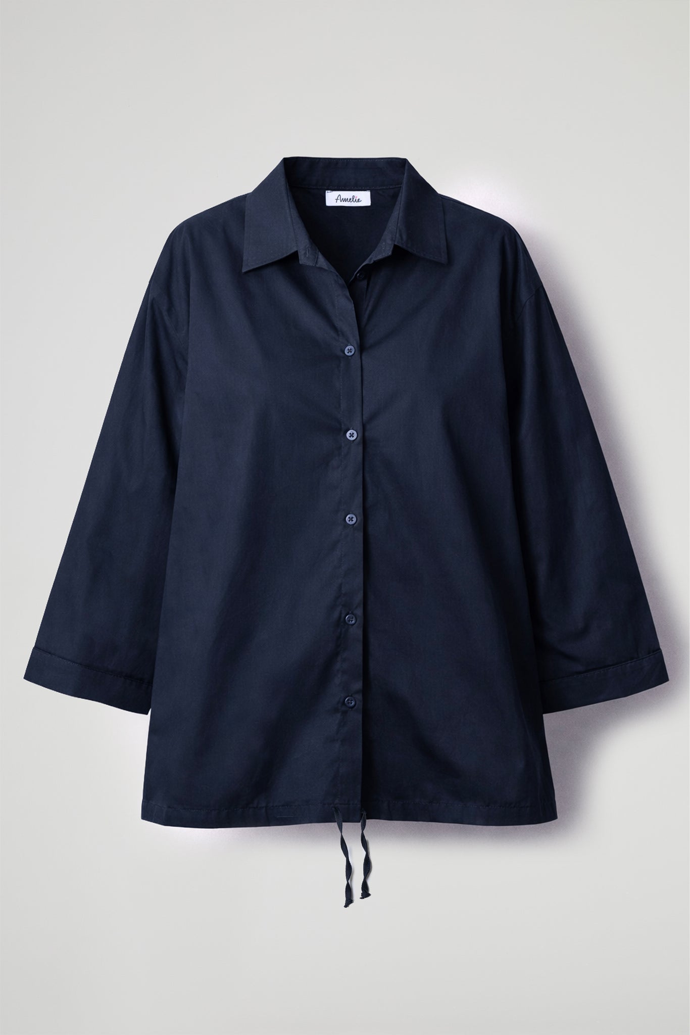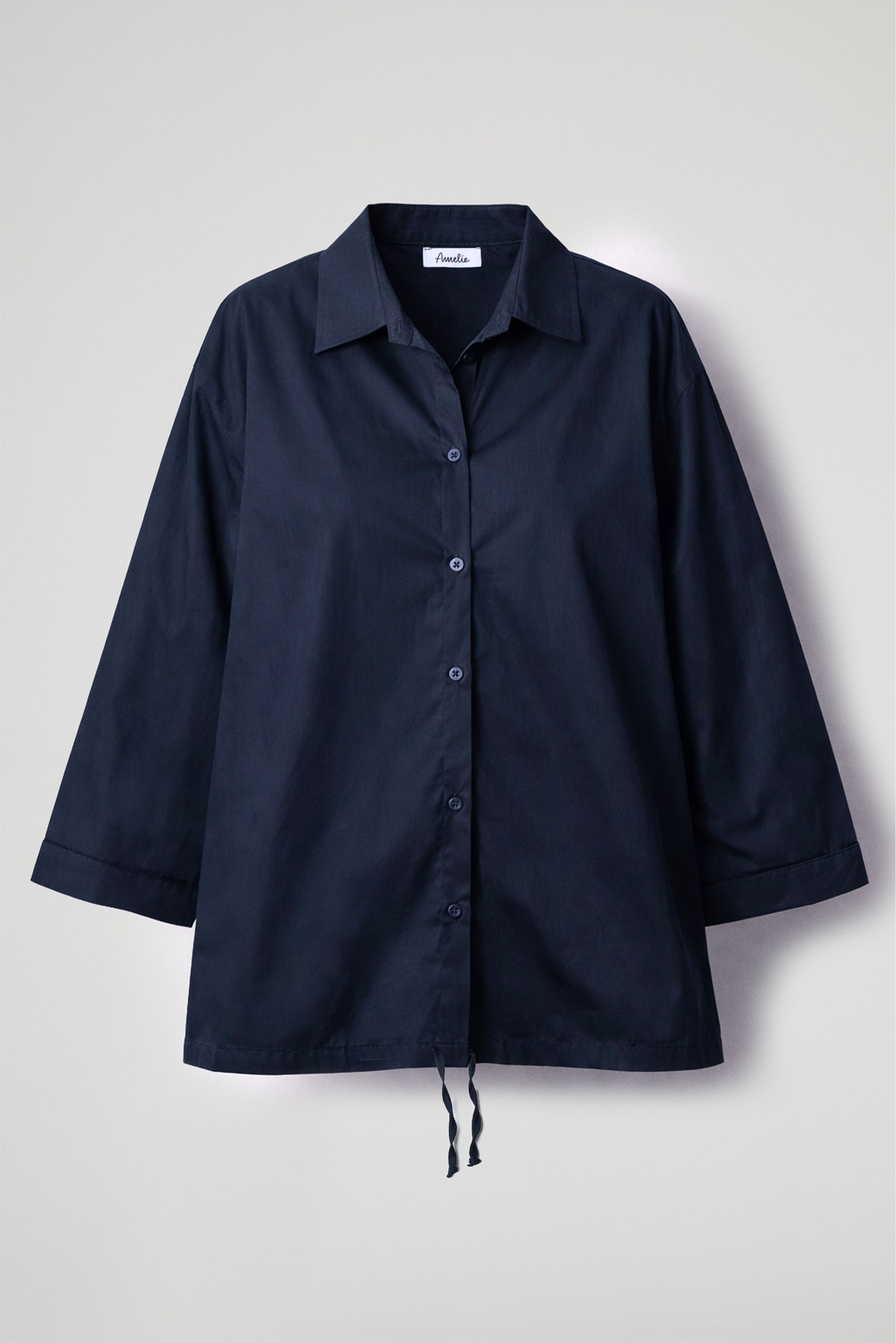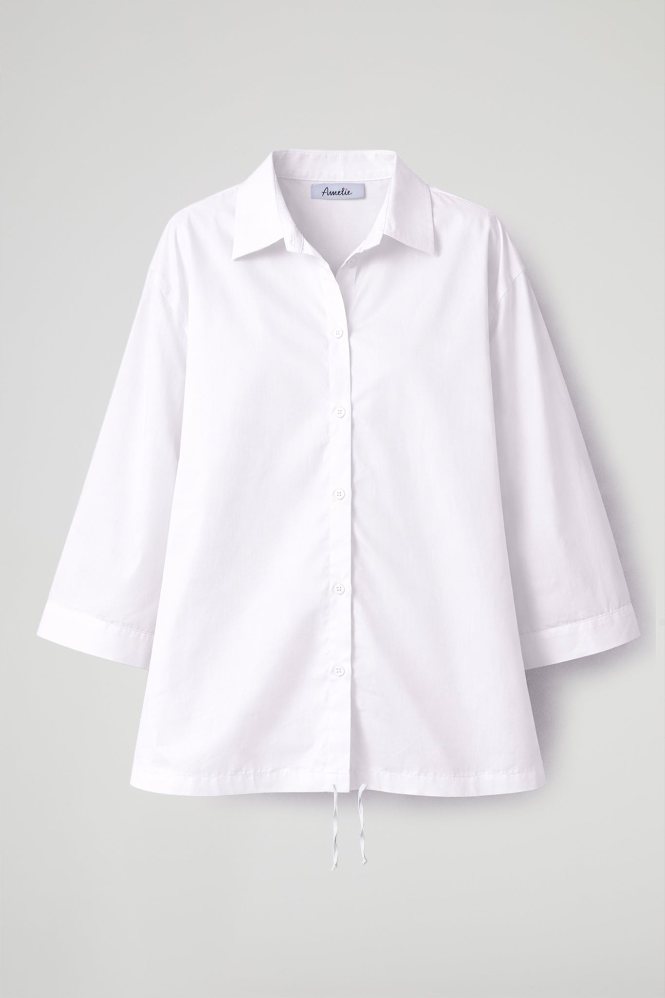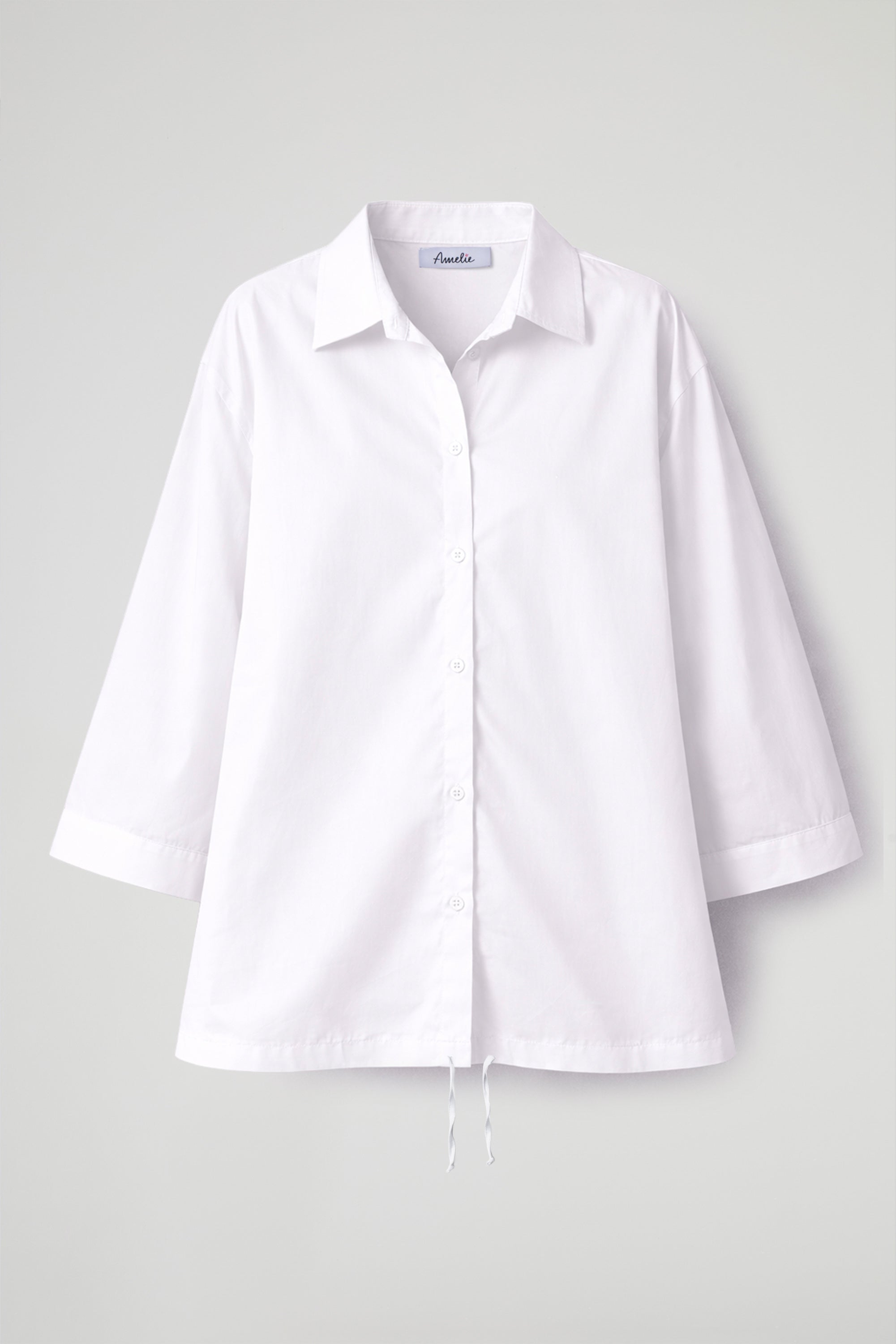 Camicia asimmetrica in popeline di cotone, colletto classico, maniche a  ¾ con orlo ribattuto, chiusura frontale con bottoni, dettaglio coulisse regolabile sul fondo, cucitura centrale sul retro. Linea morbida