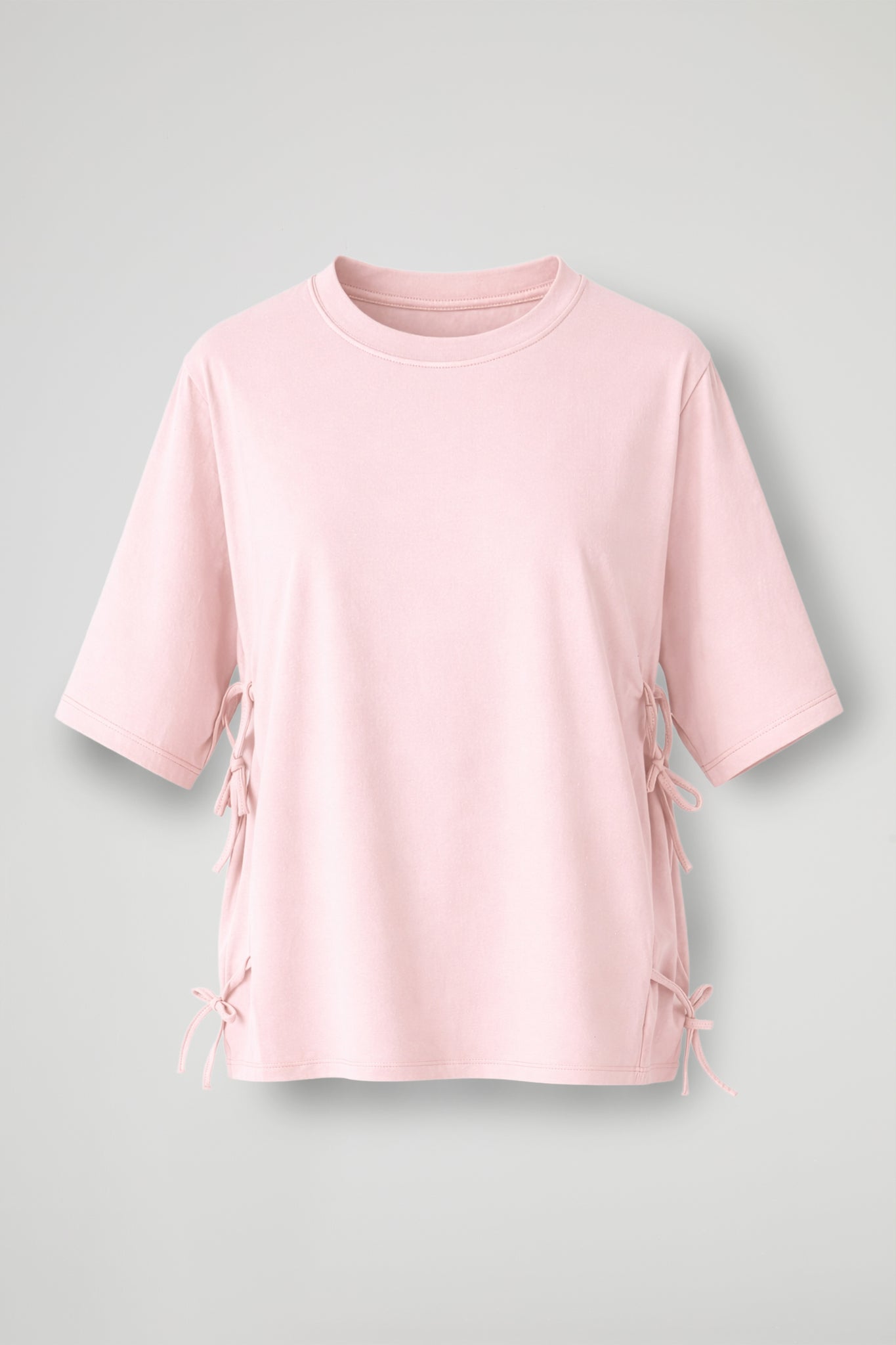 Soft cotton T-shirt, crew neck, short sleeves, adjustable drawstrings at the sides, straight fit, clean hem. Comfortable fit.