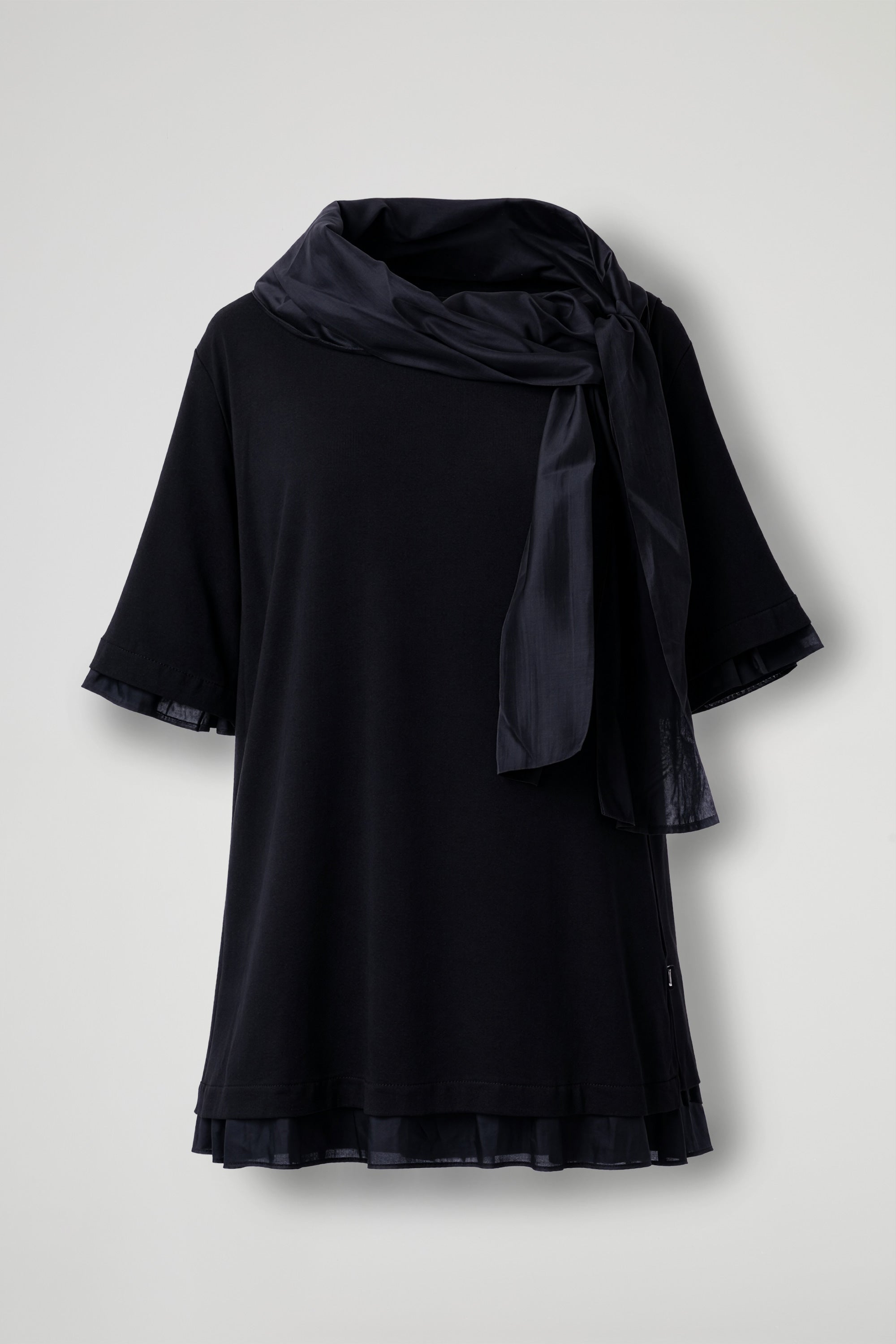 Cotton jersey top, scarf collar with side bow, short sleeves with cotton jersey applique detail, trapeze hem with cotton jersey applique detail. Soft fit