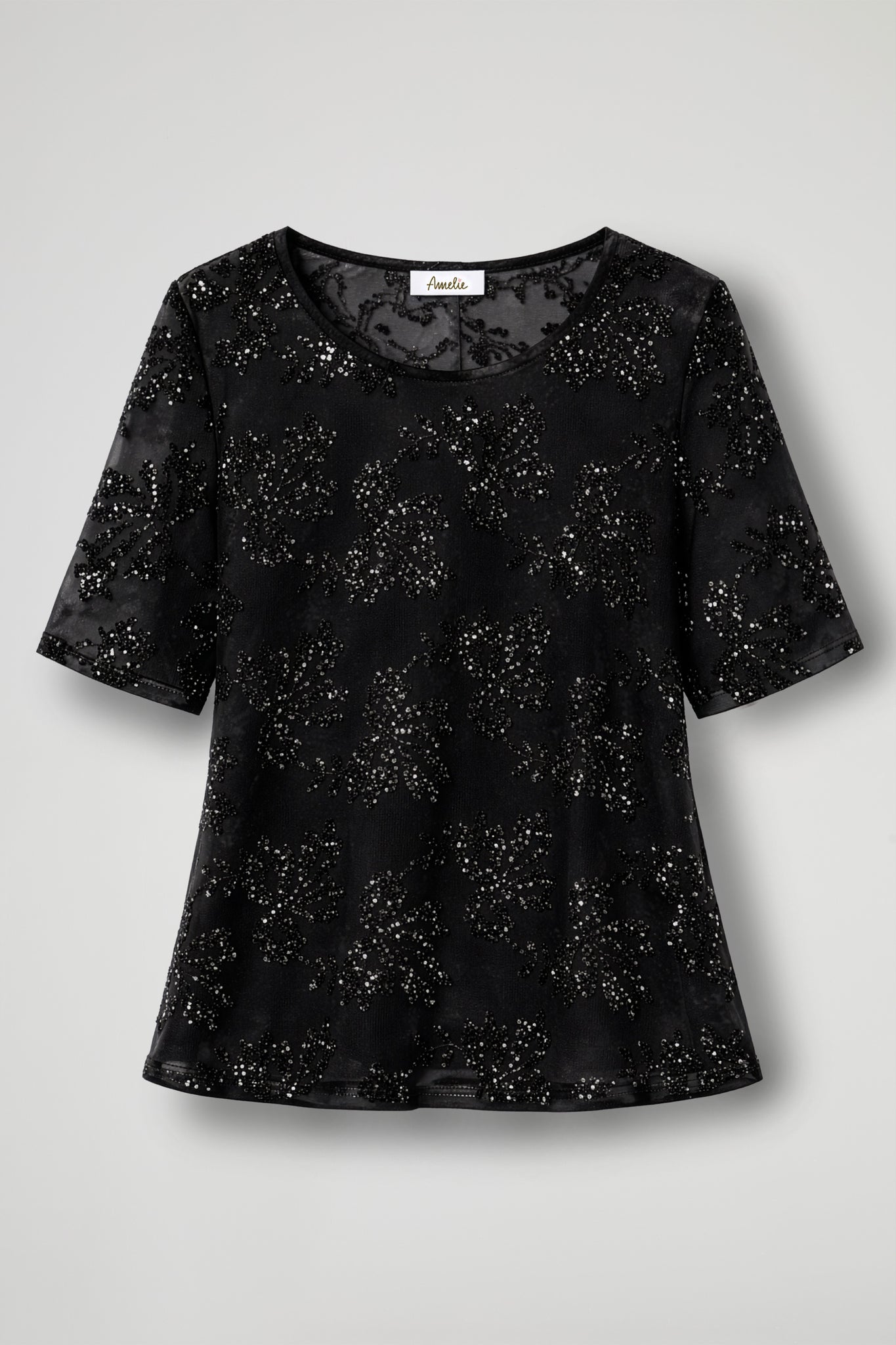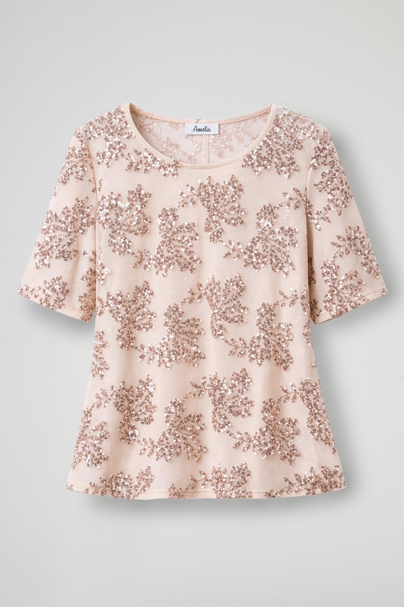 Elegant top with a bright and refined design, made from lightweight fabric embellished with all-over floral sequin embroidery; The model features a soft and slightly boxy cut, with short sleeves and a crew neck, for a comfortable and contemporary fit. The intricate workmanship adds brilliance and makes the garment ideal for special occasions or for creating sophisticated outfits.