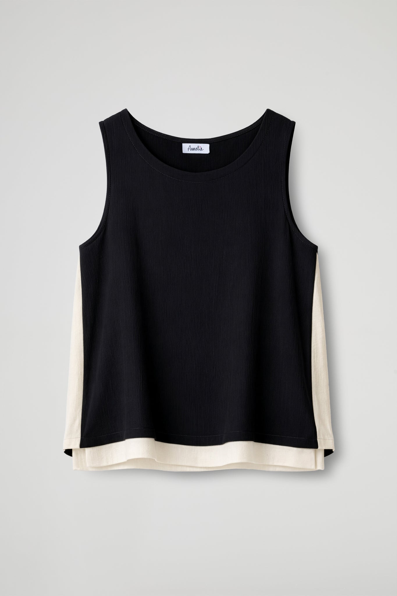Top smanicato dal design contemporaneo, realizzato in tessuto leggero e leggermente trasparente, con una texture delicatamente stropicciata che dona movimento al capo; Il modello presenta uno scollo rotondo e una linea morbida e fluida, pensata per offrire comfort e vestibilità rilassata; il capo è valorizzato da inserti a contrasto in tonalità più chiare lungo i fianchi e il fondo, che creano un elegante gioco cromatico.