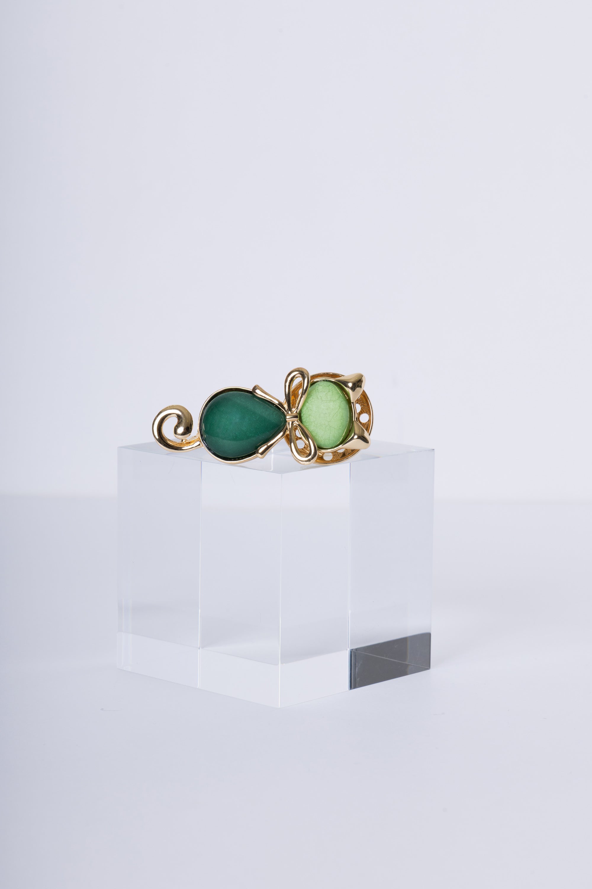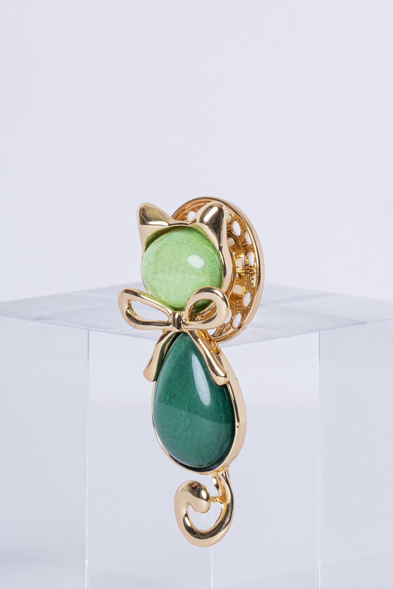 Spilla a forma di gattino con finitura dorata e pietre verdi: elegante, originale, perfetta per dare carattere a qualsiasi look.