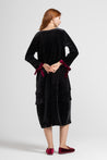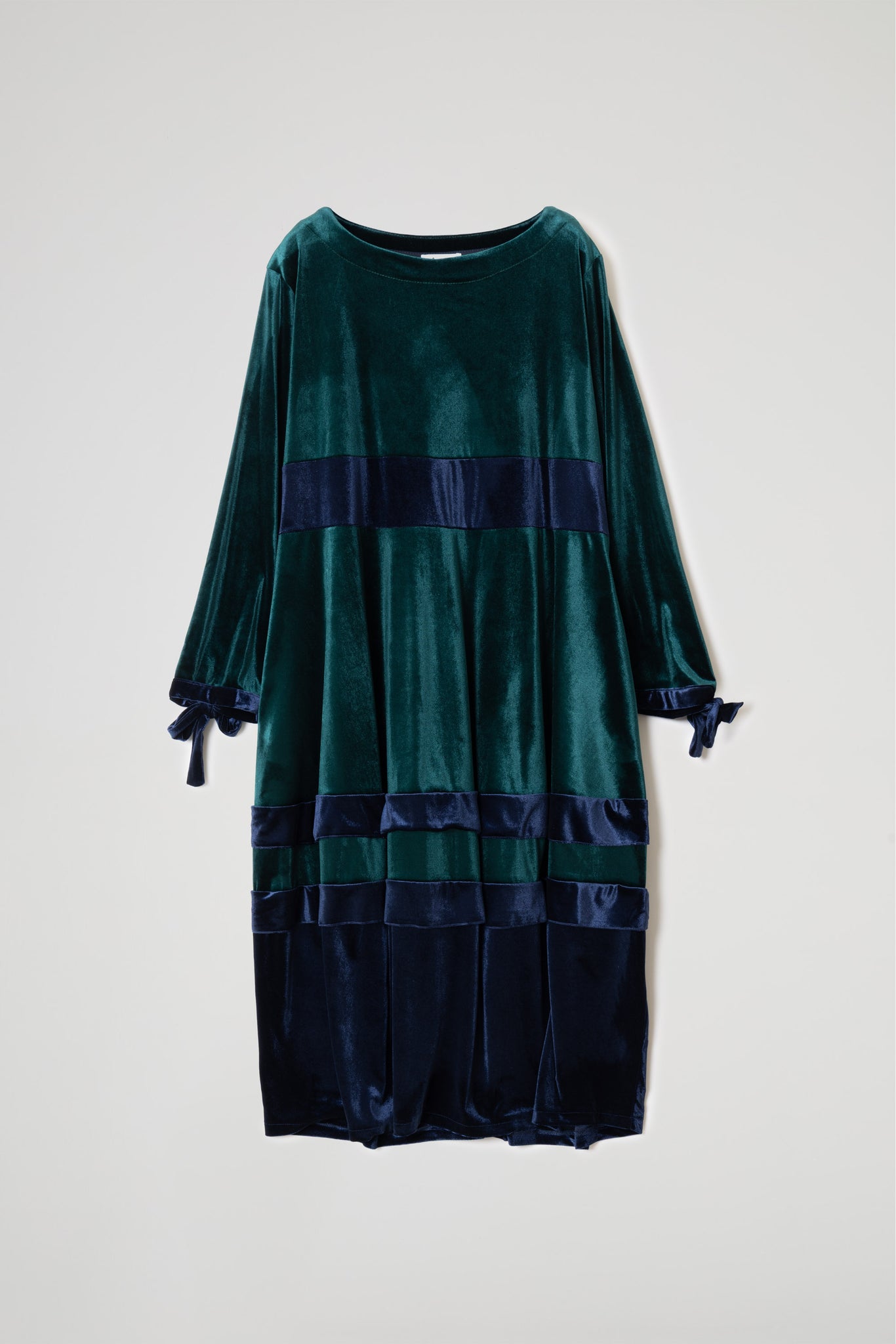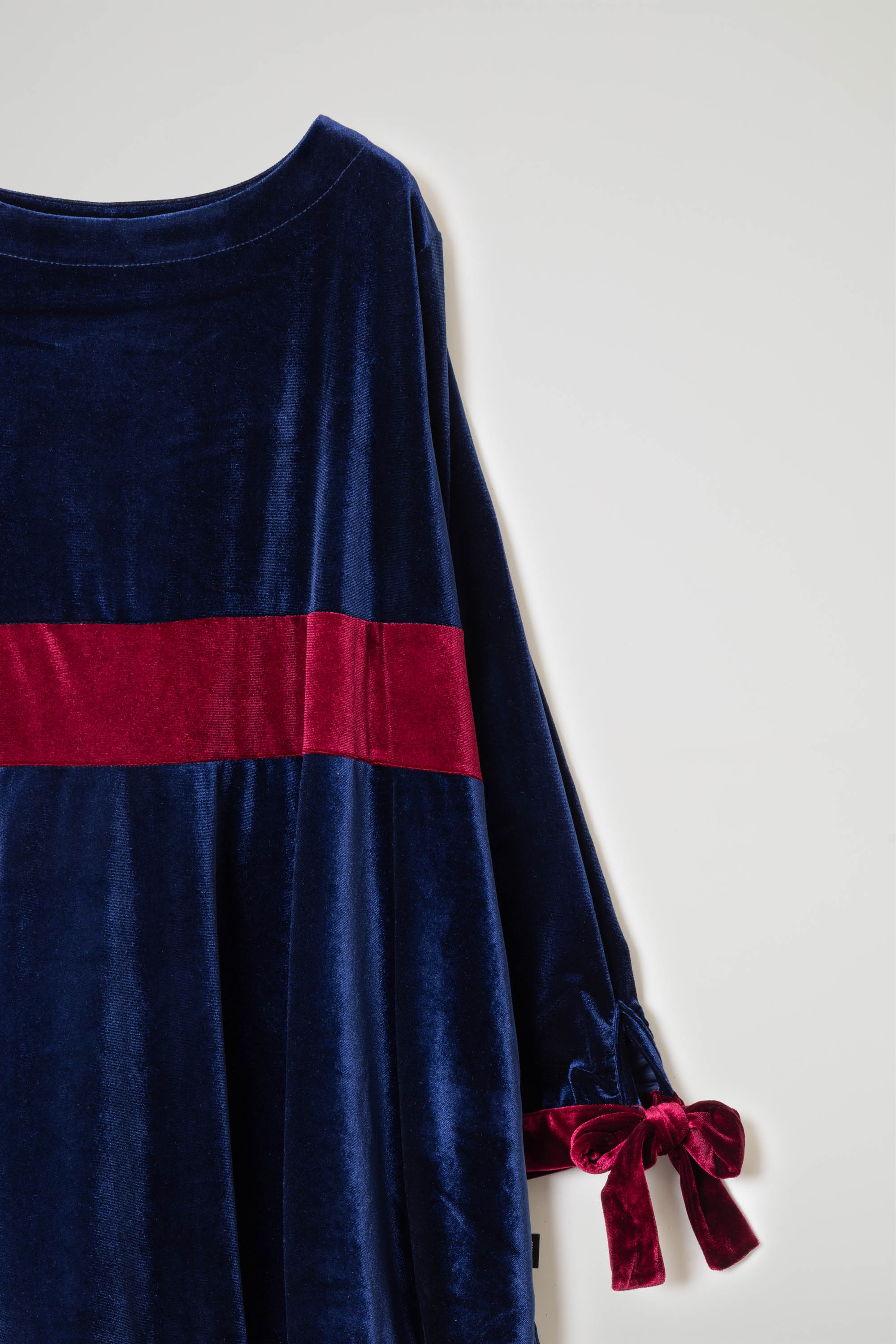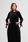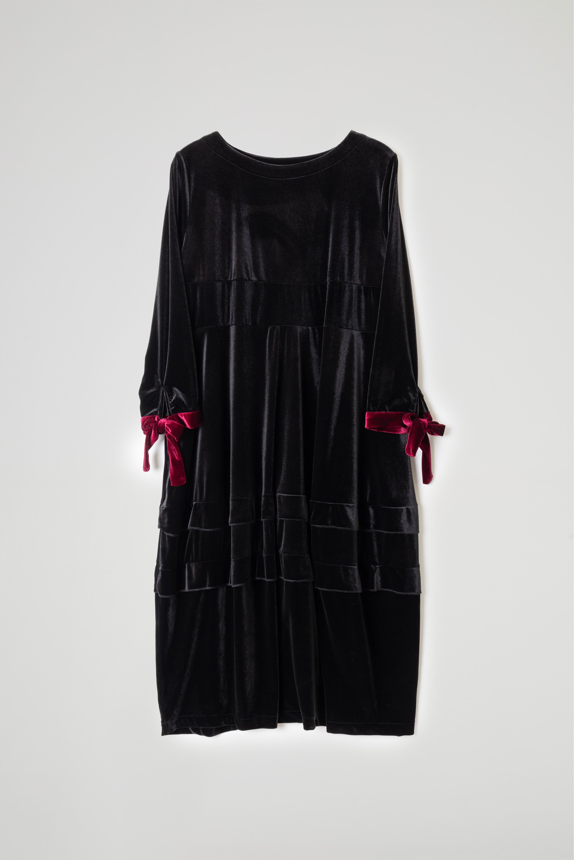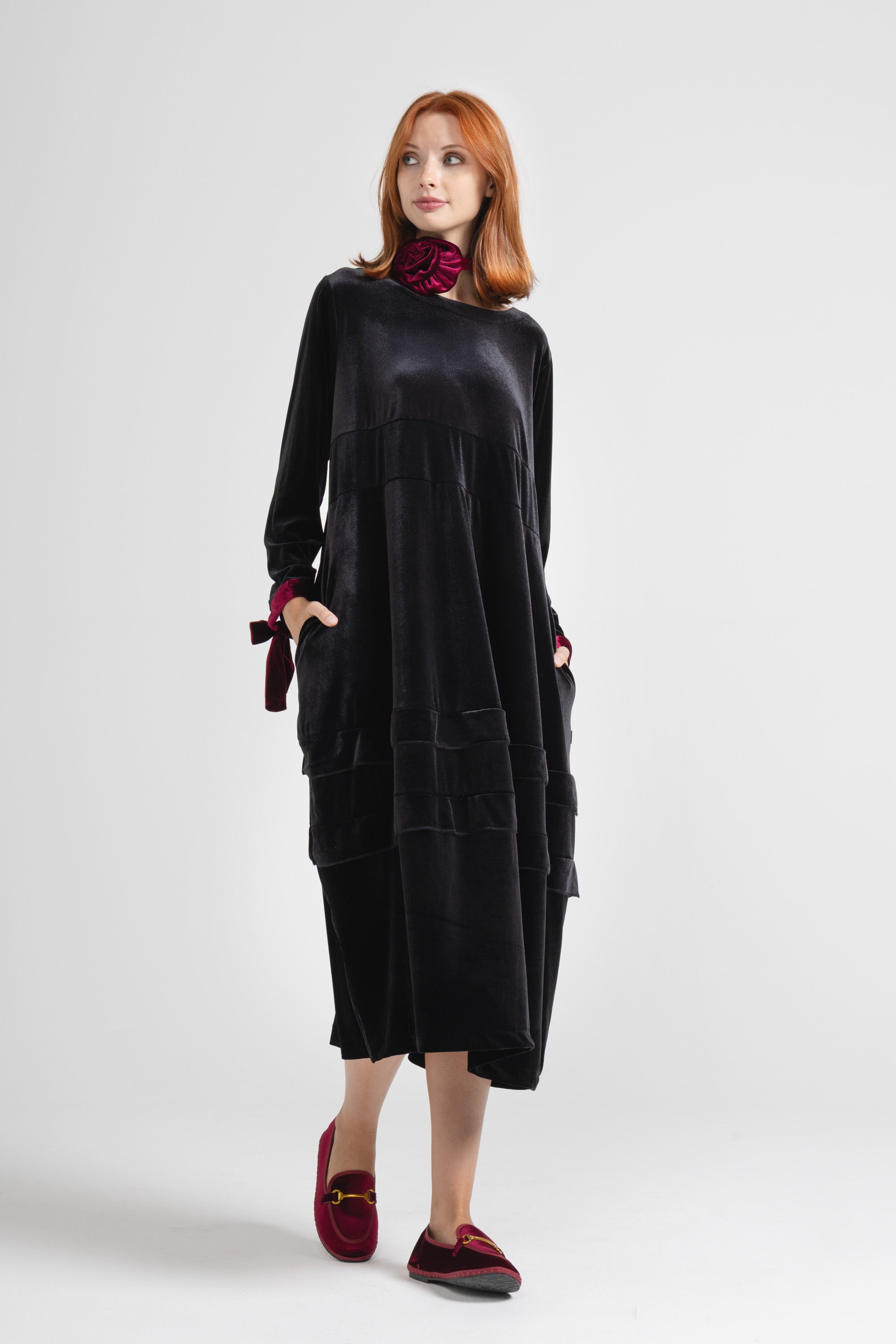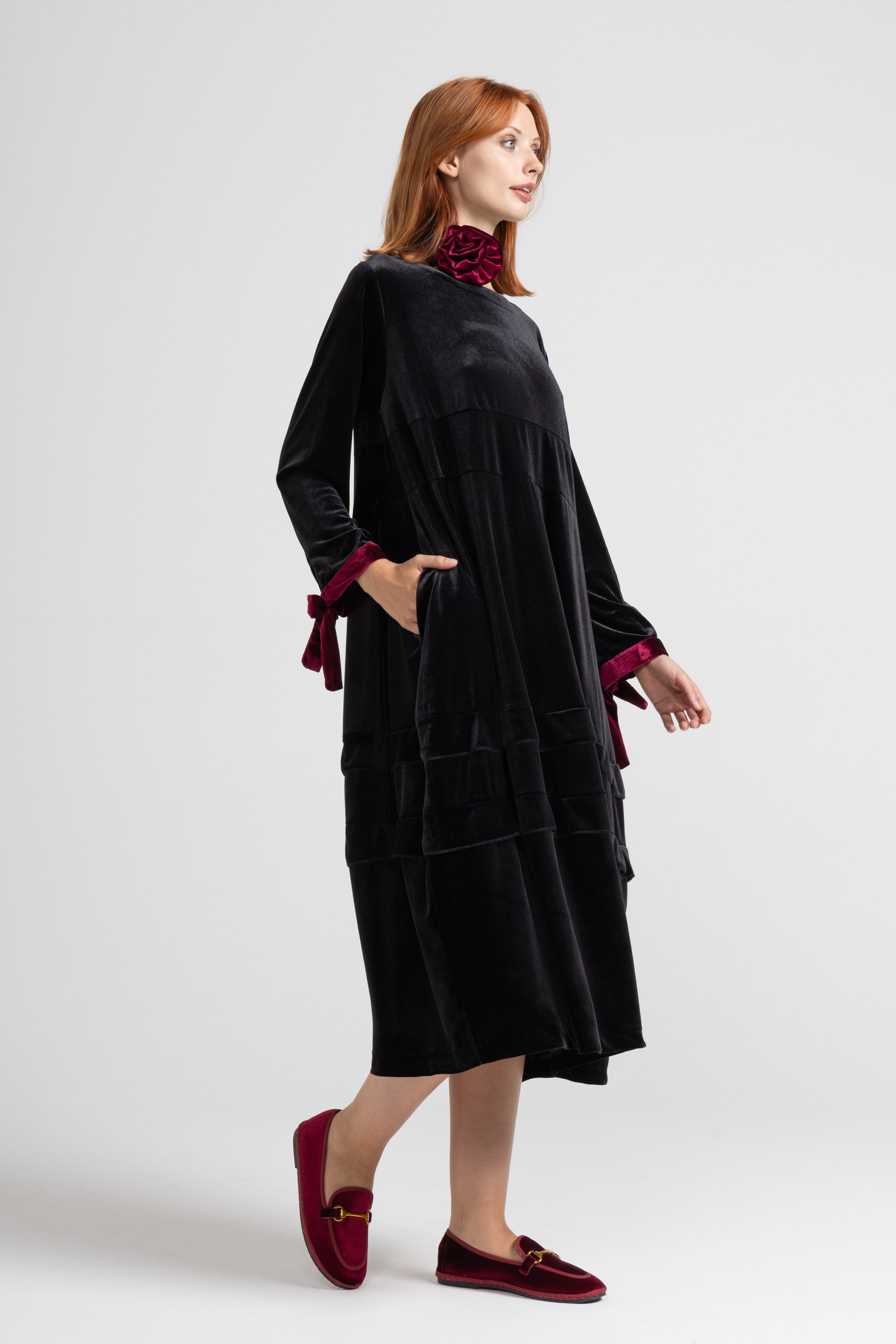 ABITO LUNGO LINEA AD OVETTO IN TESSUTO DI VELLUTO ELASTICIZZATO, MANICA LUNGA CON POLSO CON FIOCCO REGOLABILE, DETTAGLIO BALZE, AMPIO SCOLLO A BARCA RIBATTUTO ALTO.
