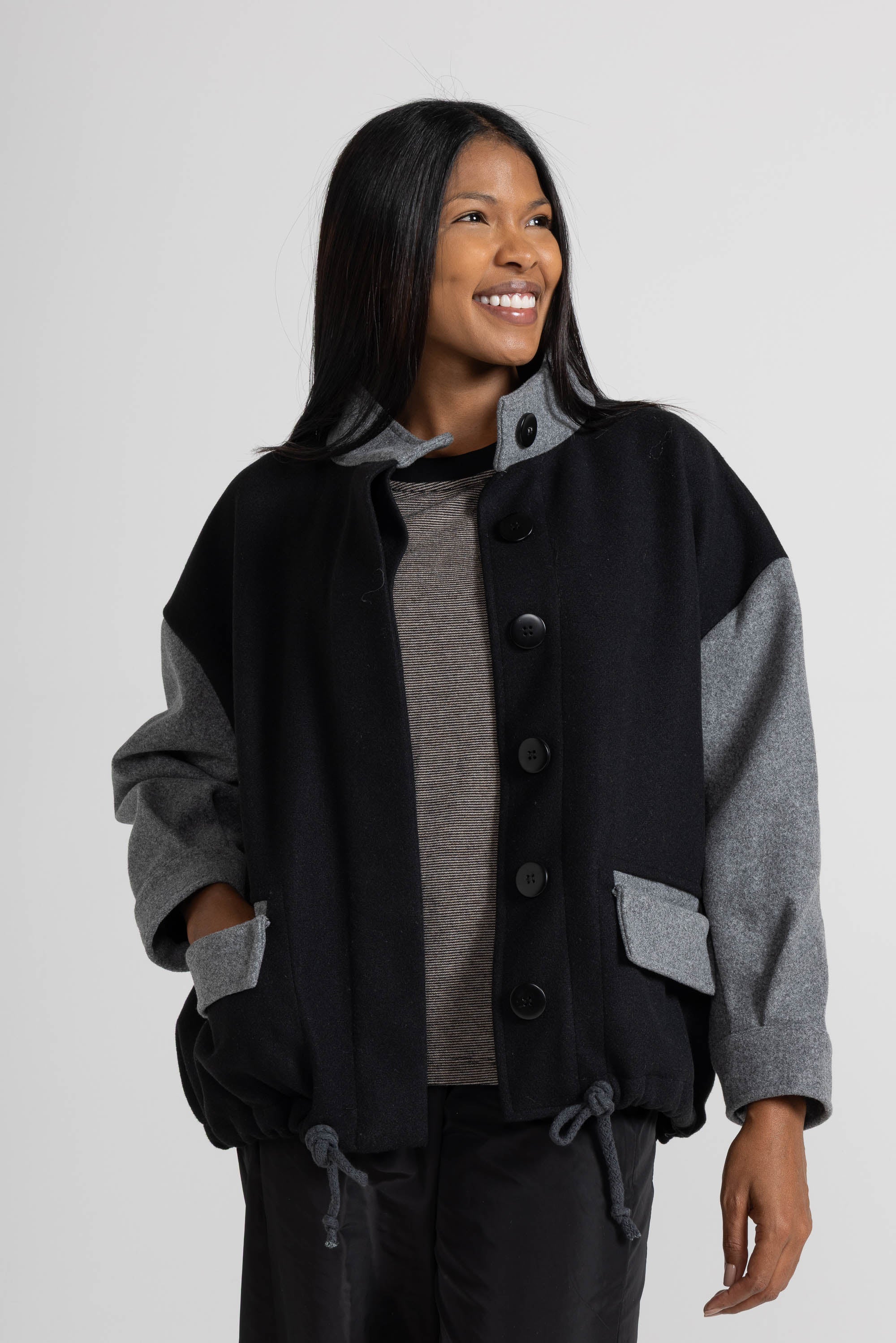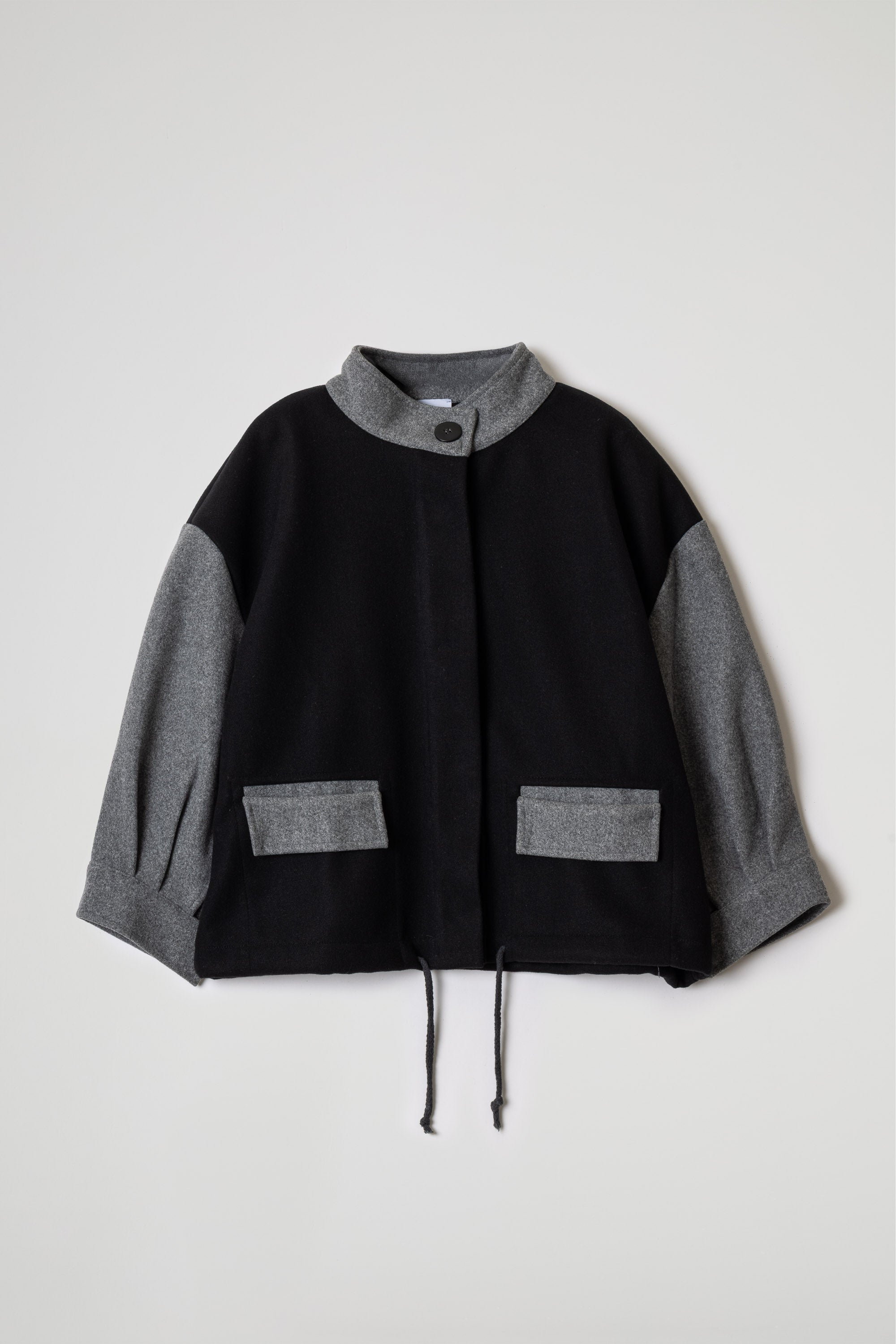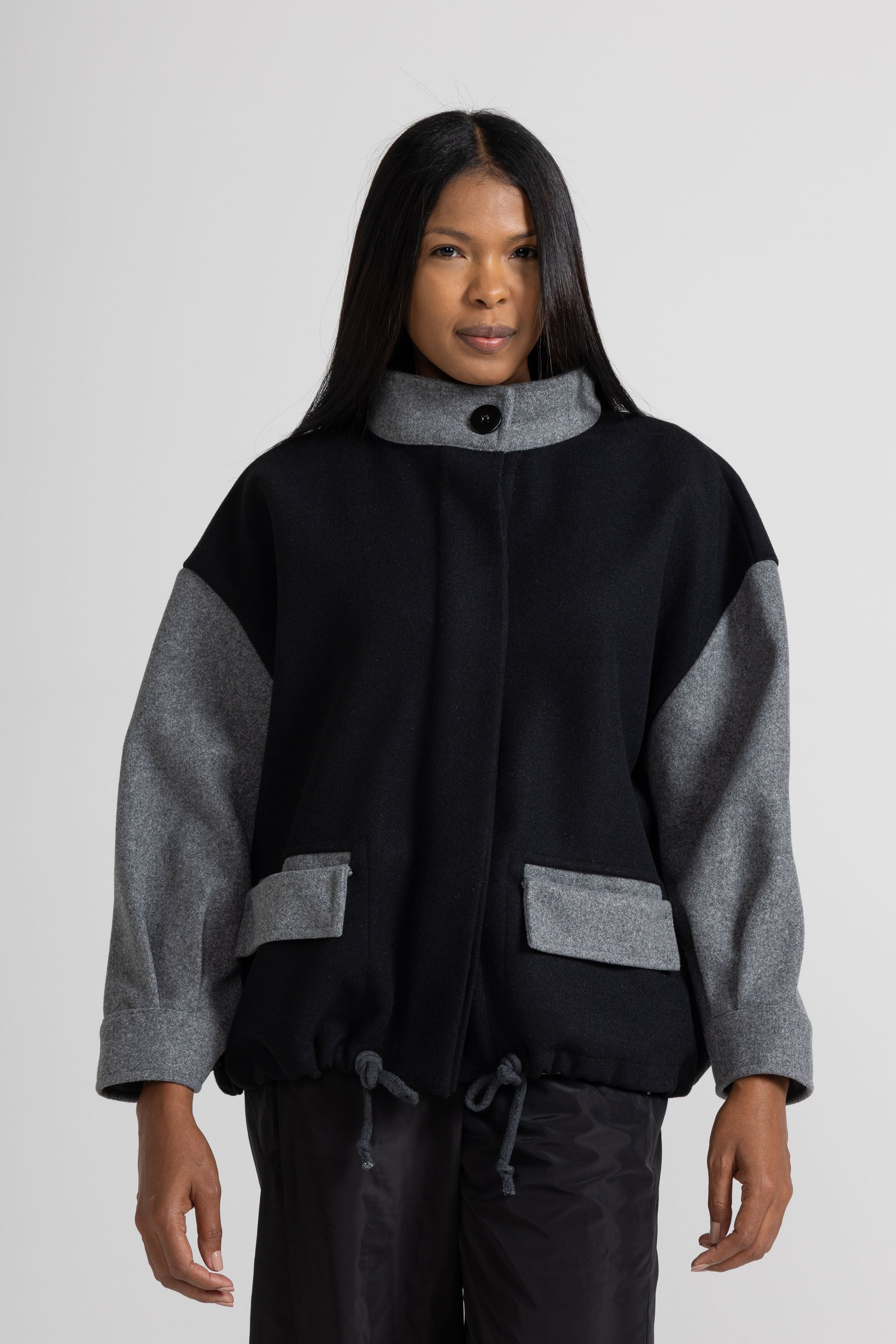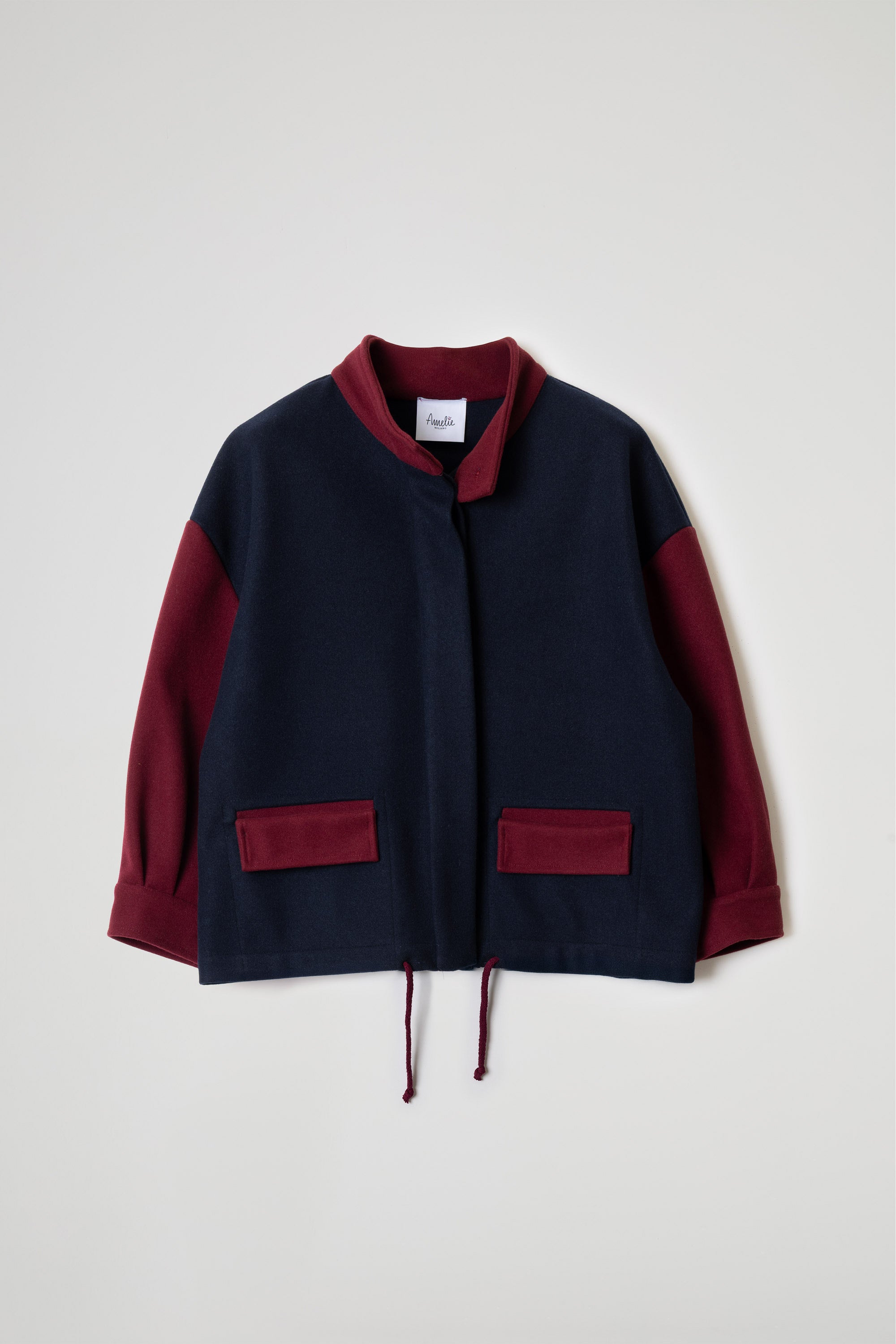 BOMBER IN TESSUTO DI PANNO DI LANA, MANICA LUNGA, POLSO RIBATTUTO ALTO, COLLO ALTO AD ANELLO, TASCA A TOPPA CON PATTINA ROVESCIATA, CHIUSURA CON BOTTONI E MOSTRA A CORPIRE, MAXI CORDA REGOLABILE SU FONDO. OFFRIAMO SCELTA BICOLORE O TINTA UNITA. LINEA OVER.