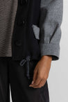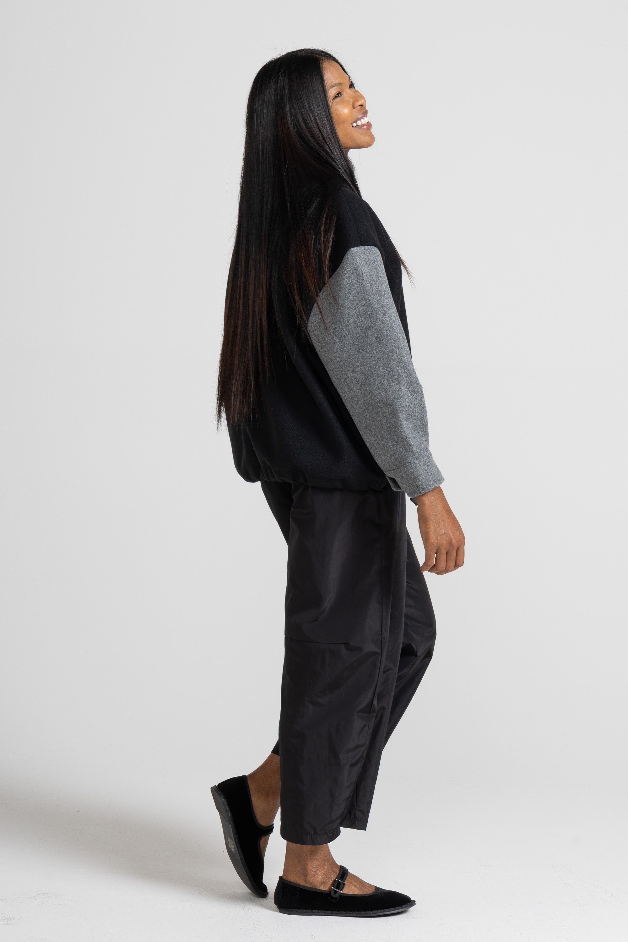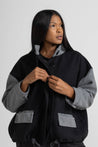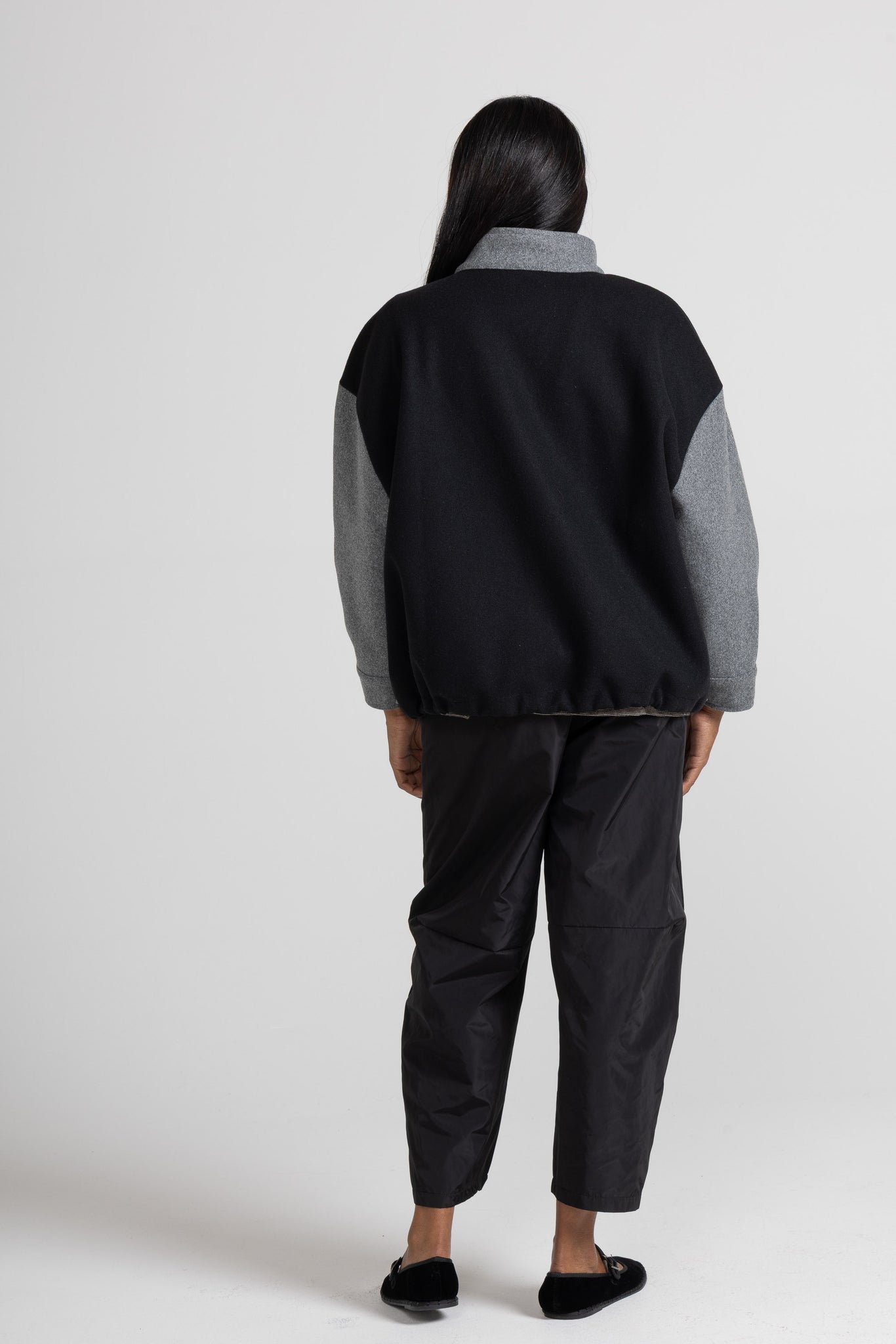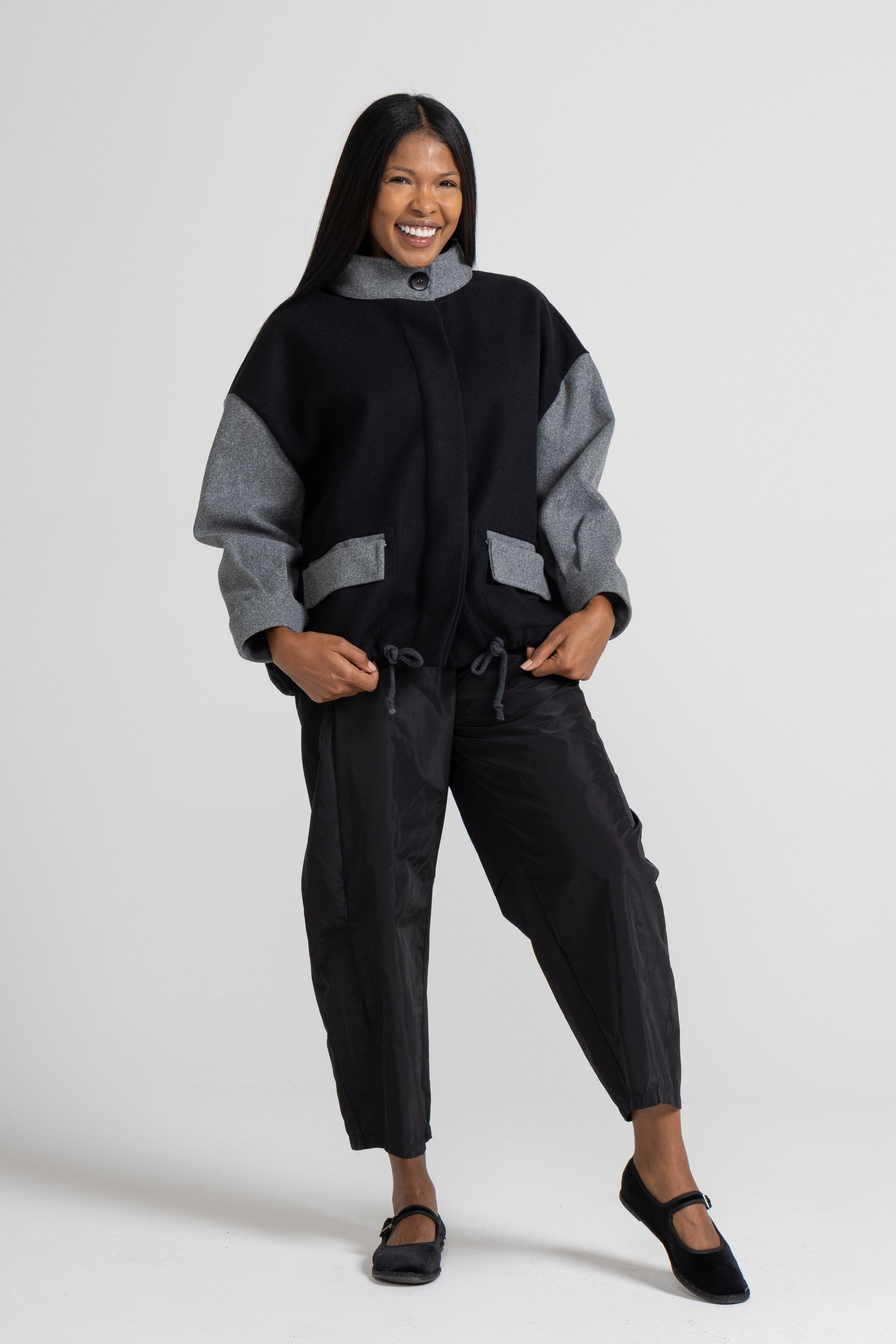 BOMBER IN TESSUTO DI PANNO DI LANA, MANICA LUNGA, POLSO RIBATTUTO ALTO, COLLO ALTO AD ANELLO, TASCA A TOPPA CON PATTINA ROVESCIATA, CHIUSURA CON BOTTONI E MOSTRA A CORPIRE, MAXI CORDA REGOLABILE SU FONDO. OFFRIAMO SCELTA BICOLORE O TINTA UNITA. LINEA OVER.