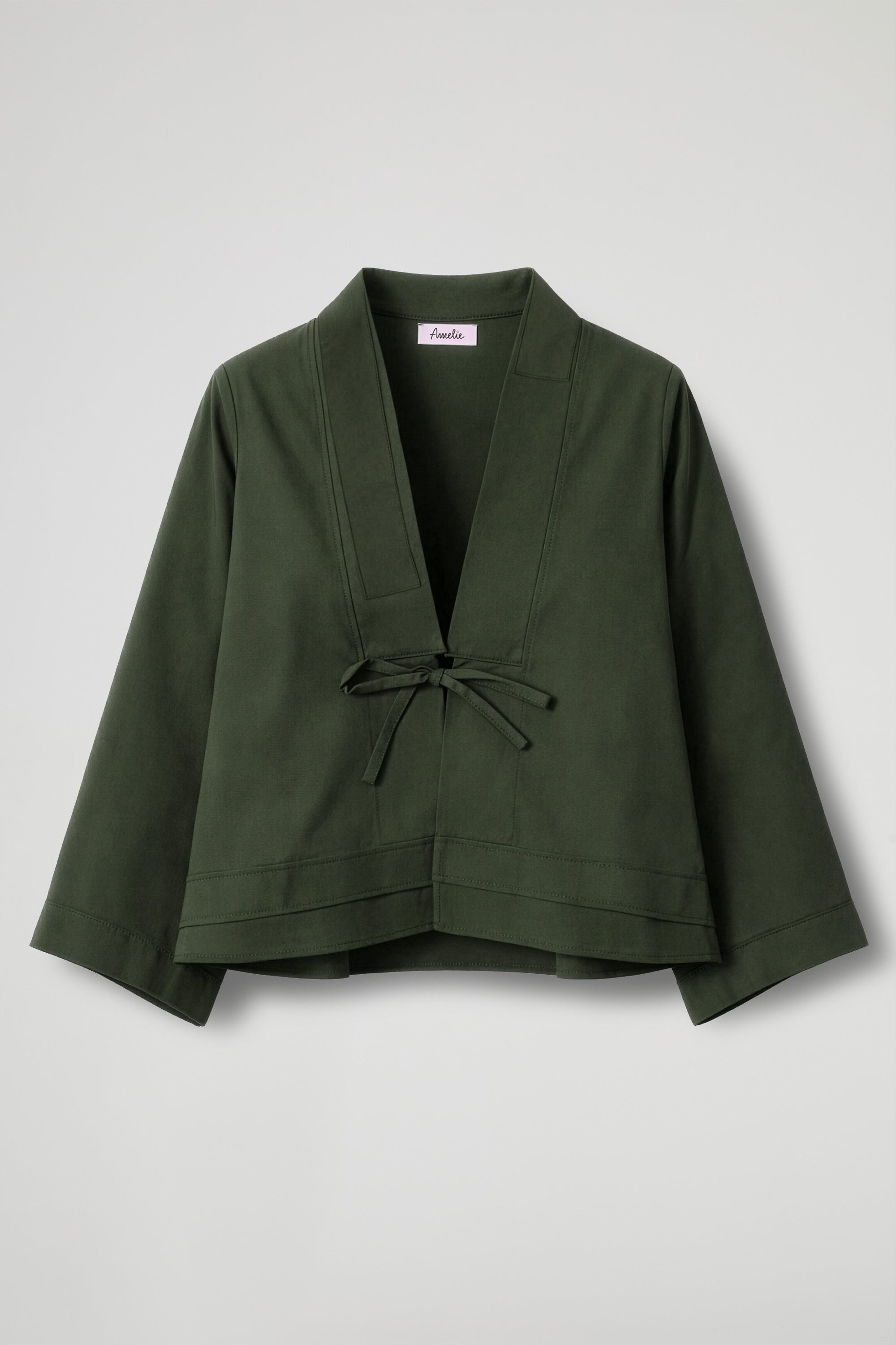 Giacca dal taglio essenziale e contemporaneo, realizzata in tessuto dalla mano morbida e struttura leggera. Il modello presenta una silhouette corta e leggermente svasata, con scollo a V e rever ampi che valorizzano la linea del capo. La chiusura frontale con laccetto annodato aggiunge un dettaglio delicato e femminile. Le maniche ampie a tre quarti e le impunture a vista completano il design, conferendo un tocco moderno e raffinato. Ideale per completare look eleganti ma disinvolti.
