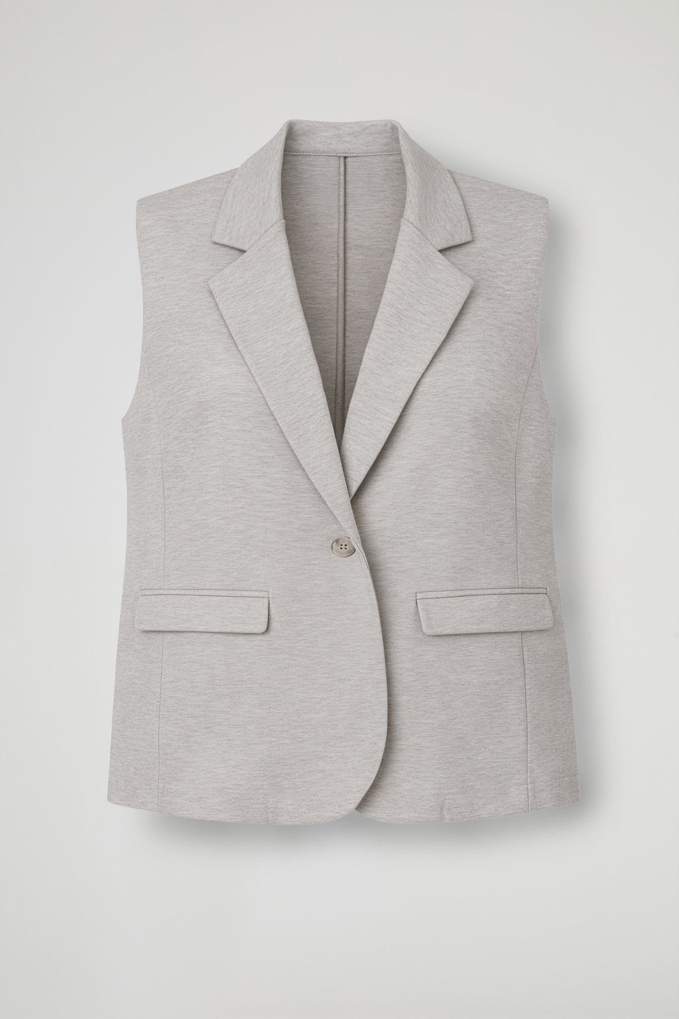 Gilet smanicato in punto Milano, collo a rever classico, chiusura con bottone, tasche con pattina, spacco sul retro. Linea confortevole