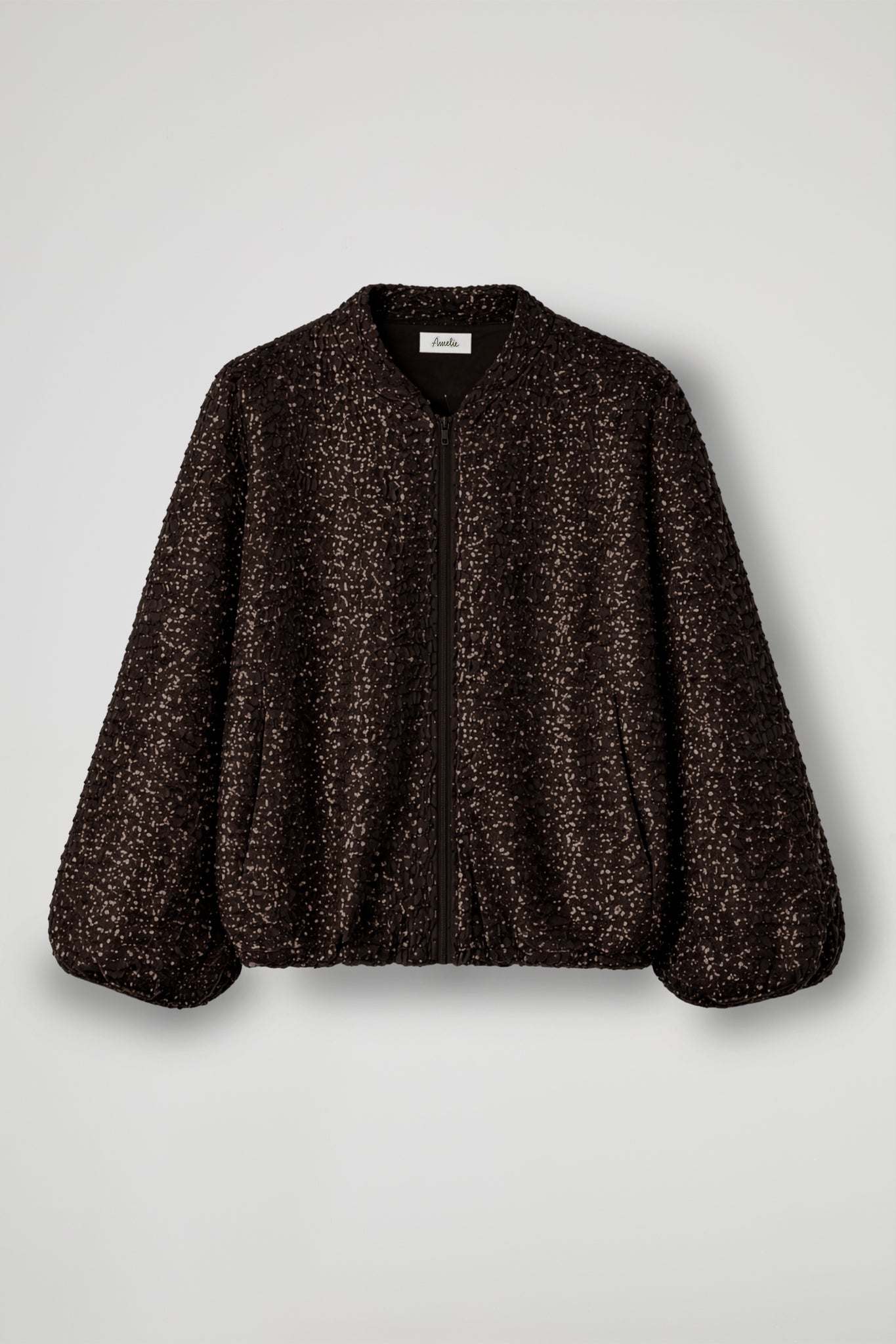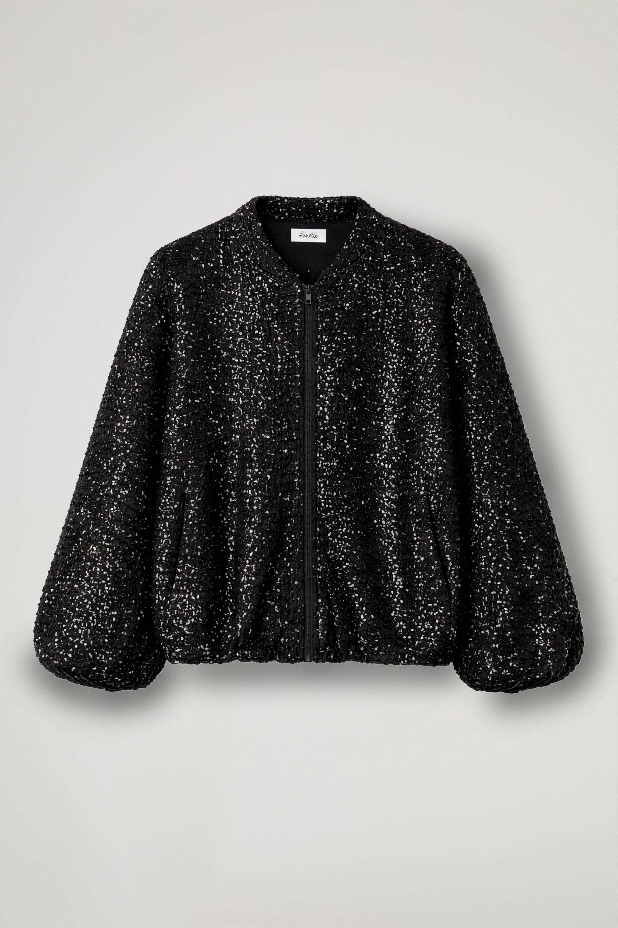 Bomber in paillettes dal fascino raffinato, dalla linea morbida e confortevole; la chiusura frontale con zip aggiunge praticità e un tocco moderno, mentre la superficie interamente ricoperta di paillettes dona brillantezza e rende il capo perfetto per occasioni speciali o per valorizzare anche outfit quotidiani.