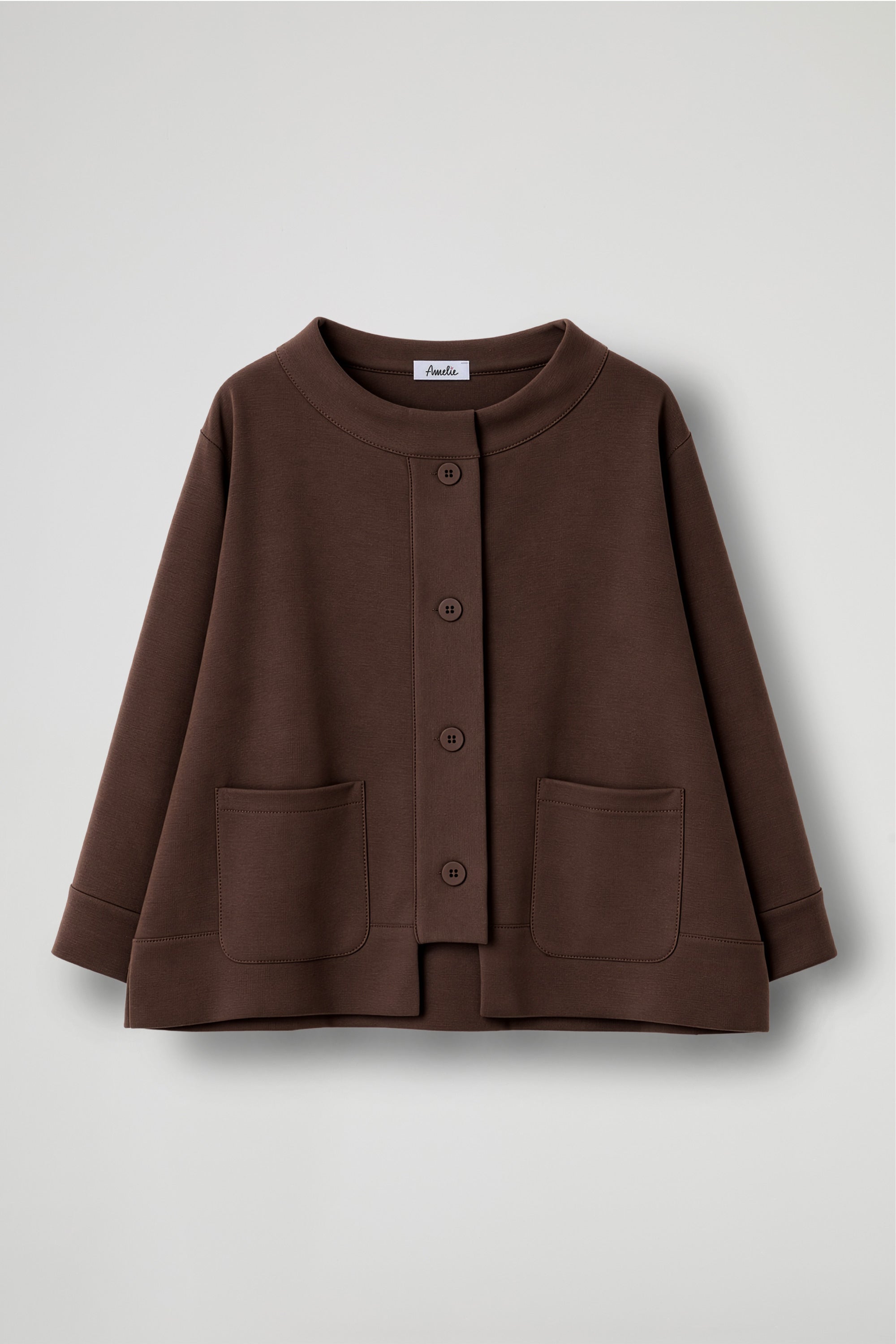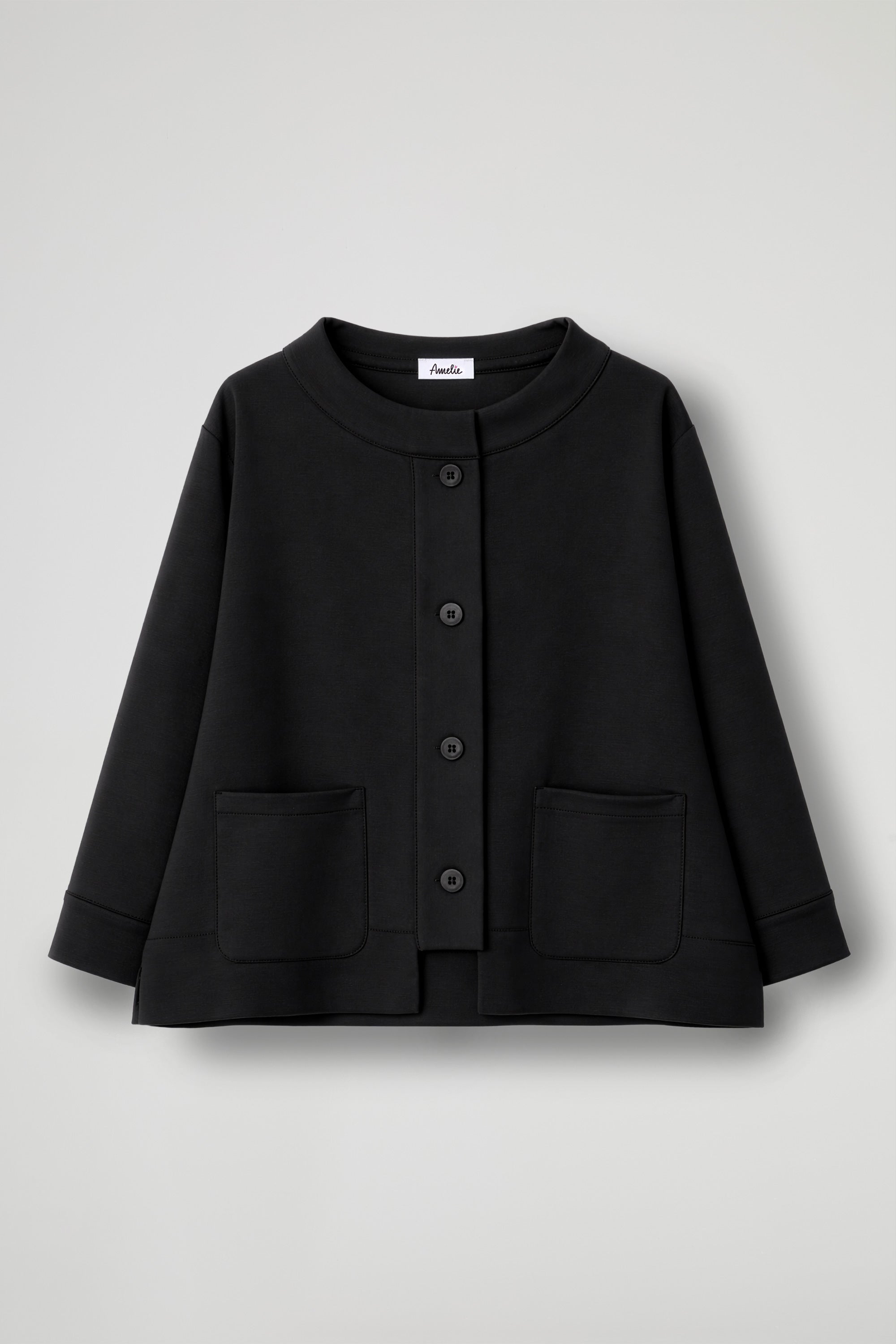 Giacca corta dal carattere raffinato e contemporaneo, perfetta per completare con stile ogni outfit. Realizzata in tessuto strutturato ma confortevole, presenta una linea leggermente svasata che dona movimento e valorizza la silhouette, lo scollo ampio dal taglio pulito aggiunge un tocco sofisticato, mentre la chiusura frontale con bottoni a vista crea un elegante gioco grafico. Le ampie tasche applicate sul davanti uniscono estetica e funzionalità, rendendo il capo pratico oltre che ricercato.