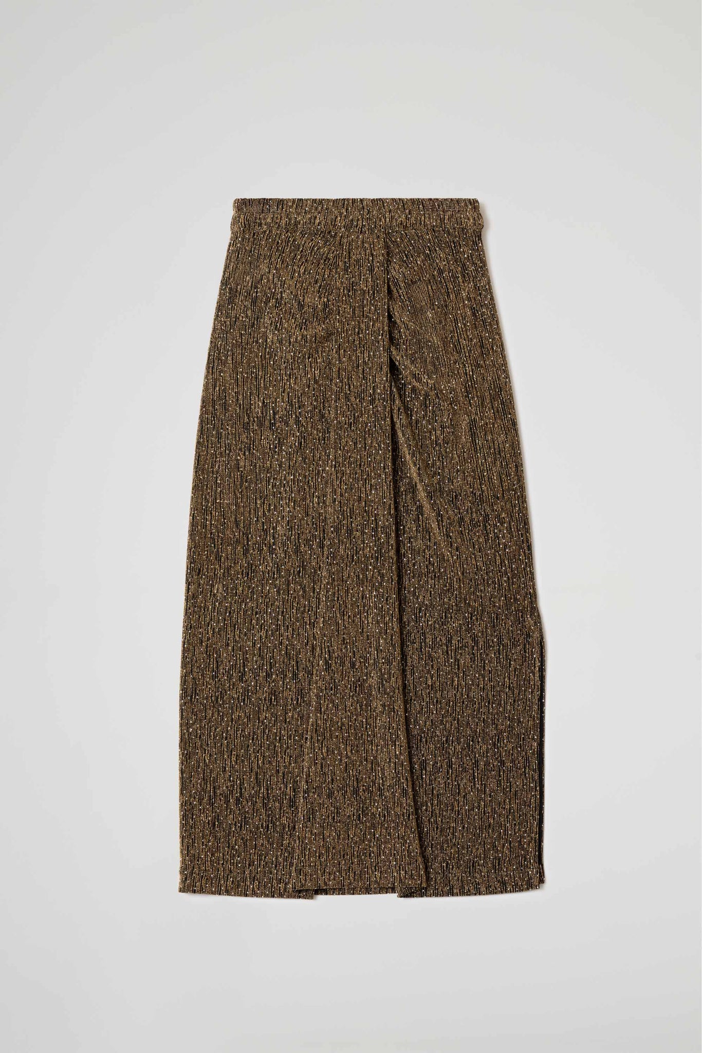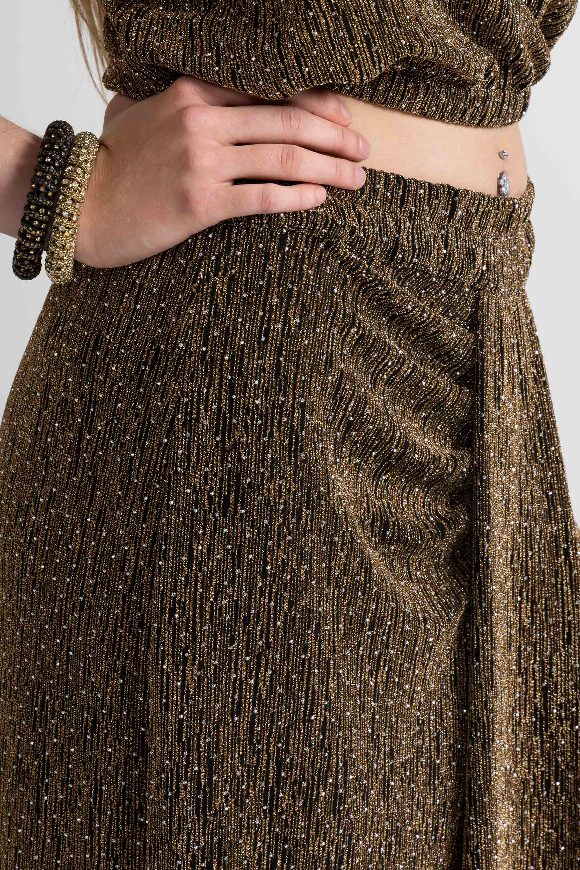 Gonna realizzata in un tessuto lurex con filati dorati e neri intrecciati, cattura la luce ad ogni movimento, regalando un effetto brillante ma elegante. Il taglio morbido e fluido valorizza la silhouette con leggerezza, mentre la fascia elastica in vita garantisce una vestibilità confortevole e adattabile. Perfetto per le occasioni speciali, le serate glamour o un look da festa raffinato ma senza eccessi. Può essere abbinato a un top minimal per un outfit scintillante e contemporaneo.
