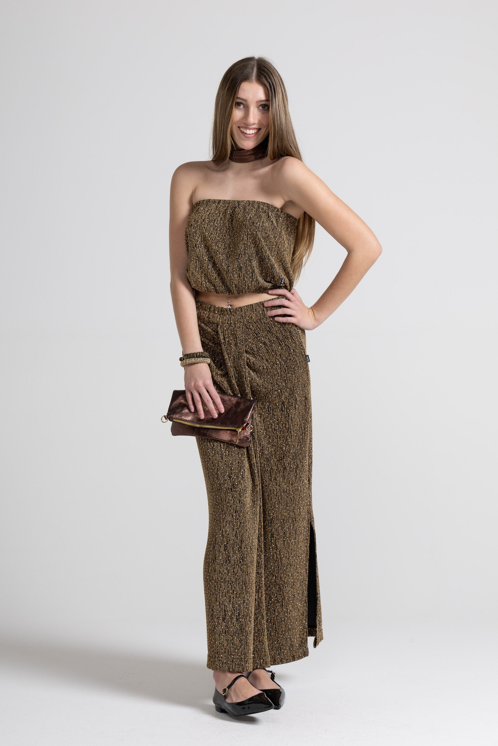 Gonna lunga, fascia elastica in vita, drappeggio sul davanti, uno spacco laterale, dettaglio tessuto lamé effetto metallizzato con micro-righe verticali scintillanti su tutto il capo. Linea  morbida.