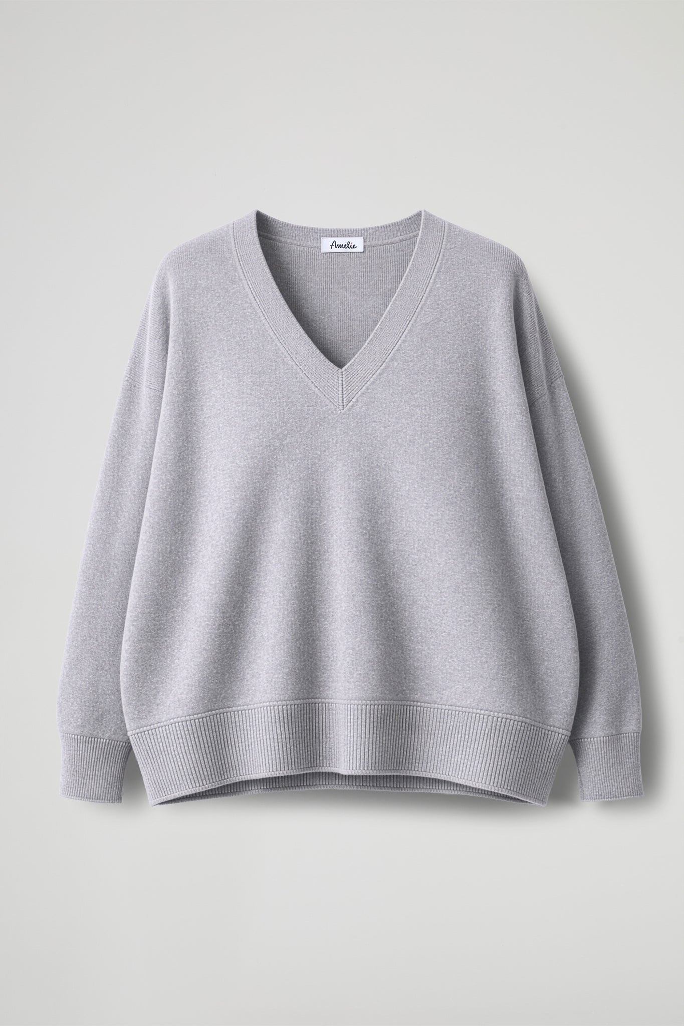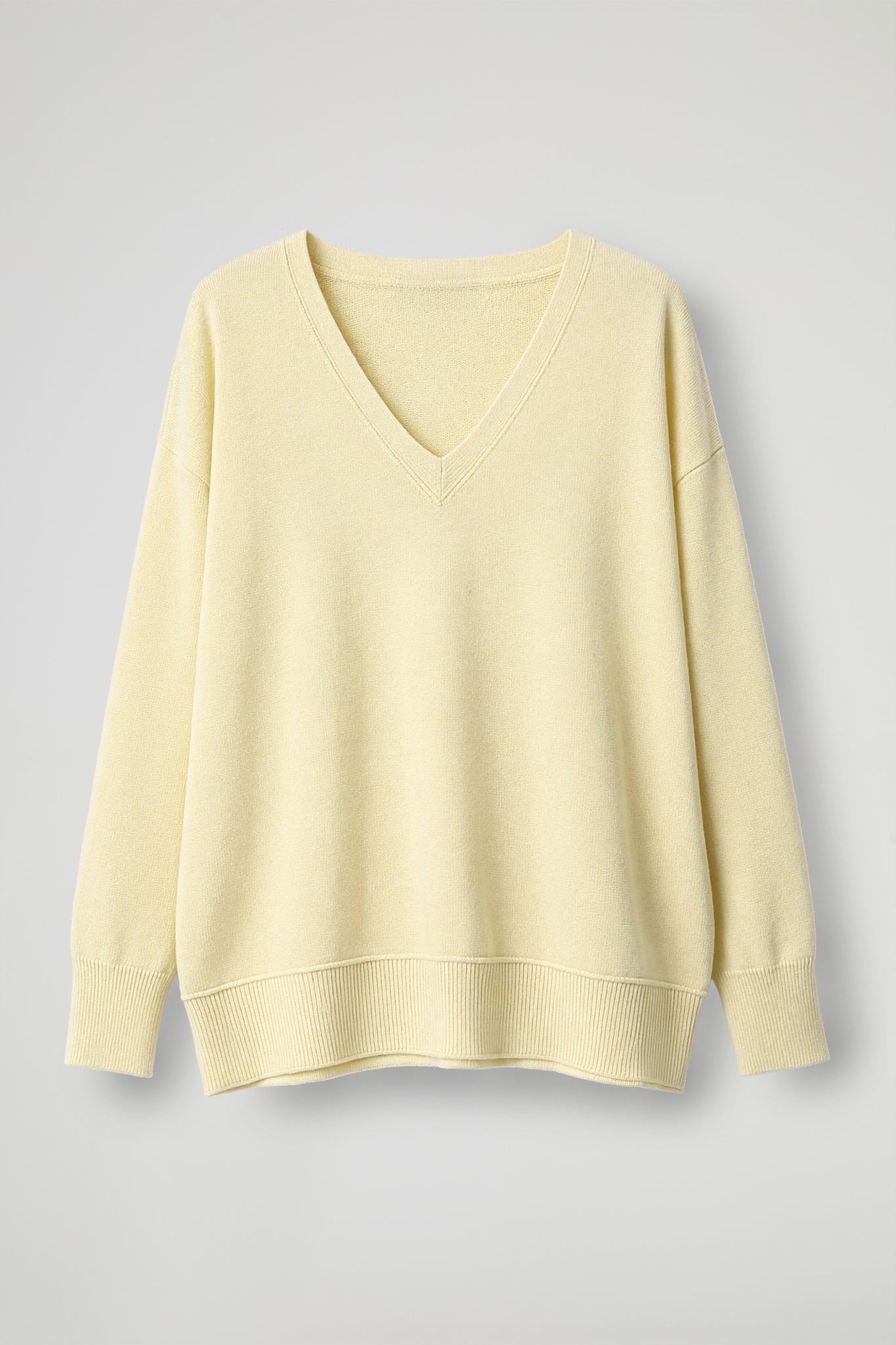 Maglia Over, scollo a V rifinito a coste, spalla scesa, manica lunga con dettaglio polsino alto a costine elasticizzato, fondo stondato con orlo alto a costine. Linea ampia.