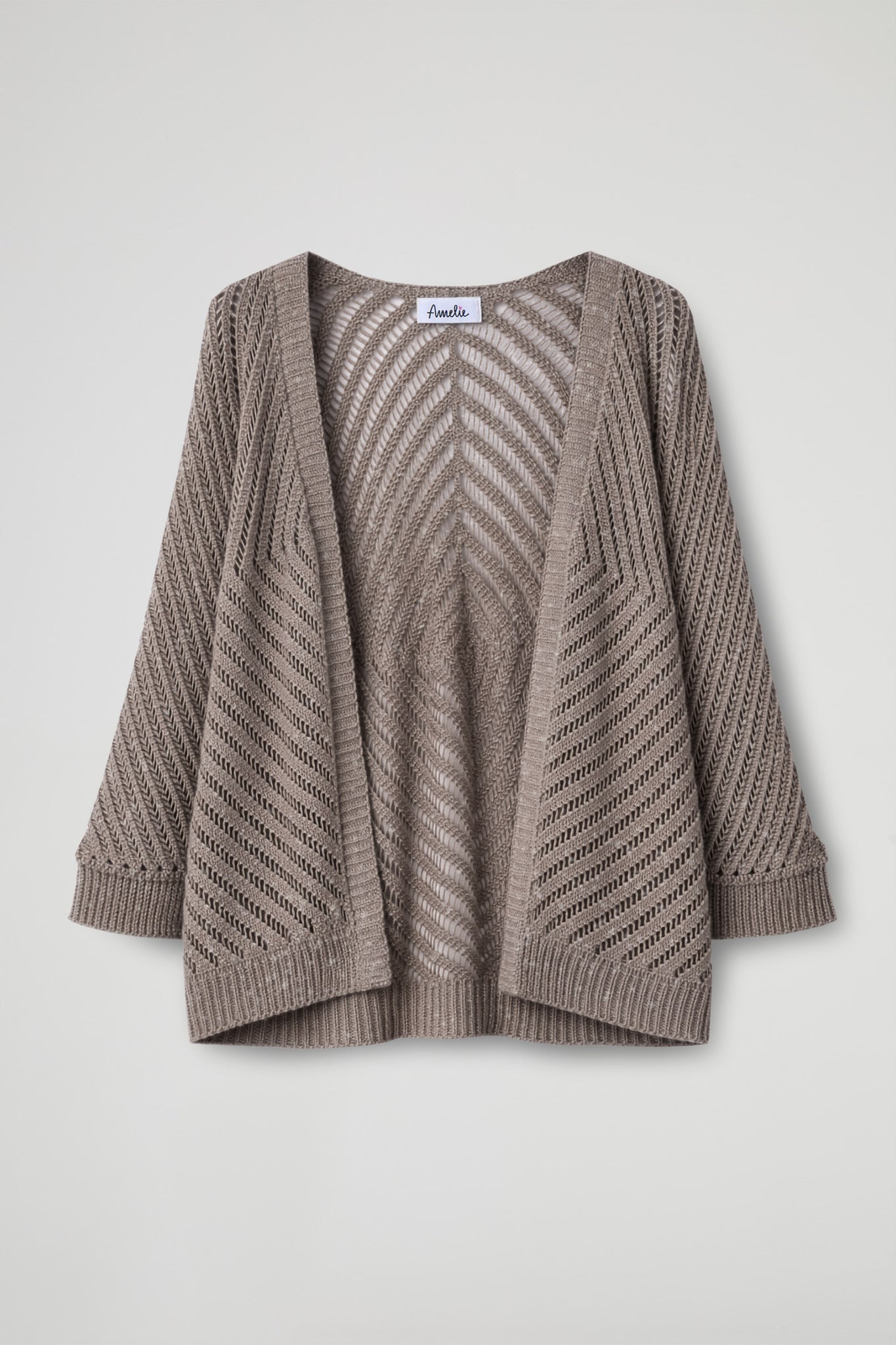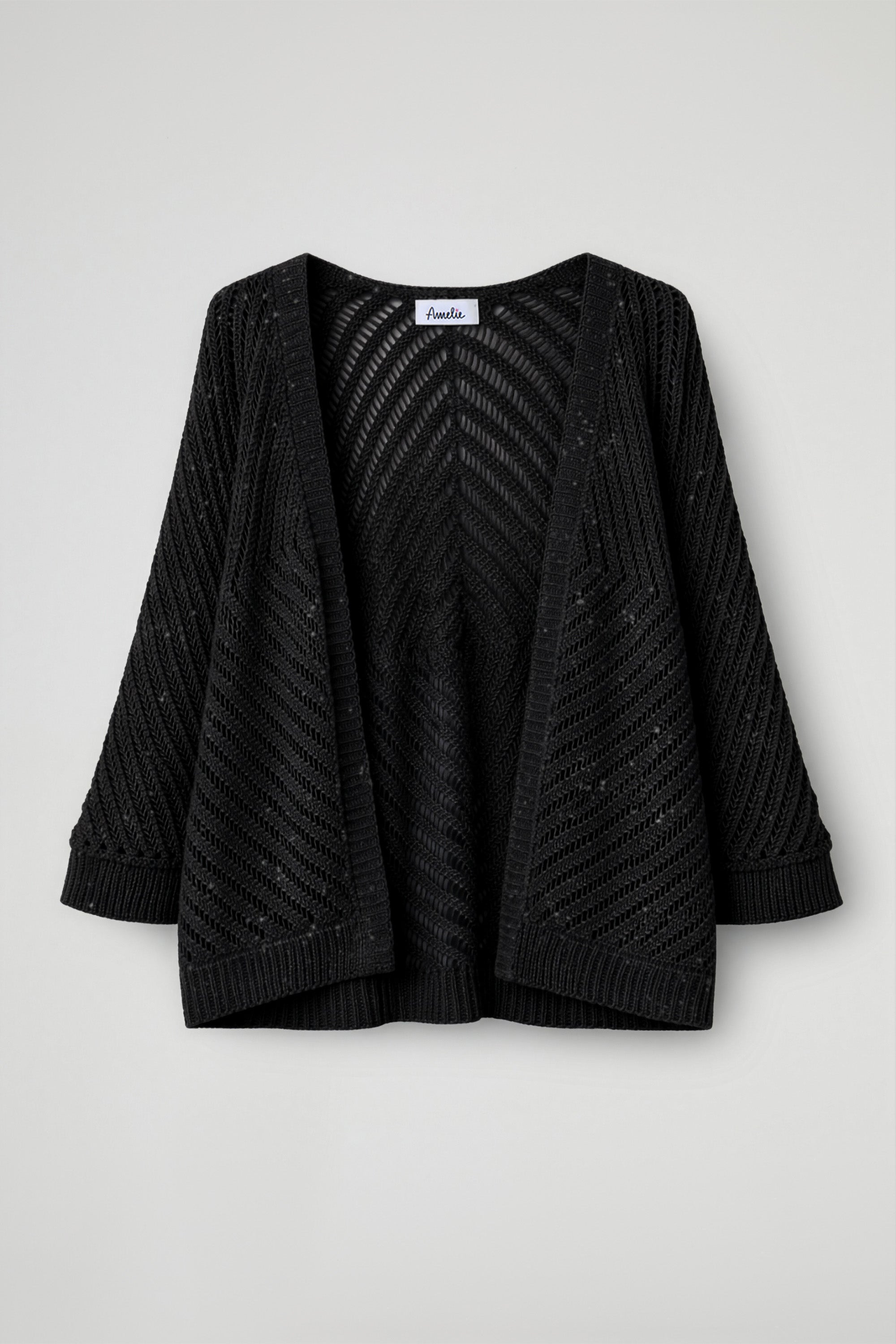 Cardigan aperto dal design raffinato e leggero, traforato e con motivo geometrico che crea un effetto trasparente; realizzato in filato lurex che dona una delicata luminosità.
