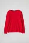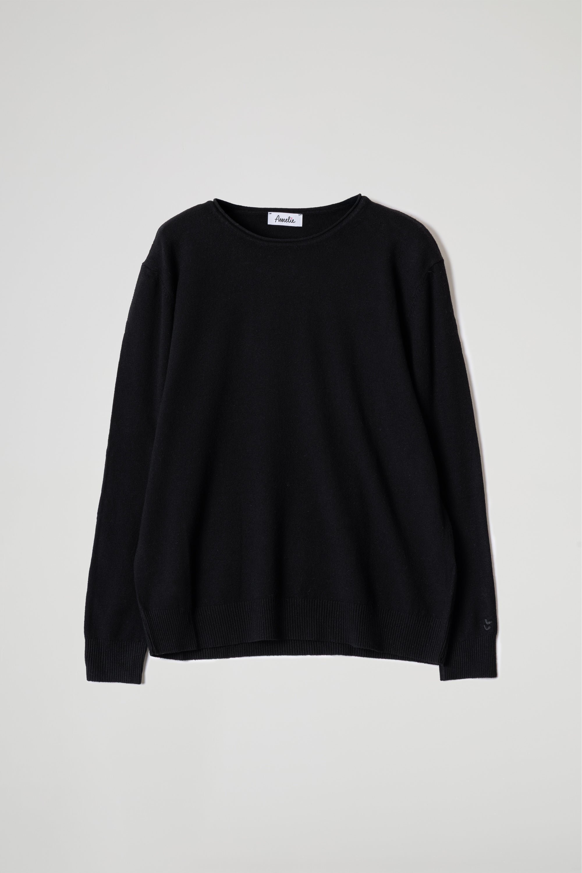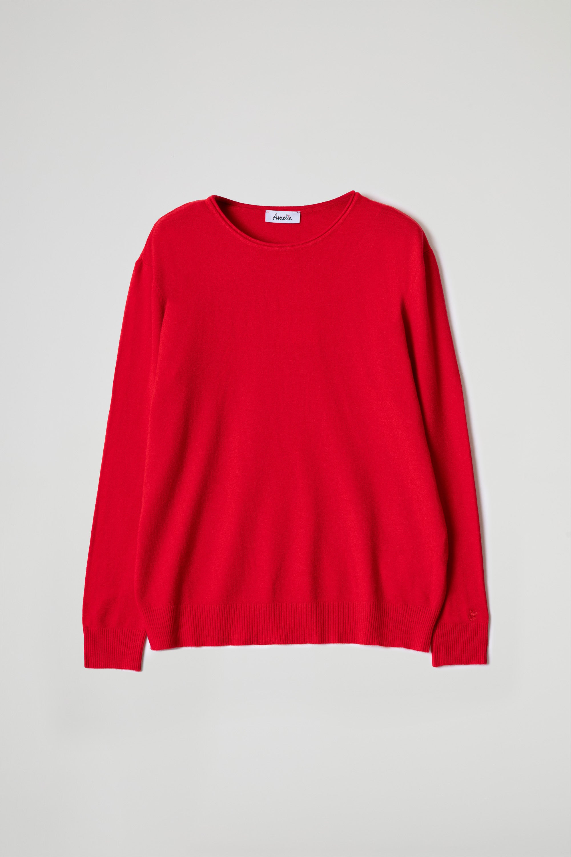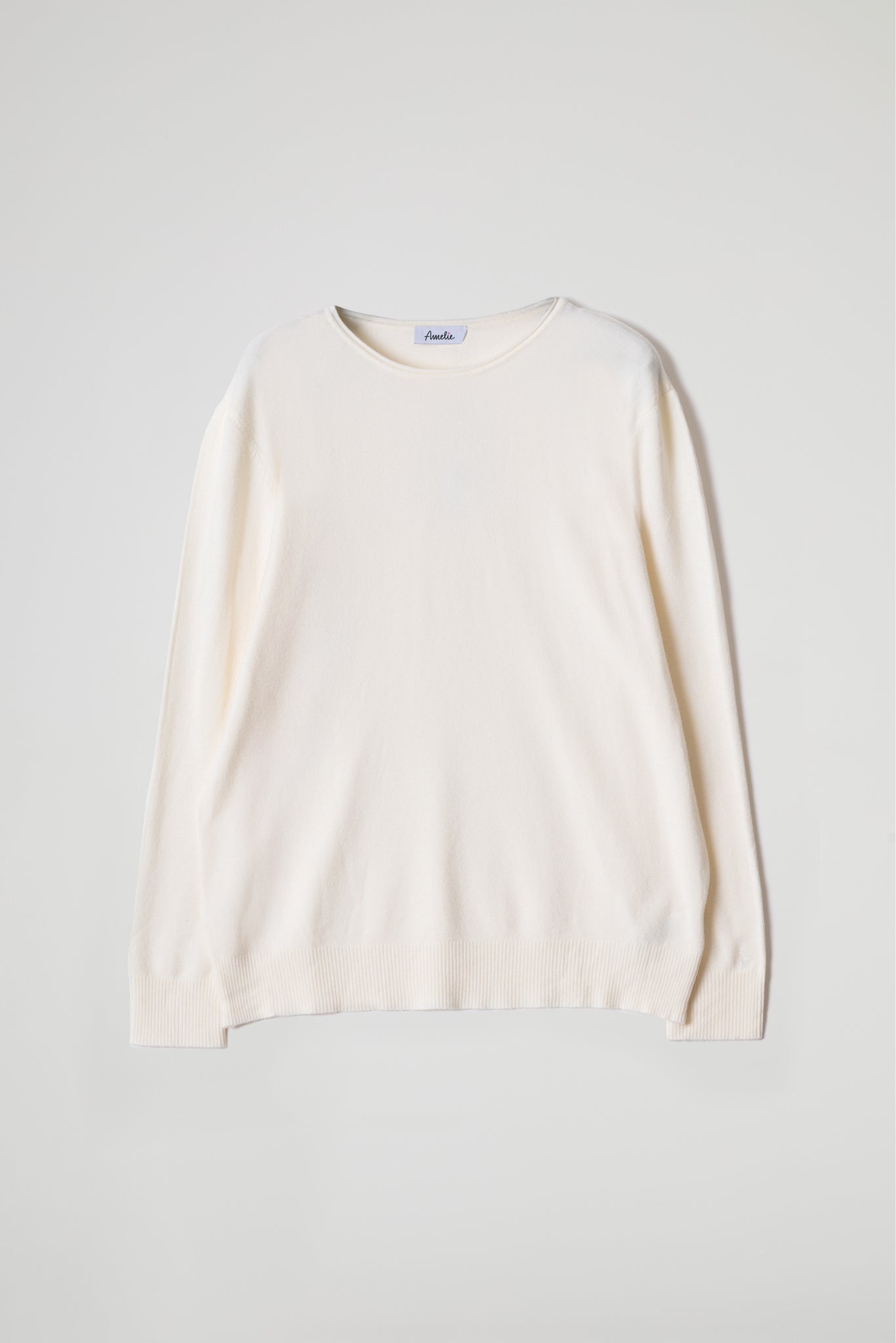 Maglia in viscosa leggermente asimmetrica, scollo tondo con dettaglio a taglio vivo, spalla scesa, manica lunga con polsino alto a costine elasticizzate, fondo stondato con orlo alto a costine. Linea morbida