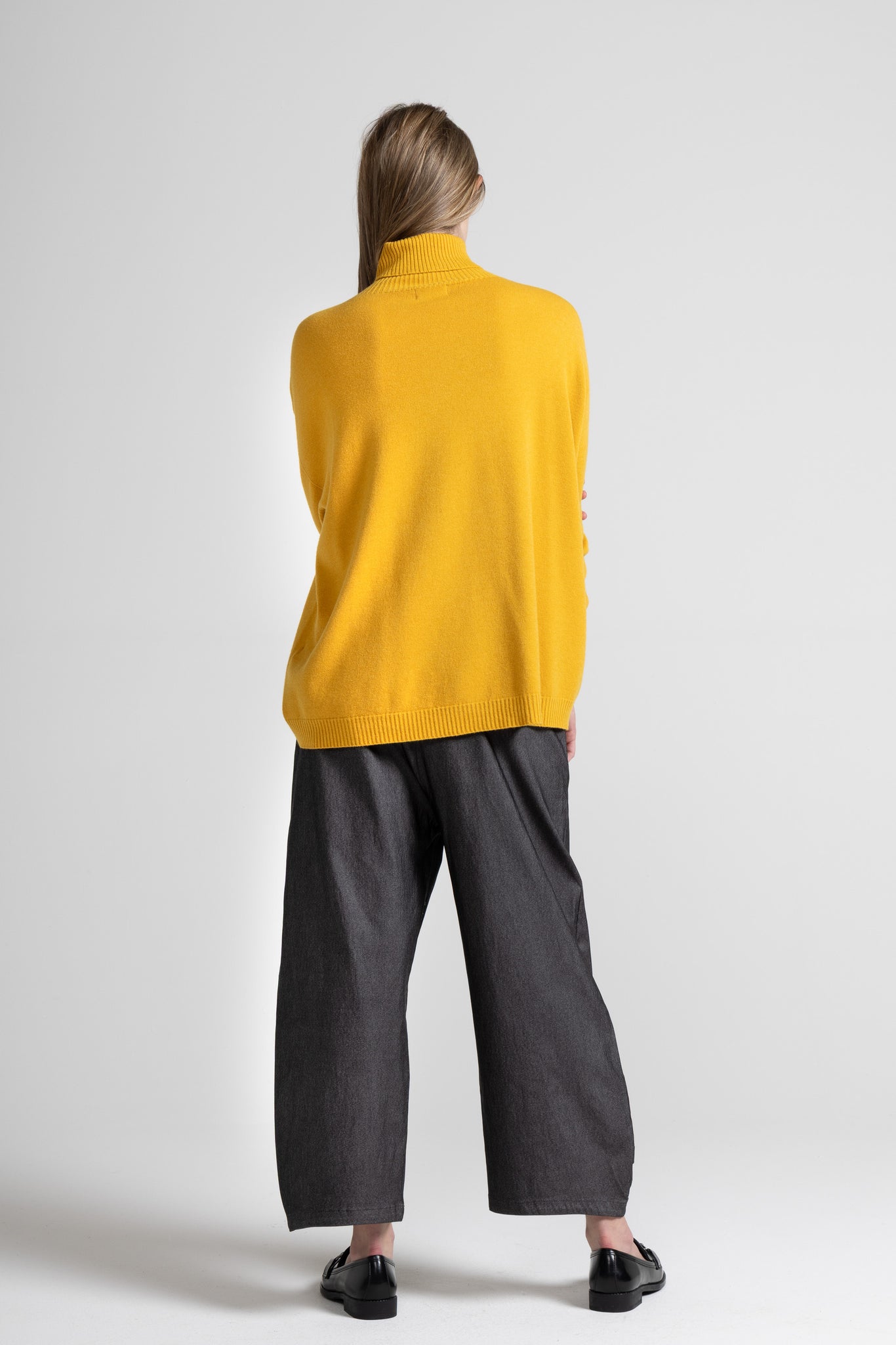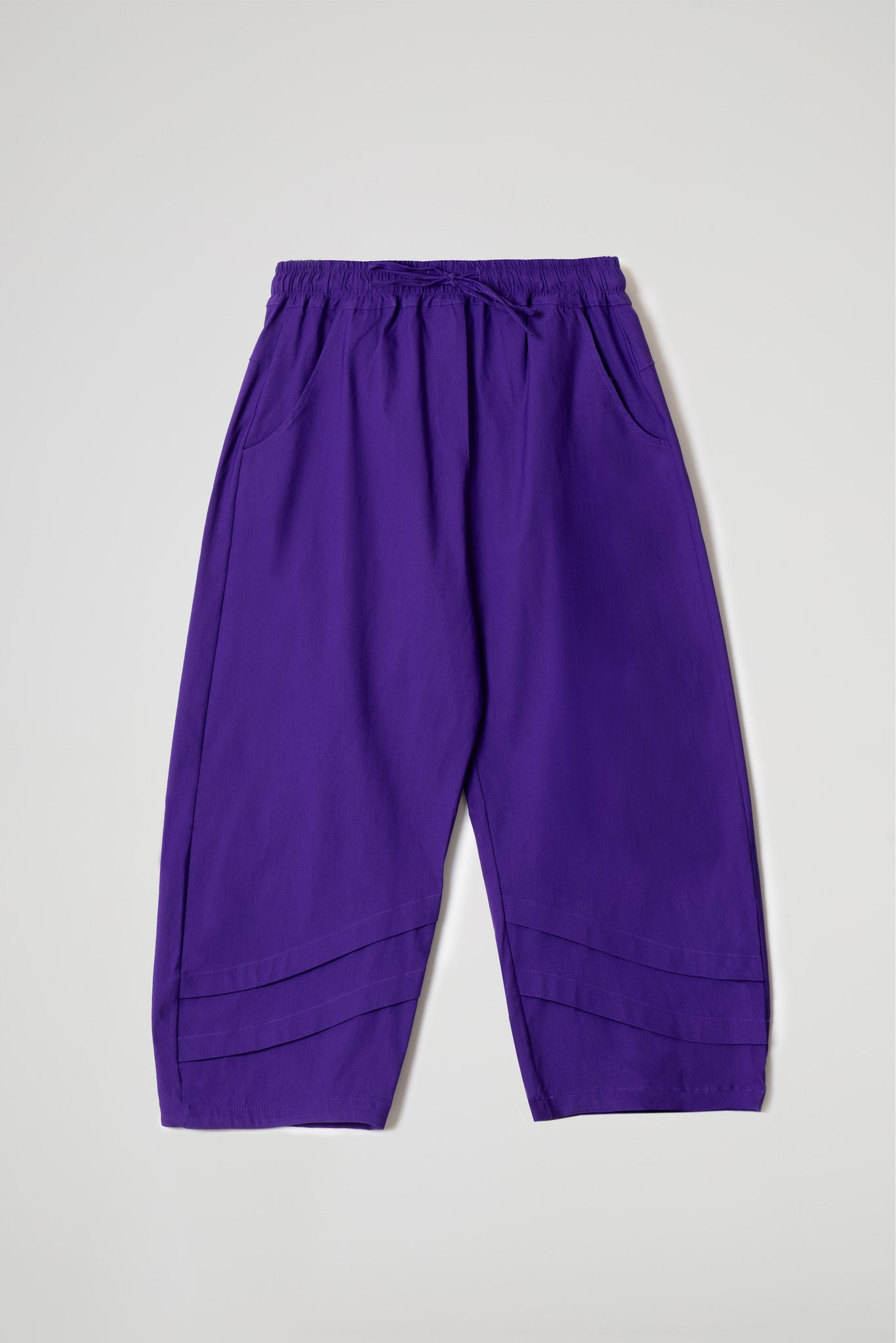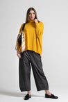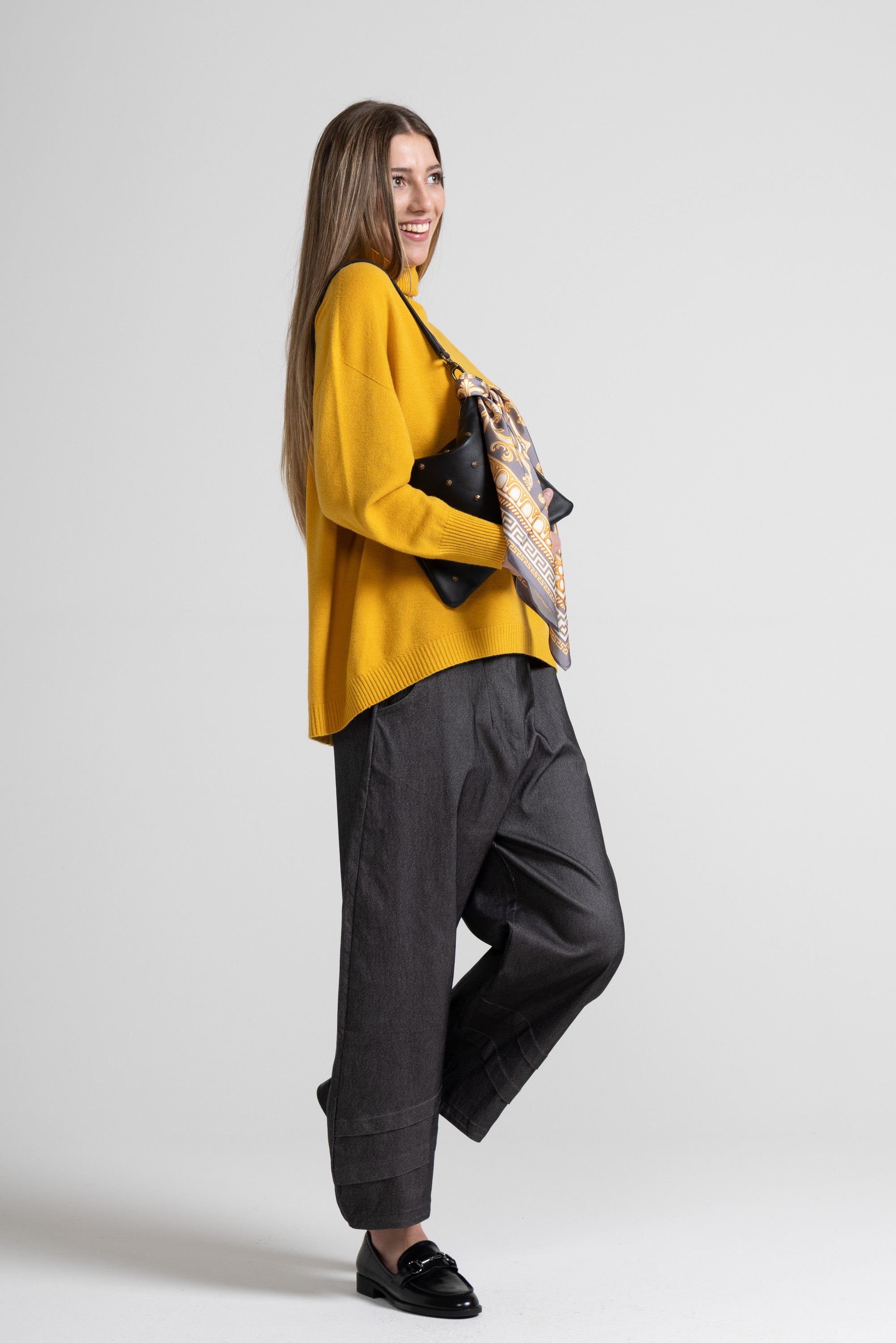 PANTALONE BAGGY IN TESSUTO BENGALINA DI VISCOSA ELASTICIZZATA, TASCHE SAGOMATE, TAGLIO CARRE RIBATTUTO SU RETRO, DETTAGLIO PIEGHE SU FONDO GAMBA.
