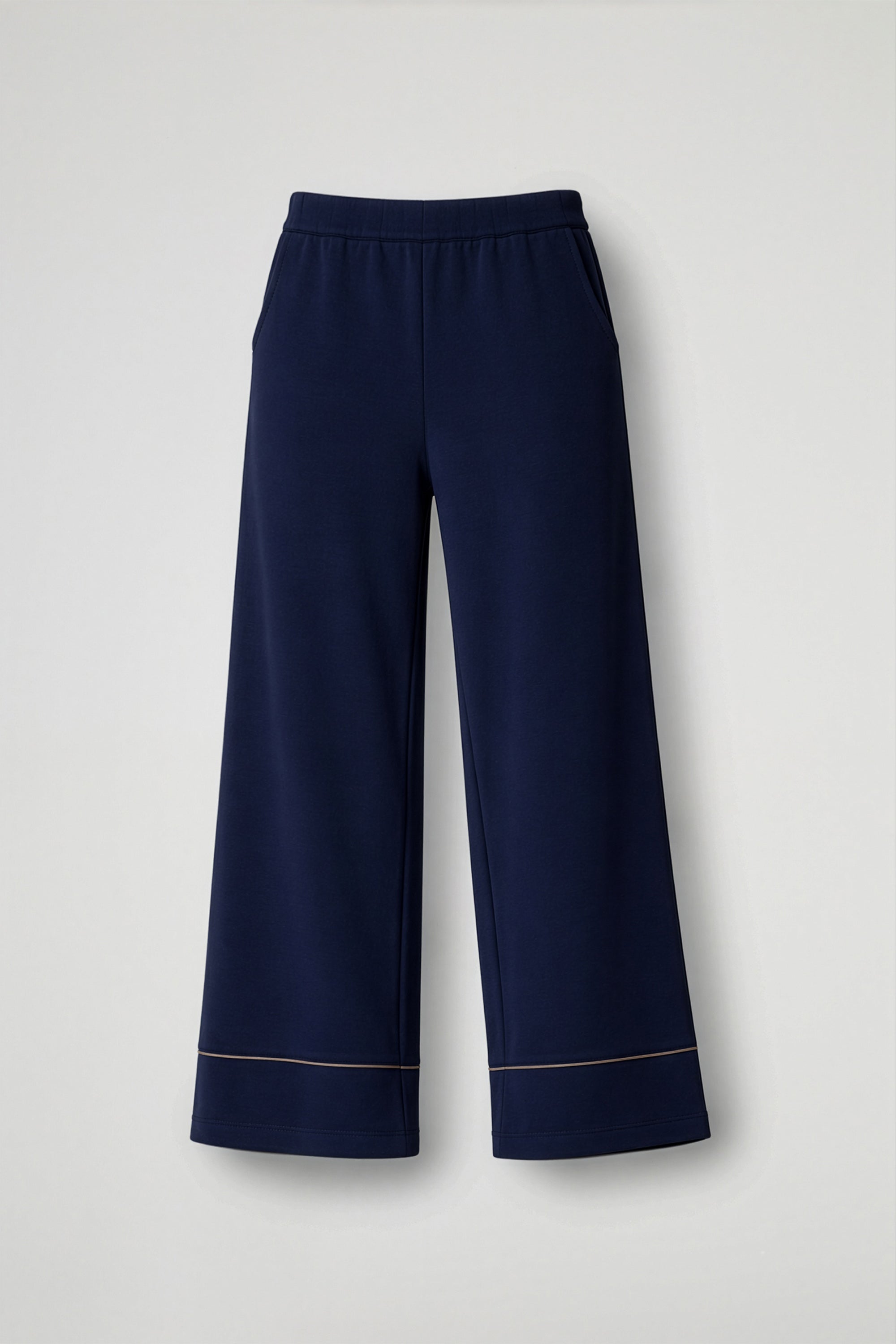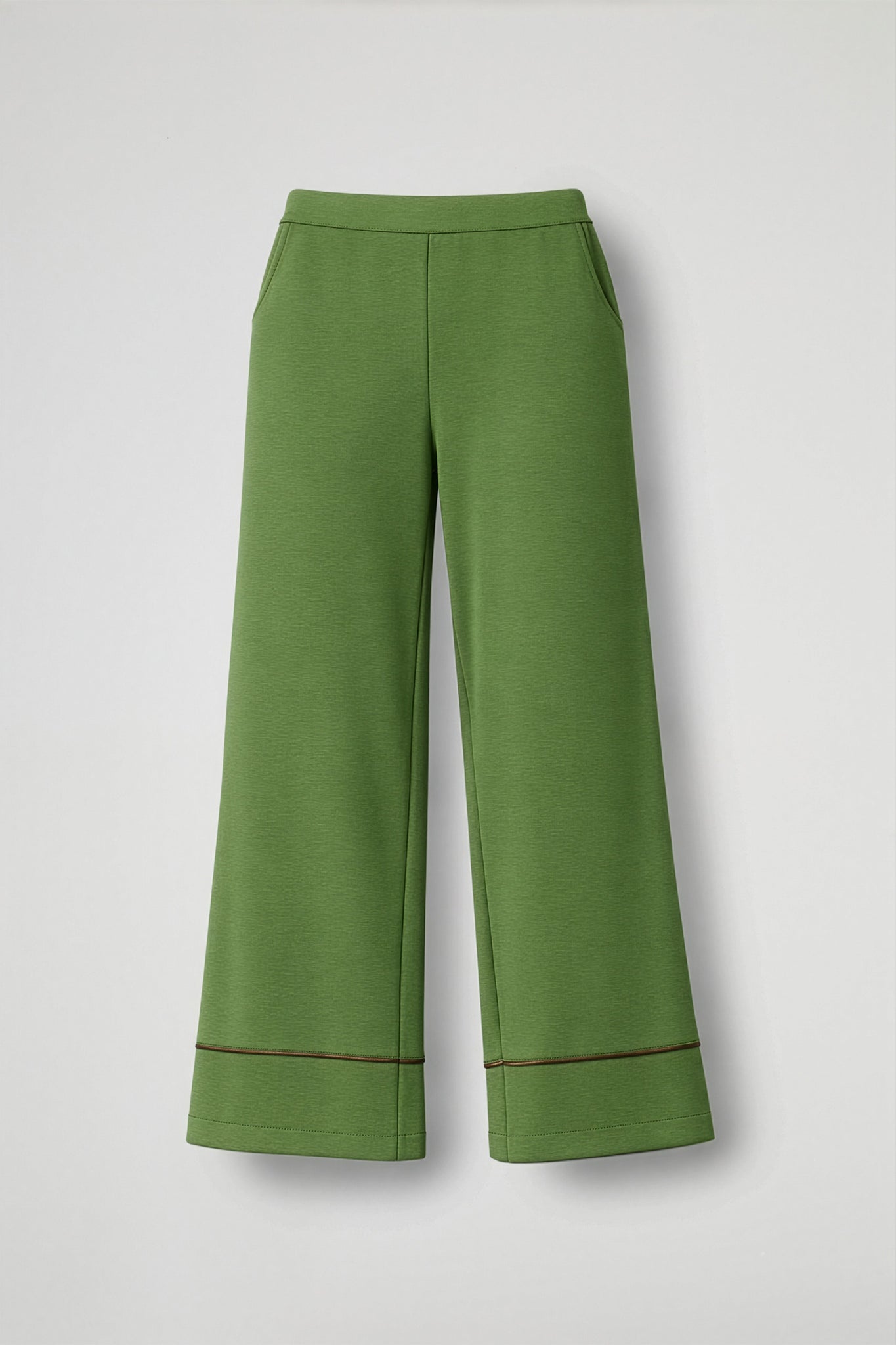 Pantalone in tessuto di viscosa, elastico in vita, tasche all'americana leggermente stondate, gamba ampia e dritta, dettaglio bordatura orizzontale a contrasto sul fondo. Linea morbida.