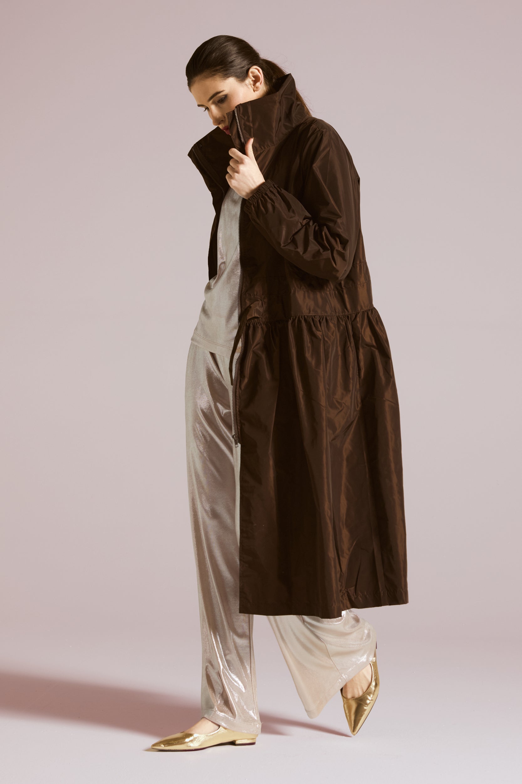 Pantaloni a palazzo, fascia elastica in vita, tasche a filo, gamba ampia, orlo ribattuto sul fondo. Linea morbida.