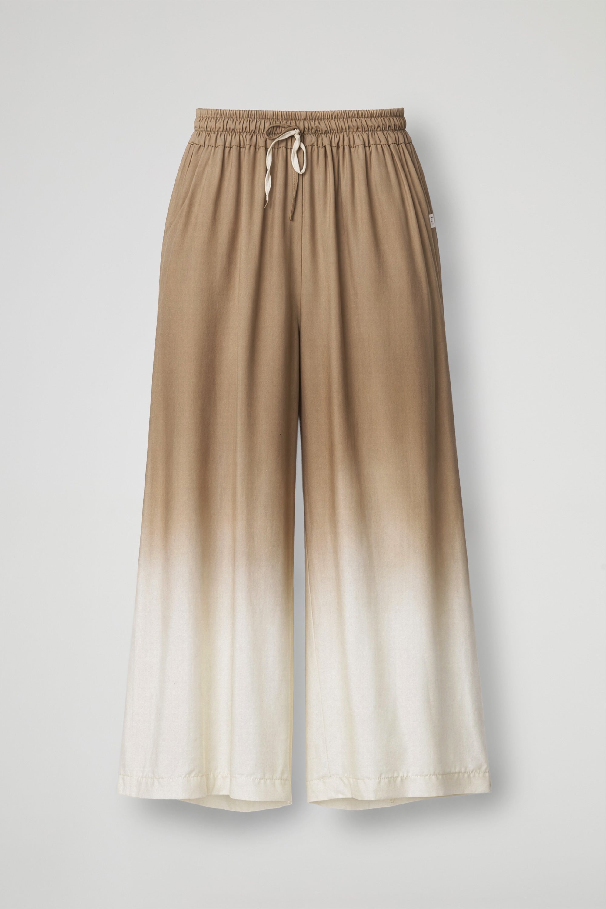 Pantaloni a palazzo, pensati per un look rilassato ma curato. La vita arricciata elasticizzata si adatta facilmente, mentre la coulisse permette di regolare la vestibilità. La gamba molto ampia valorizza la silhouette e accompagna il movimento, mentre la sfumatura dégradé dona un tocco originale e luminoso.