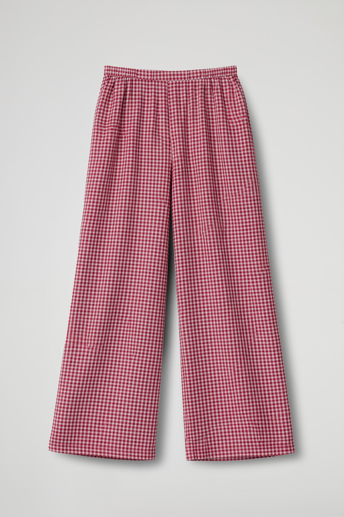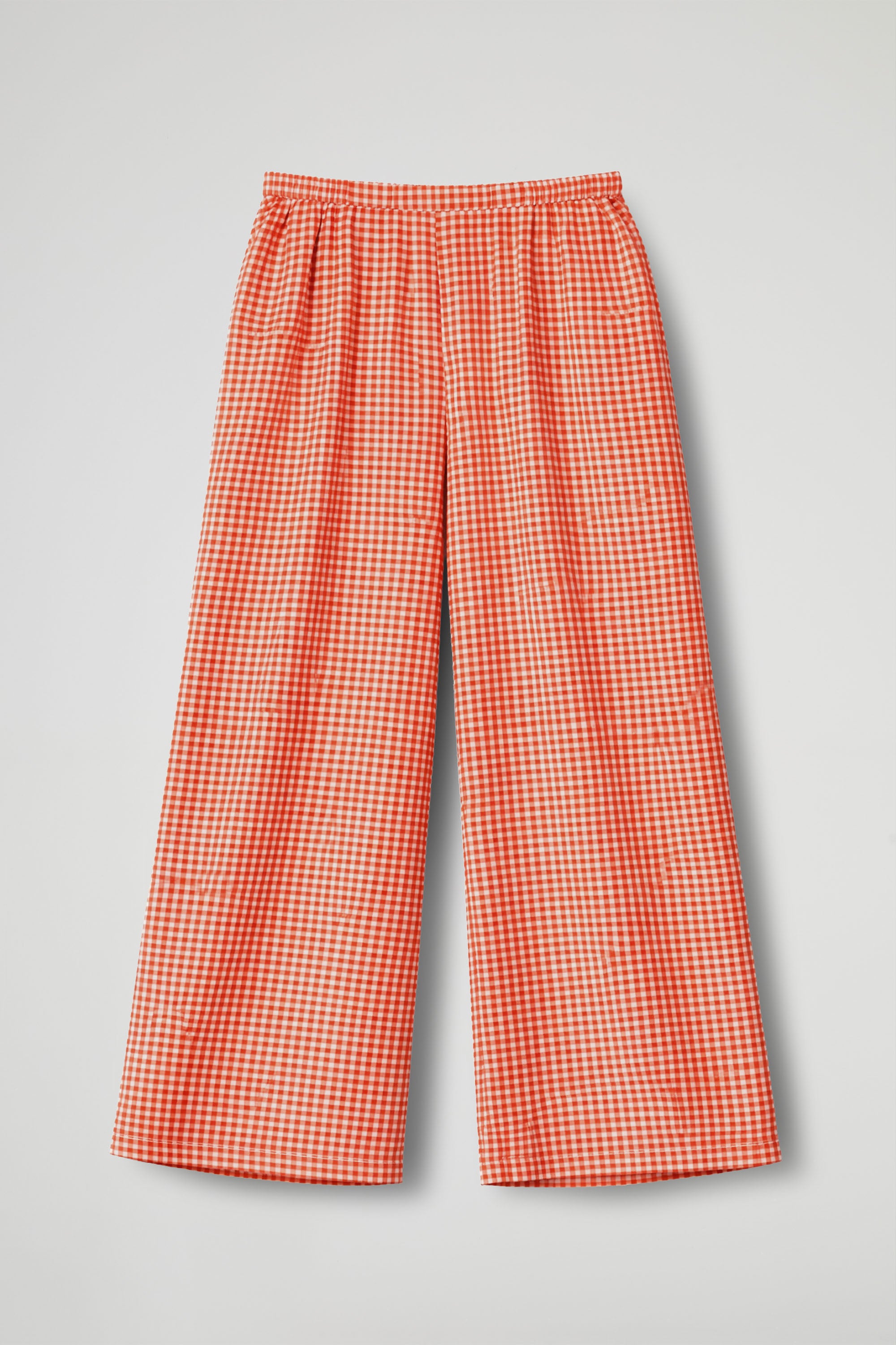 Pantalone dalla linea morbida con una linea morbida e fluida, la gamba ampia scende dritta dalla vita fino al fondo, creando un effetto elegante e slanciato che dona movimento ad ogni passo. La fantasia Vichy, caratterizzata da piccoli quadretti regolari conferisce al pantalone un aspetto vivace, leggermente rétro e molto estivo.