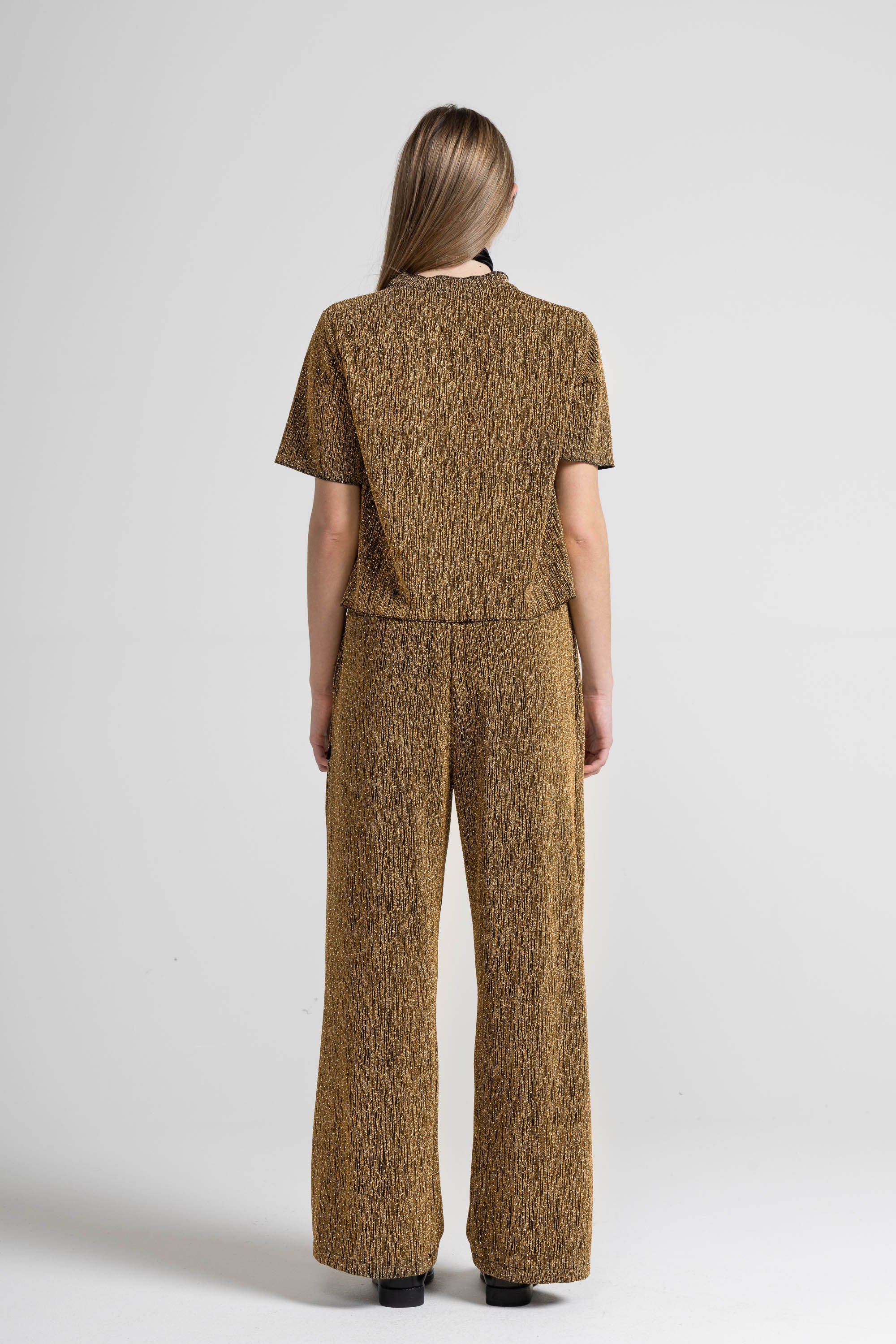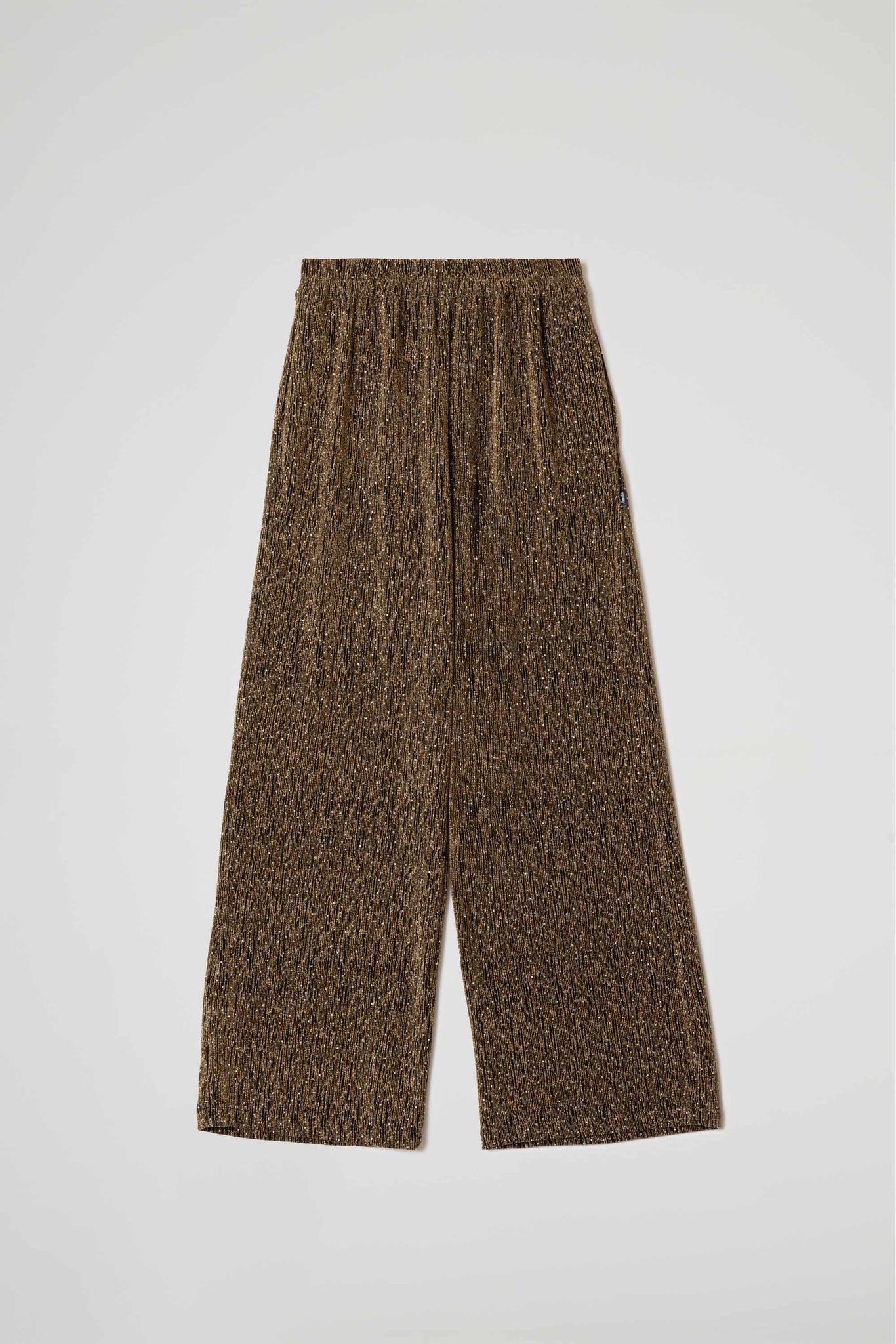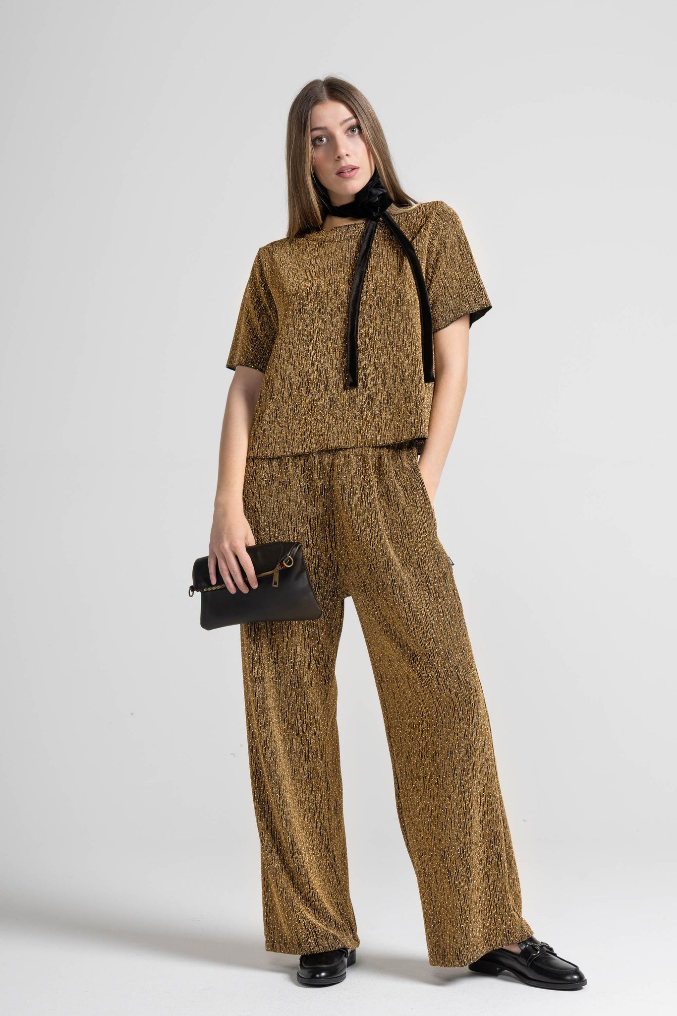 Pantalone a palazzo in lurex, un capo femminile e contemporaneo, ideale da indossare con il suo top coordinato per un outfit total glam o con un capo basico per un contrasto luminoso e di carattere.
