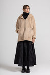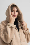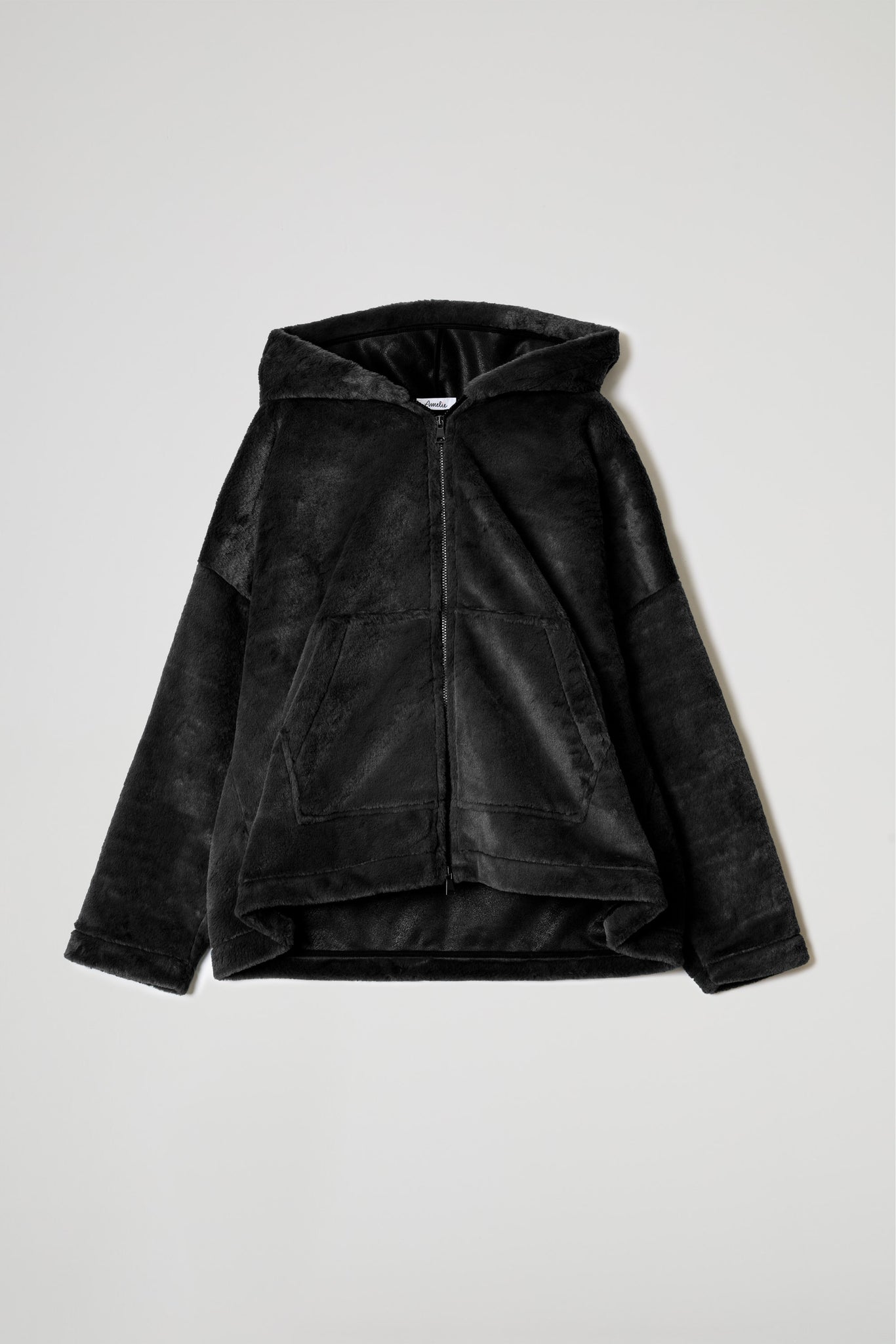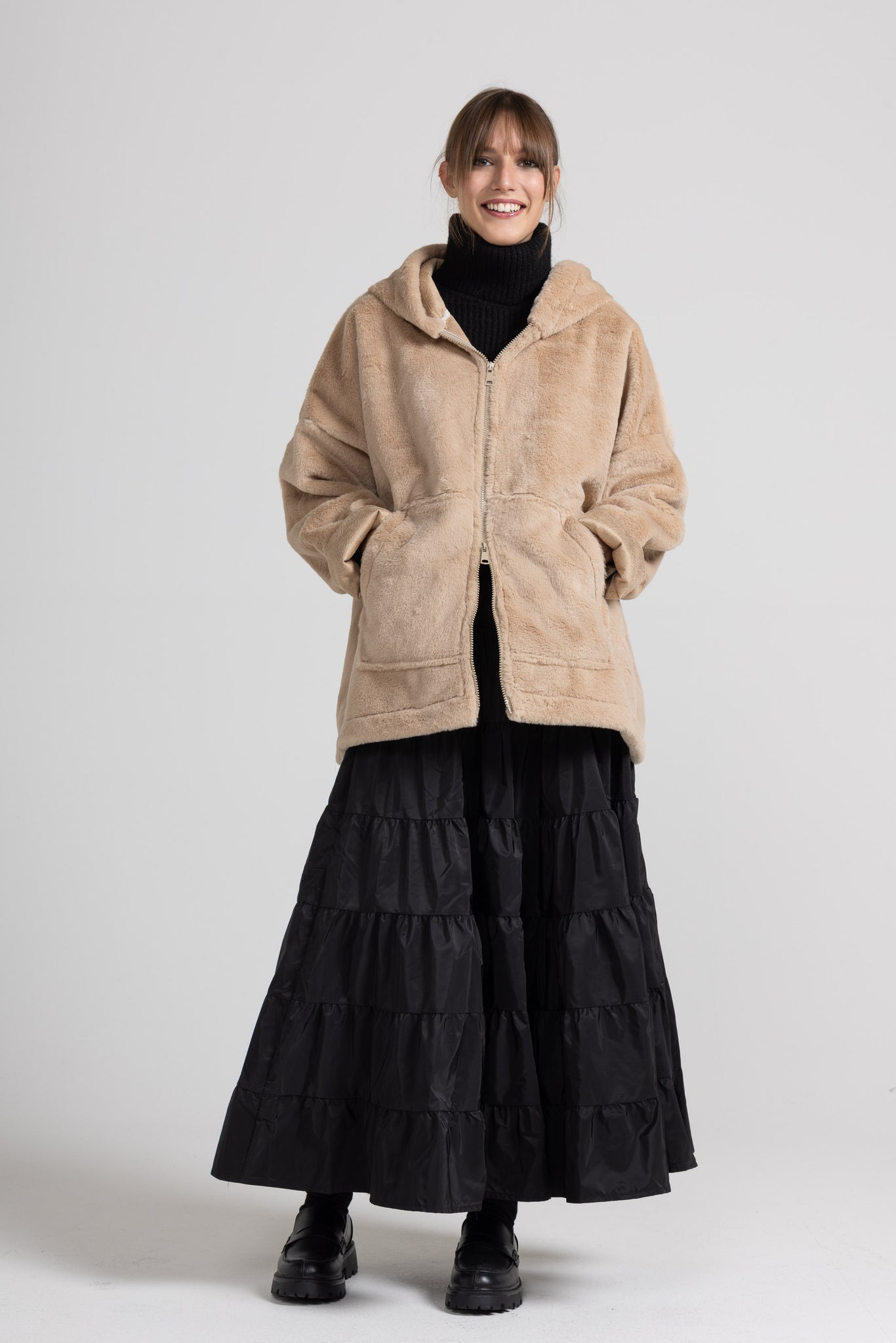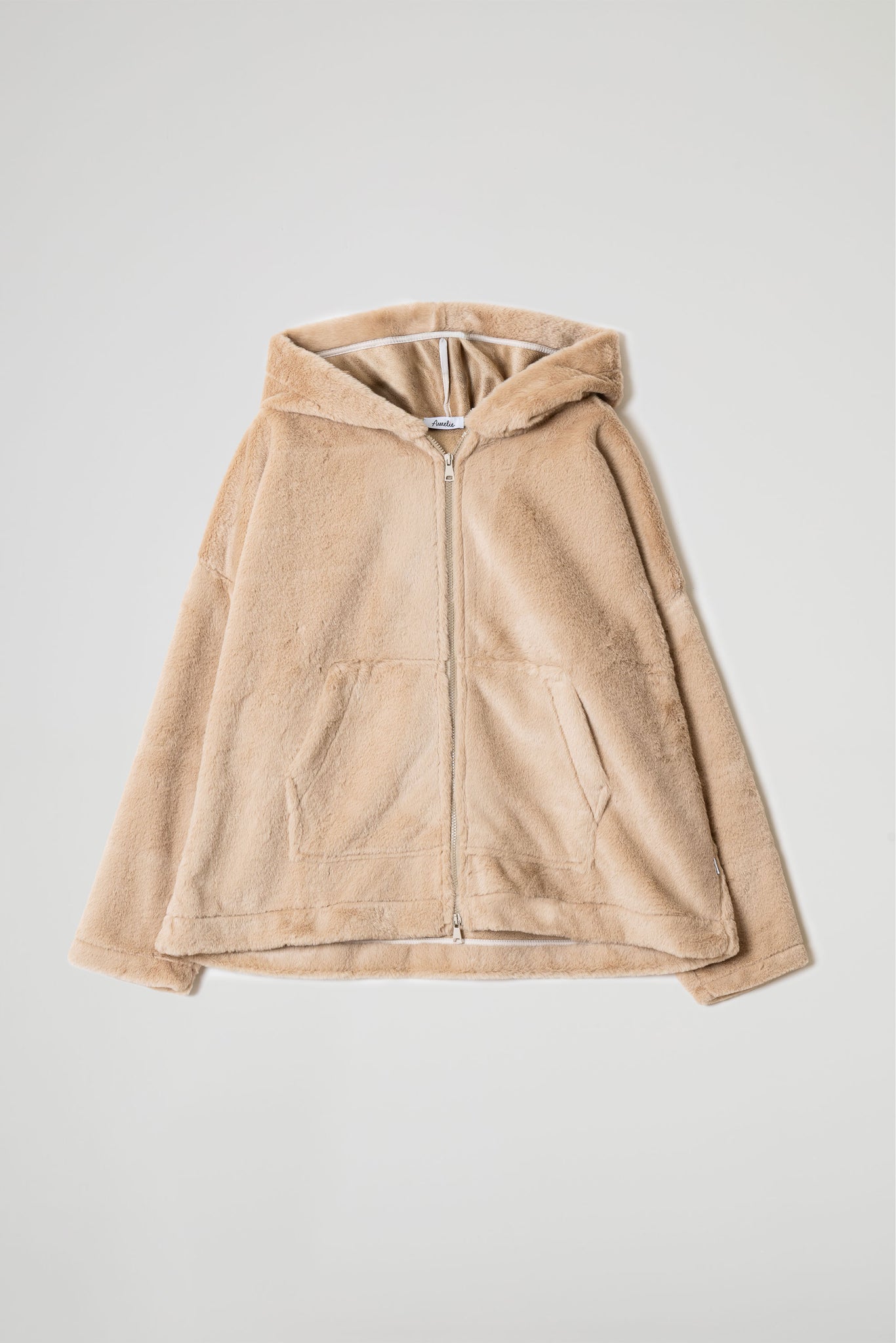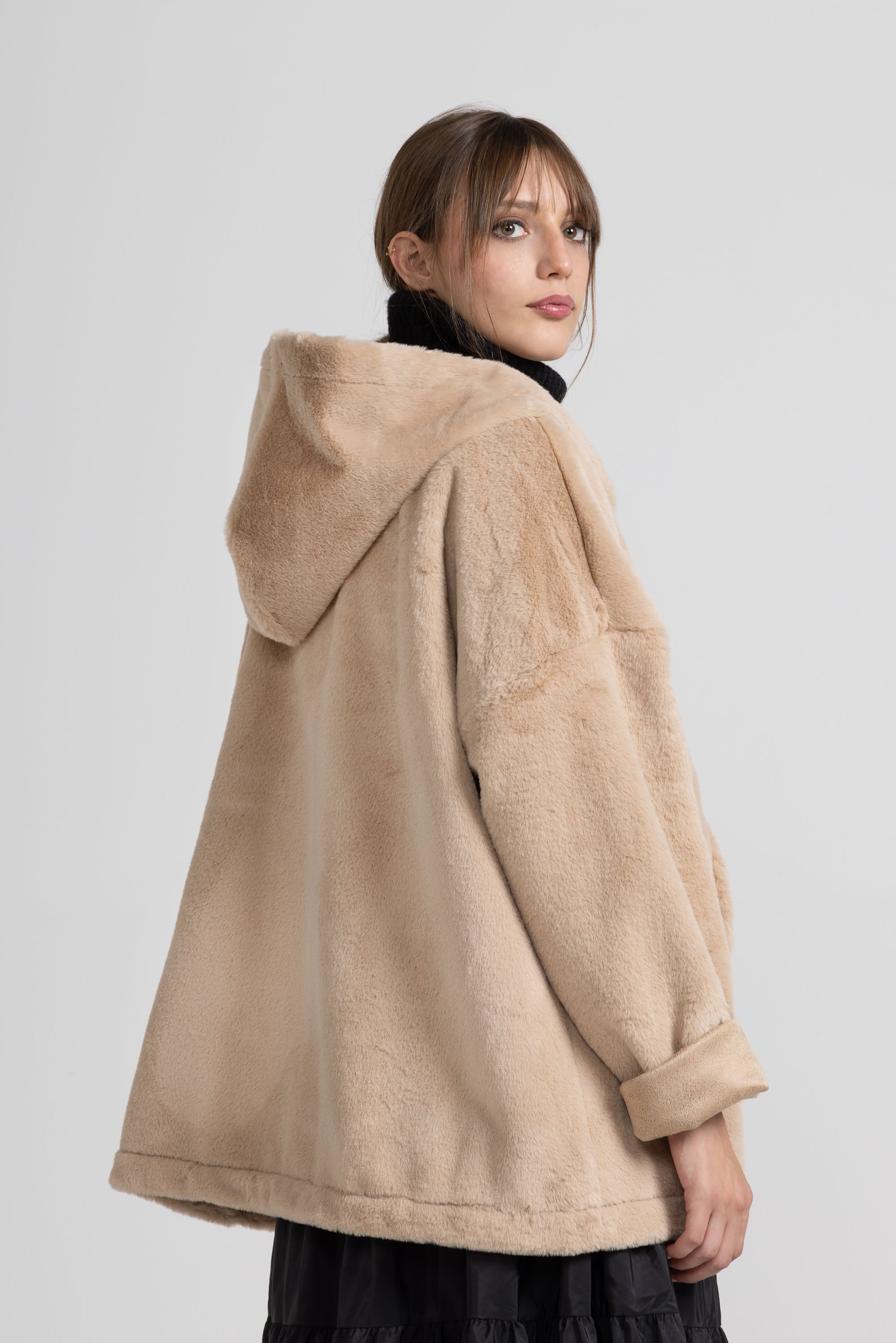 Giacca leggermente asimmetrica realizzata in morbida pelliccia sintetica effetto velluto ,linea oversize che garantisce comfort e libertà di movimento, ideale per look casual o urban chic.
