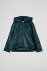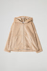 Cappuccio ampio e fisso, spalle scese, manica lunga, chiusura frontale con zip a doppio cursore, due tasche applicate con apertura diagonale rinforzata, orlo leggermente stondato.