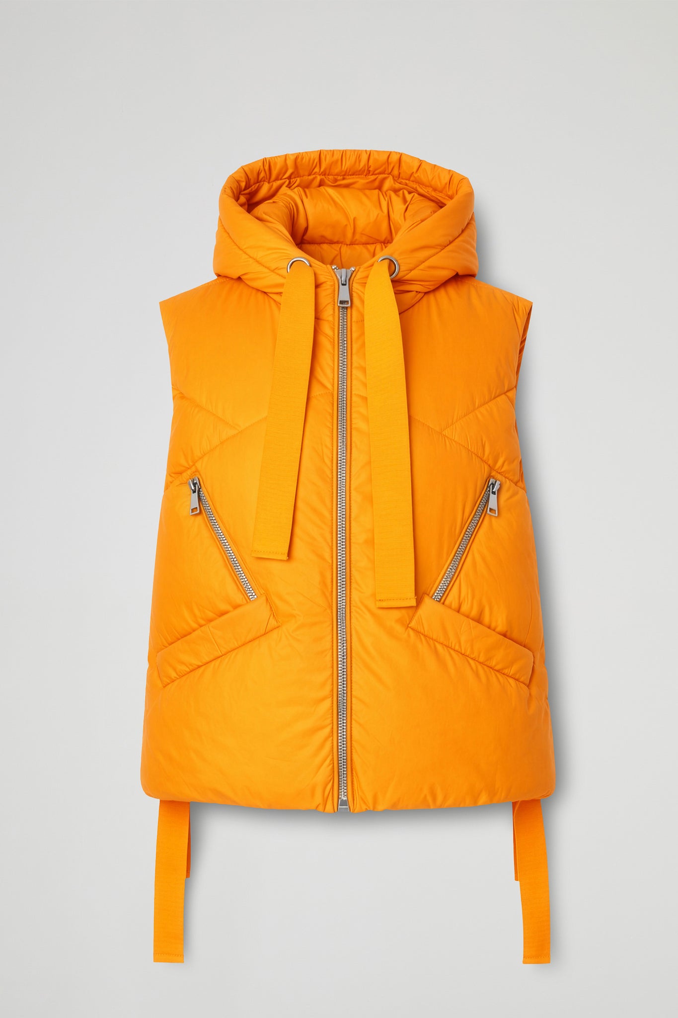 Gilet imbottito dal carattere deciso, dal cappuccio avvolgente e dai maxi nastri in tono che  aggiungono un twist super fashion al capo. La trapuntatura geometrica disegna la silhouette e dona volume in modo leggero e contemporaneo. Pratico e curato nei dettagli, grazie alla zip frontale, alle tasche laterali e alla tasca con zip diagonale sul davanti.