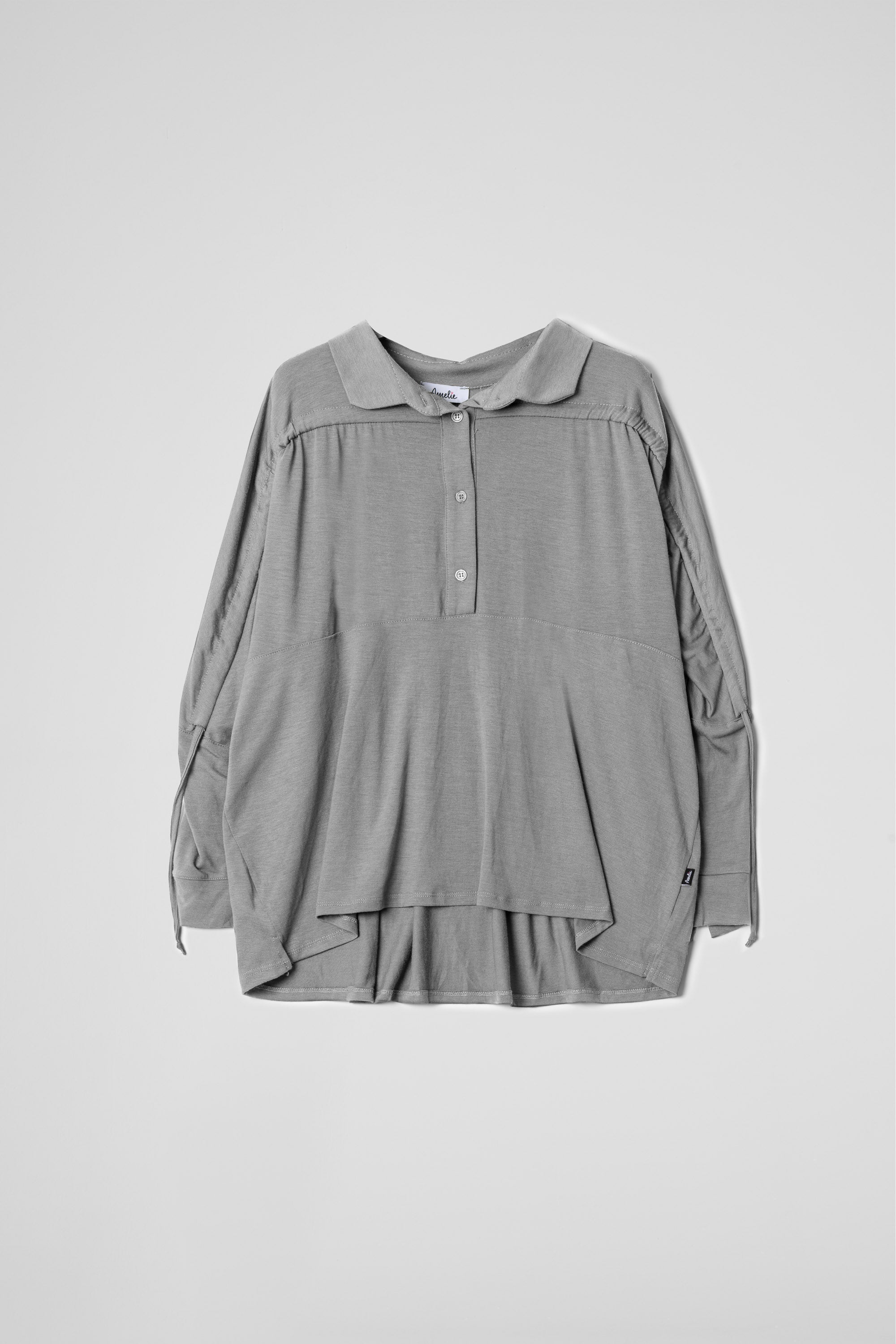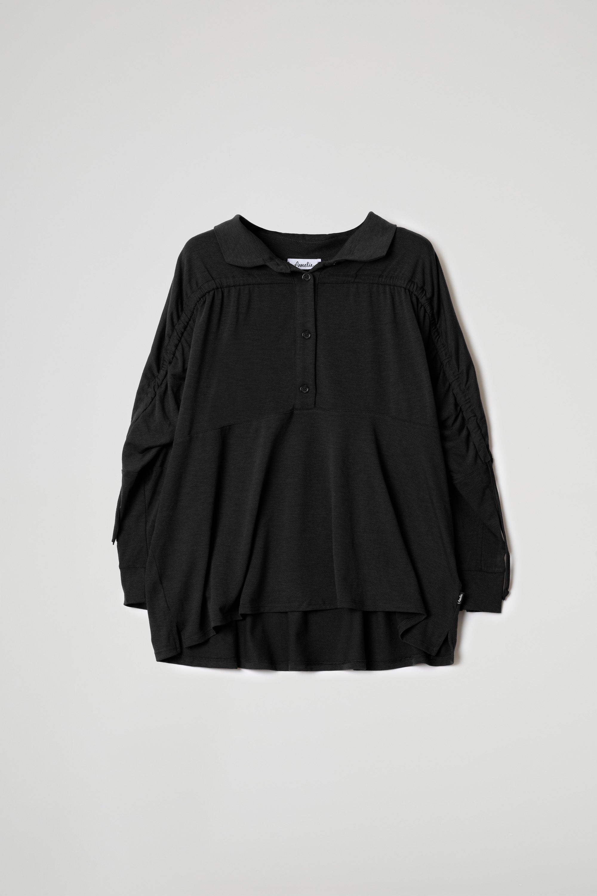 Blusa asimmetrica in morbida viscosa, colletto dal taglio moderno, aperta a metà sul davanti con bottoni, manica lunga con fondo ribattuto alto, dettaglio coulisse regolabile che parte dal collo e scorre lungo la spalla fino alla manica, taglio a carrè con piega sul retro. Linea ampia e morbida