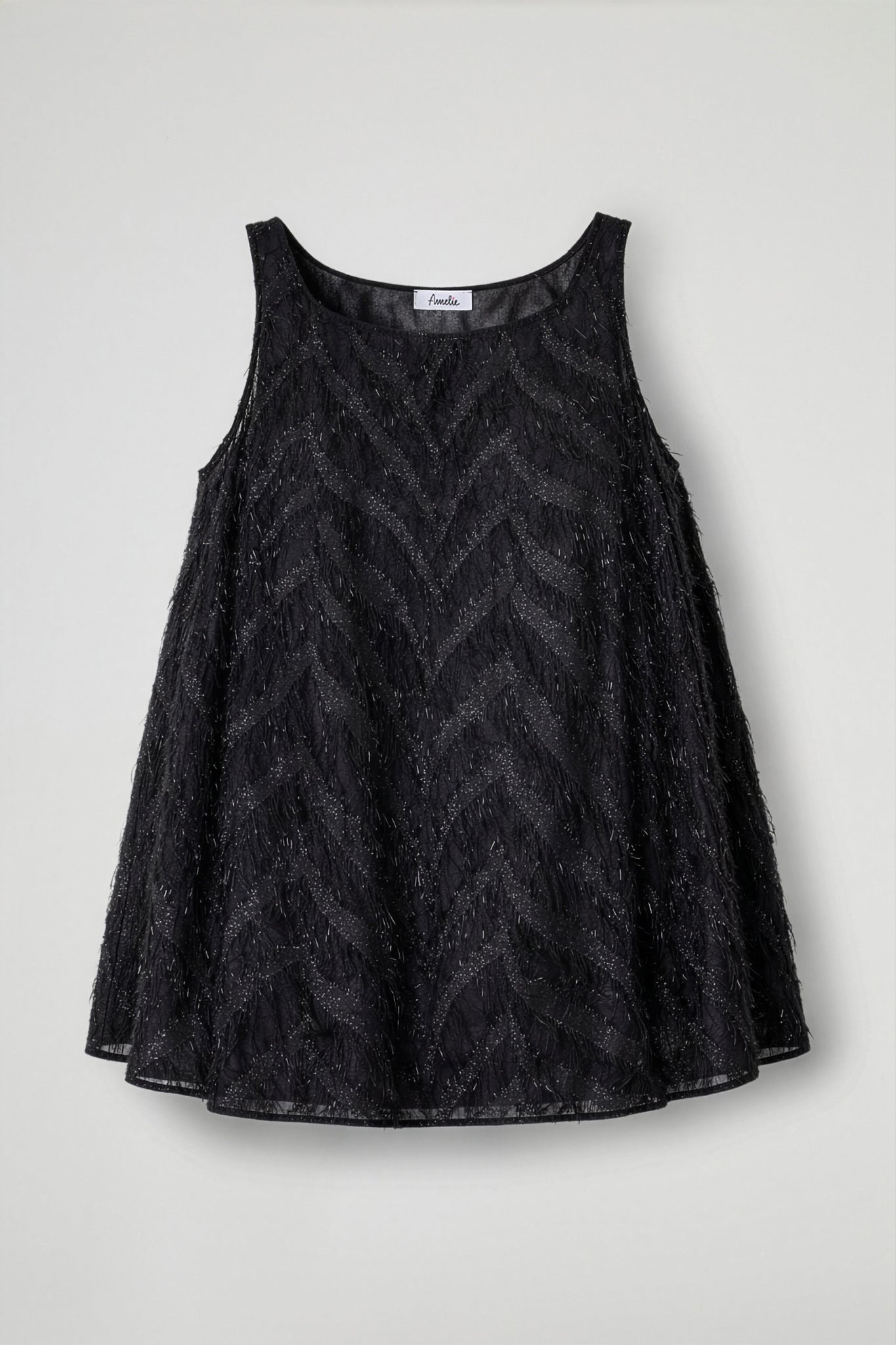 Canotta smanicata in tessuto leggero semi-trasparente, arricchita da una lavorazione di micro-lurex che riflette la luce con discrezione mentre la texture piumage crea profondità e movimento ad ogni passo ; Il design è pensato per essere comodo ma scenografico: scollo tondo pulito, spalline larghe e linea morbida e svasata che scivola sul corpo senza segnare, con un fondo leggermente stondato che accompagna la silhouette.