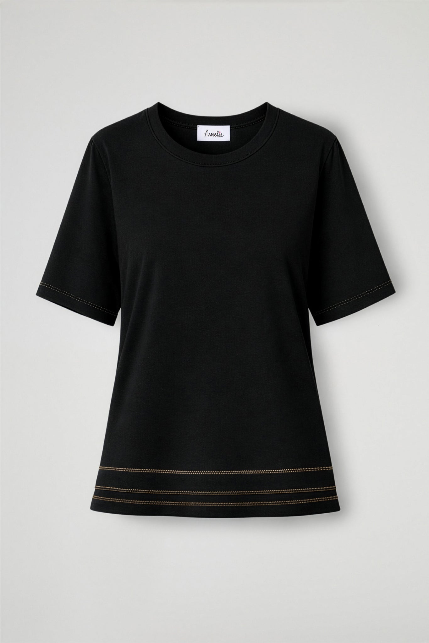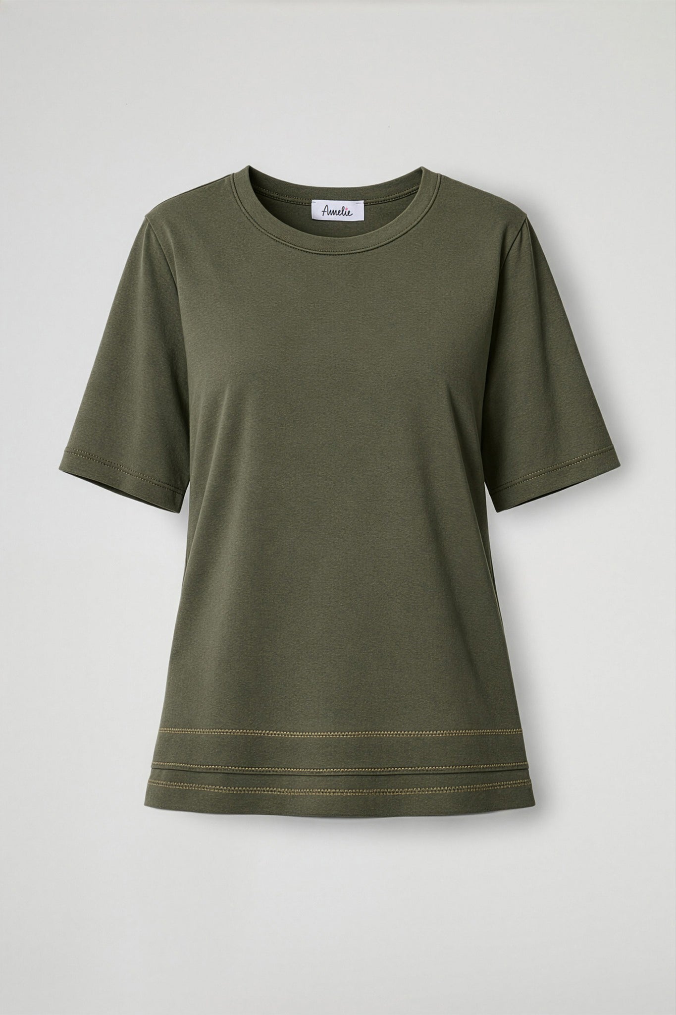 T-shirt in morbida viscosa, collo tondo con bordo ribattuto, manica corta, dettaglio cuciture orizzontali a contrasto sul fondo, orlo ribattuto. Line ampia.
