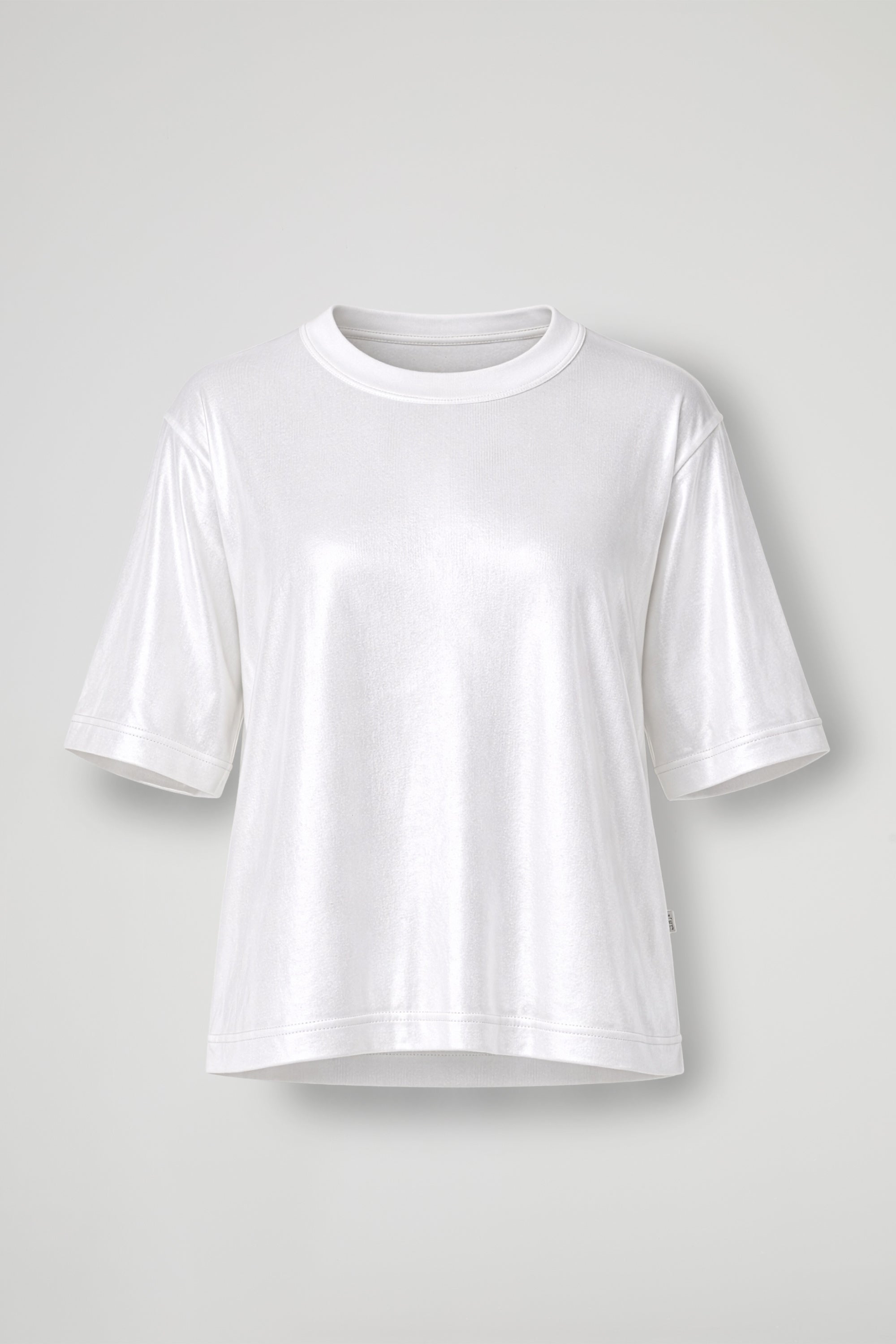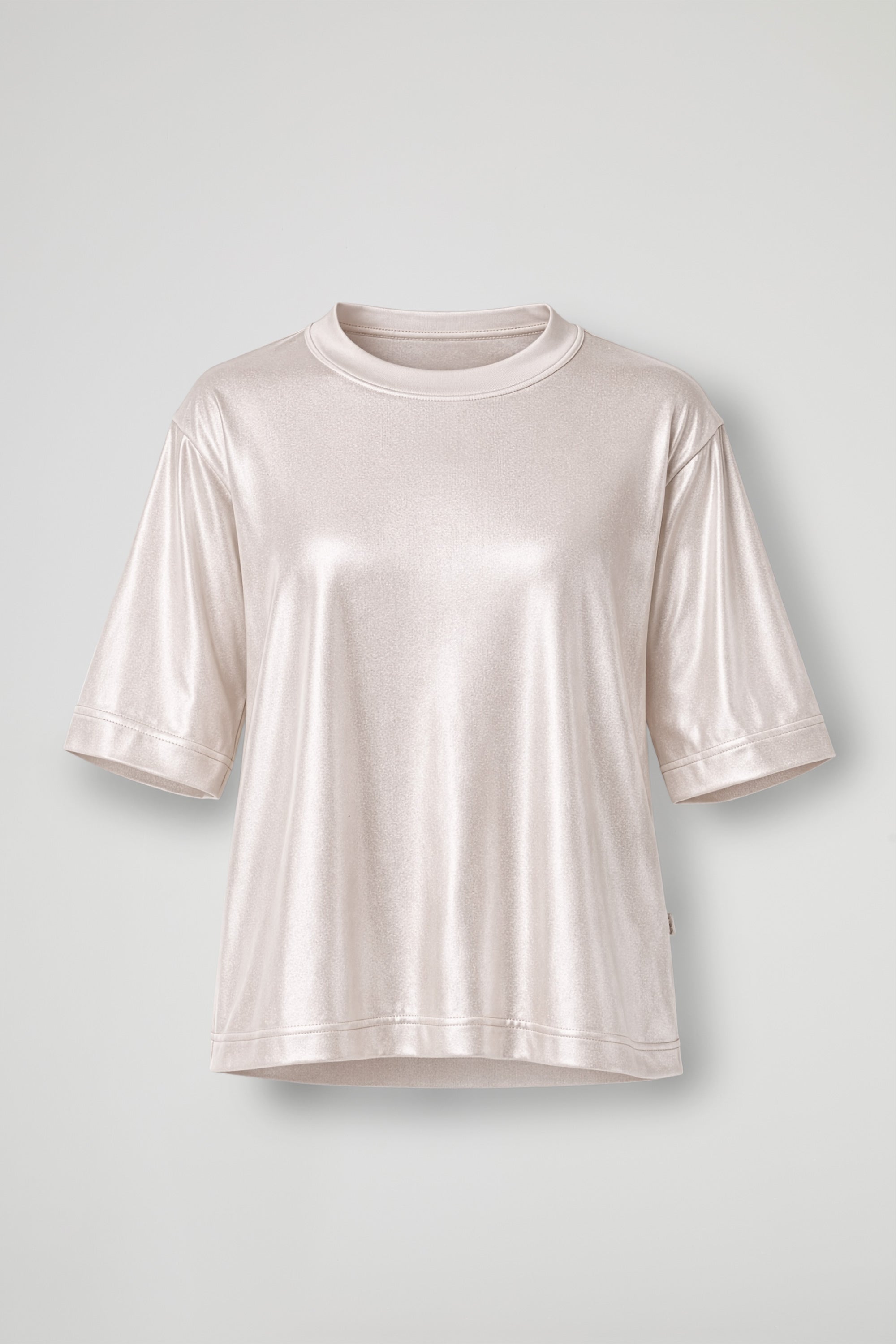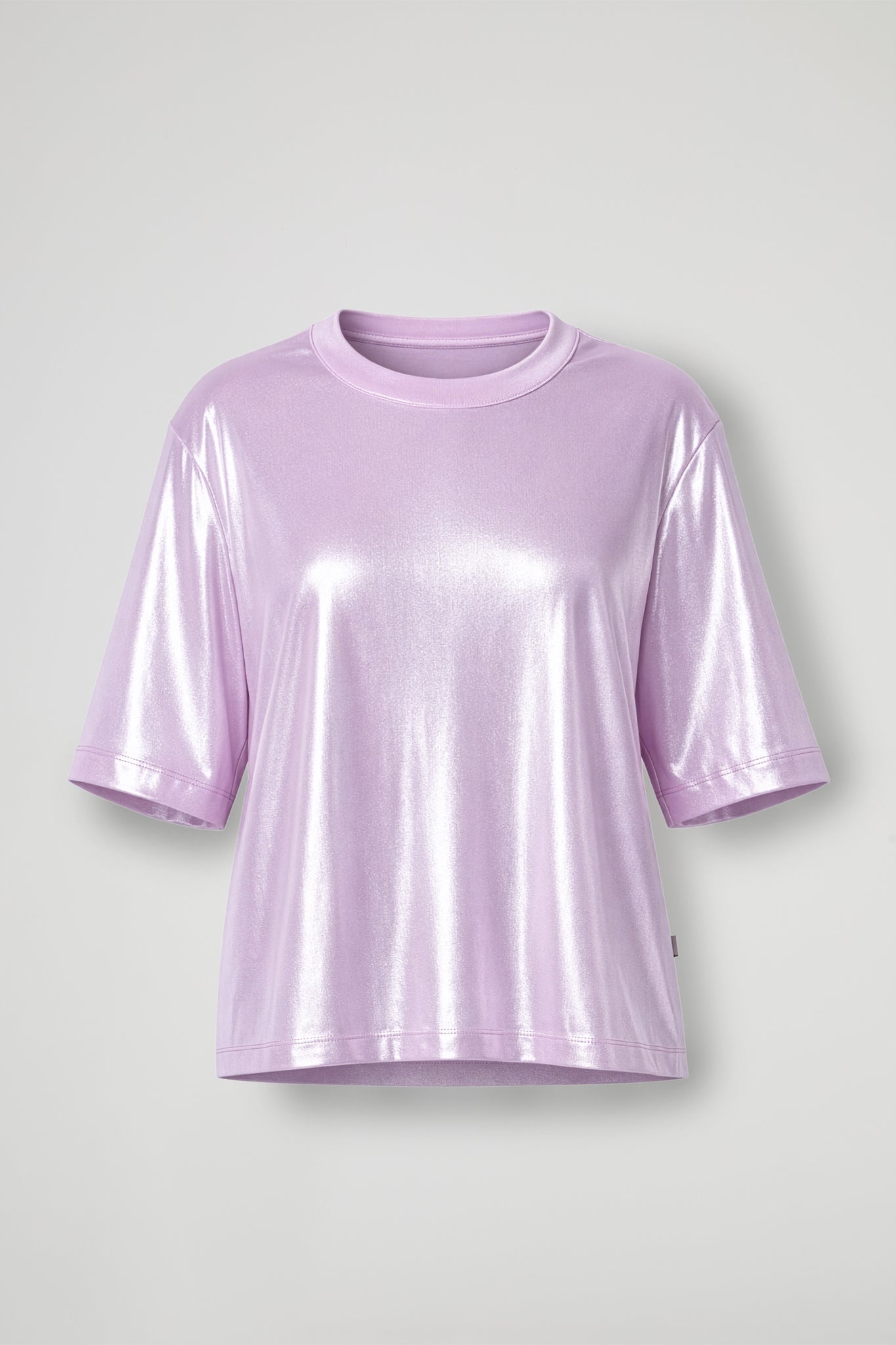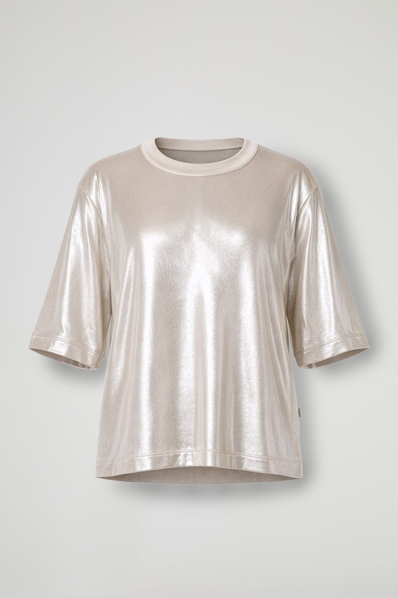 T-Shirt effetto laminato, un tocco glow che illumina subito il look, morbida, comoda e scenografica: linea over, manica ampia e scollo girocollo per un fit easy, mentre la finitura brillante dà carattere anche all’outfit più semplice.